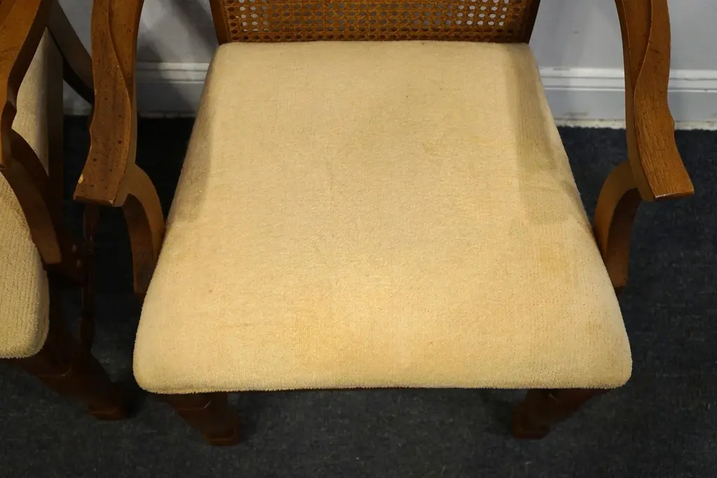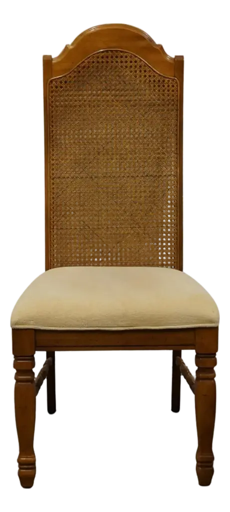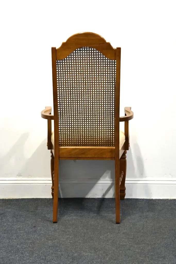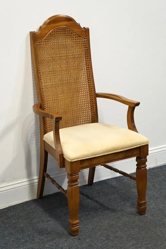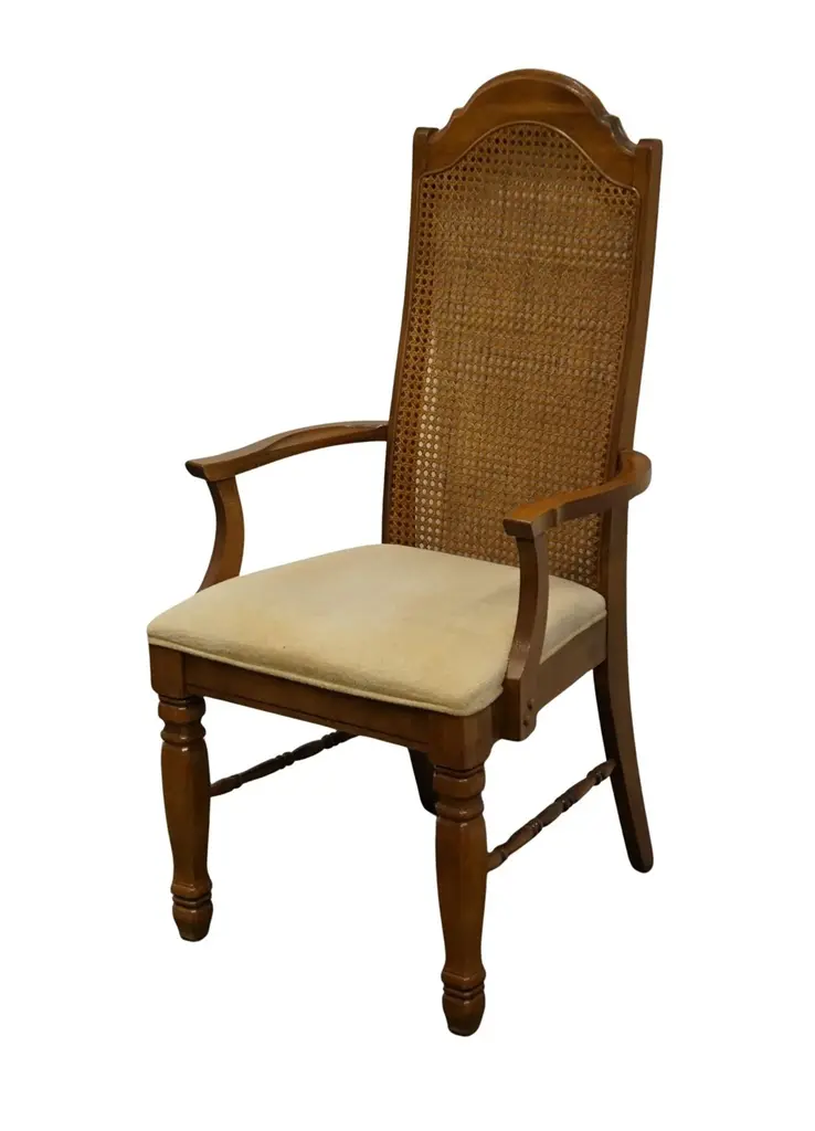 SINGER FURNITURE Solid Pecan Italian Mediterranean Style Cane Back Dining Arm Chair 43.5" High 21.5" Wide 22.5" Deep Seat: 19.5" High Arms: 25.5" High We specialize in high end used furniture that we consider to be at least an 8 on a scale of 1 to 10 regarding condition, unless otherwise noted.