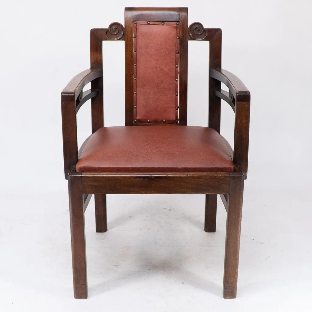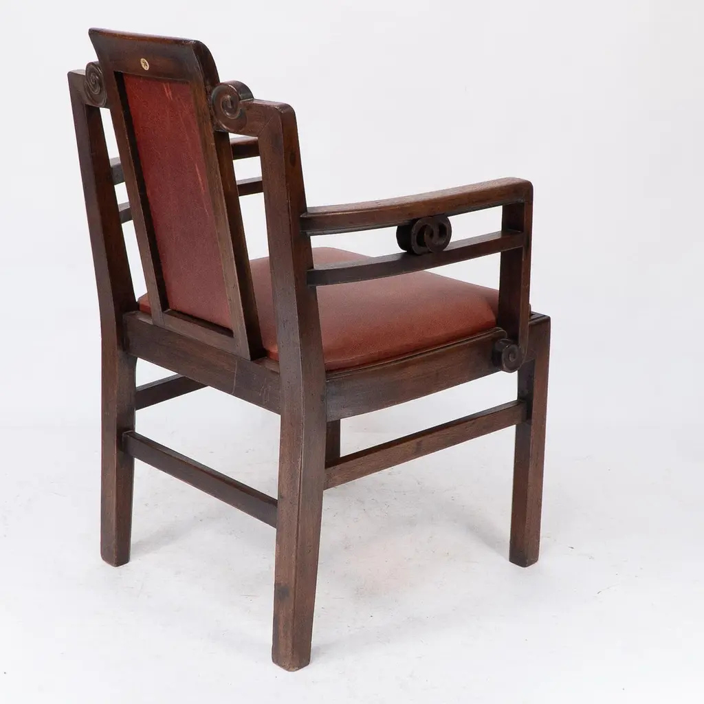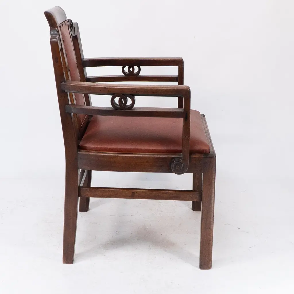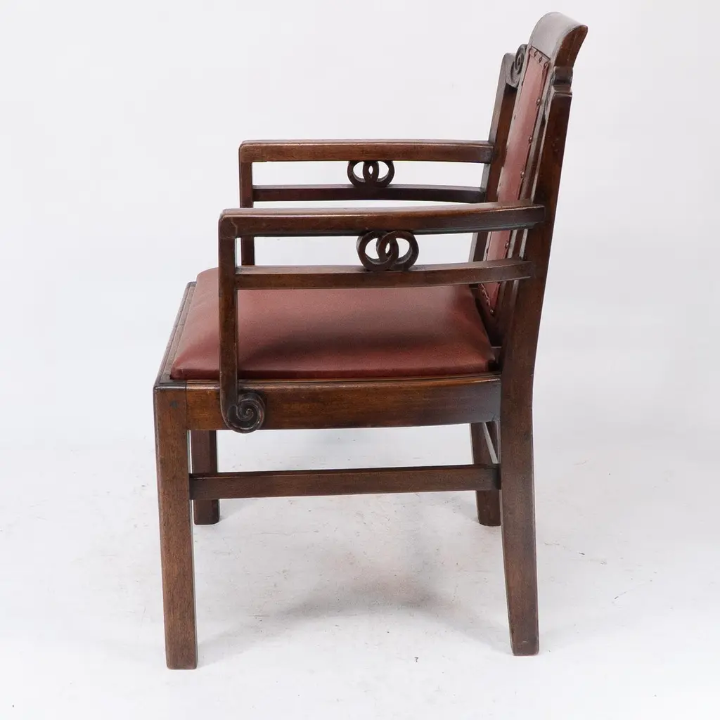 Sir Frank Brangwyn (attributed,) a pair of mahogany armchairs, in the Chinese style with professionally re-upholstered leather padded back and drop-in seat. These chairs share stylistic qualities with the famous armchairs he designed for the Salle Jacques Cartier aboard the SS Empress of Britain. He also designed two private dining areas, the Salle Wolfe and Salle Montcalm. These chairs retain the iron stay ring beneath the seats which were used for securing chairs down while at sea during heavy weather.
