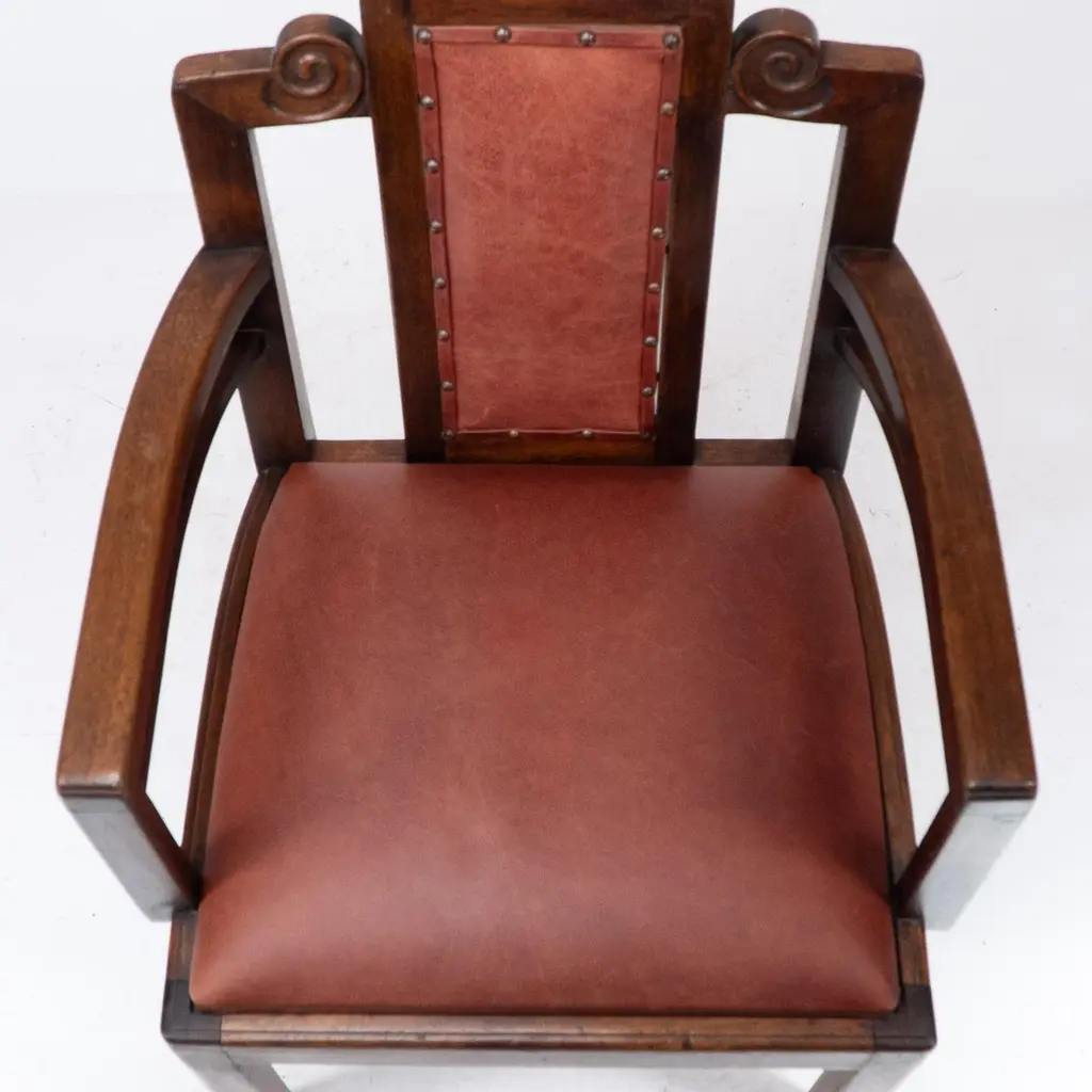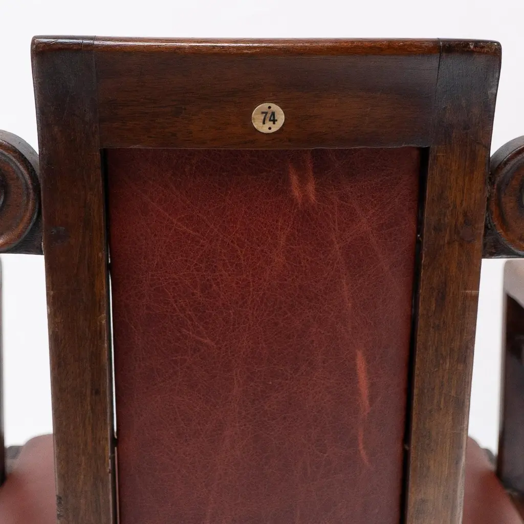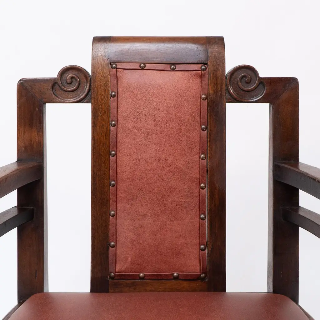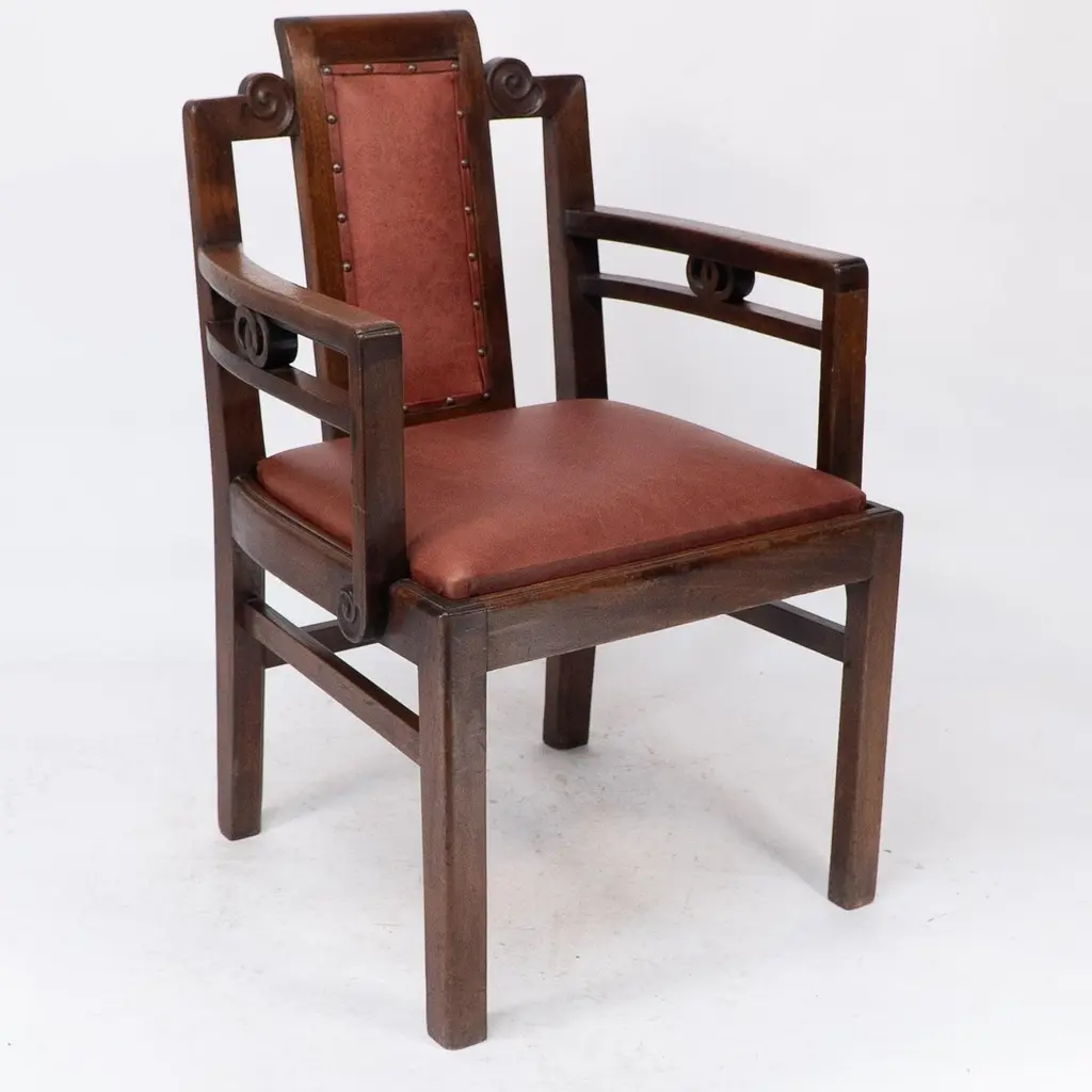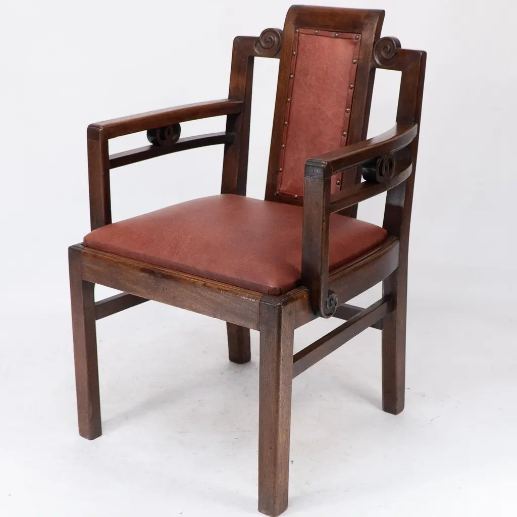 Sir Frank Brangwyn (attributed,) a pair of mahogany armchairs, in the Chinese style with professionally re-upholstered leather padded back and drop-in seat. These chairs share stylistic qualities with the famous armchairs he designed for the Salle Jacques Cartier aboard the SS Empress of Britain. He also designed two private dining areas, the Salle Wolfe and Salle Montcalm. These chairs retain the iron stay ring beneath the seats which were used for securing chairs down while at sea during heavy weather.