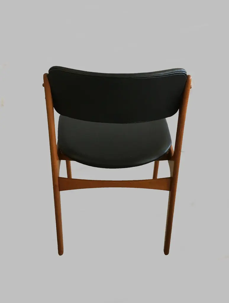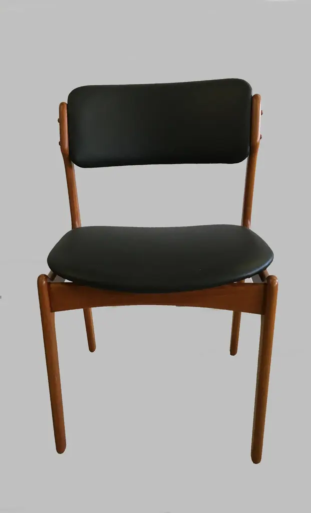 1960s set of six teak dining chairs with floating seat designed by Erik Buch for Oddense Maskinsnedkeri in 1949.The chairs have a simple yet solid construction with elegant lines and provide a very comfortable seating experience on the elegant floating seat design and are becoming increasingly collectable. Frames of the chairs have been carefuly restored - all joints checked and split apart and reglued under pressure if any signs of them gettinge loose, all other needed repairs made, carefully sanded by hand and refinished by our skilled cabinetmaker to insure that they are in very good condition with only minimal signs of age and use. Seats and backrests have been deupholstered, repairs made if needed, refoamed and finally reupholstered with black basic leather from "Sorensen Leather", a leather used for a vast range of iconic designs you see as collectibles in museums, galleries, executive settings and private residences worldwide, to enhance the sense of the good quality attached to this chair even more.We are shipping our pieces to most of the world on regular basis at compeatetive shipping costs - så feel free to ask for a shipping quote. Danish Industrial designer Erik Buch (pronounced Book) was born in 1923 in Copenhagen. Designing in the Scandinavian Modern style, Buch’s organic and functional aesthetic resulted in furniture that spanned chairs, stools, and cabinets. Like many of his Danish contemporaries, Buch combined fabric and leather with nicely grained woods, such as polished teak, oak, and rosewood.?Buch first found success with his Model 49 chair (1949). The chair, which is produced in both carver and dining chair styles, features a curved “floating” seat and a Classic Scandinavian Modern aesthetic. Arguably his most famous design, the Model 61 barstool (1961) has a typically Scandinavian base with organically sculpted lines. Many of Buch’s designs are named after the year in which they were conceived, especially those produced by the cabinetmaker and furniture manufacture Oddense Maskinsnedkeri. Oddense was renamed O.D. Møbler in the late 1960s or early 1970s, which is reflected on the labels of later Model 61 productions.?Other designs by Buch include the Captain’s Chair (1955) for Ørum Møbler, Model 310 dining chair for Chr. Christiansen (1960s), and a t-shaped rosewood bar stool for Dyrlund (1960s).?It is believed that Buch passed away in 1973, though some sources state, 1982. Little is known of his personal life, but his professional legacy remains as his designs continue to be appreciated on the vintage market for their high-quality materials, solid craftsmanship, and Scandinavian aesthetic.