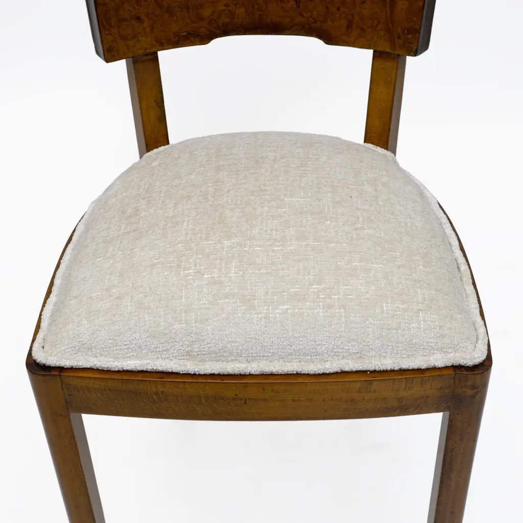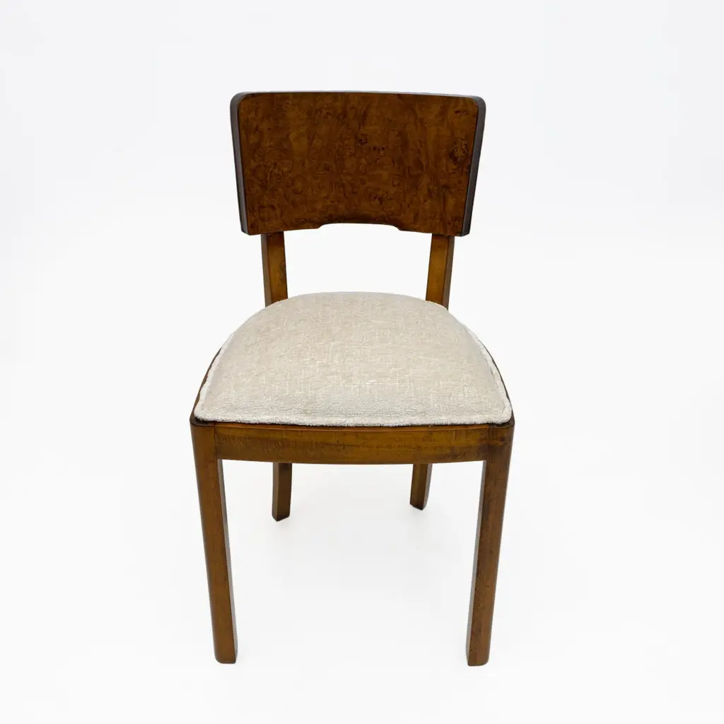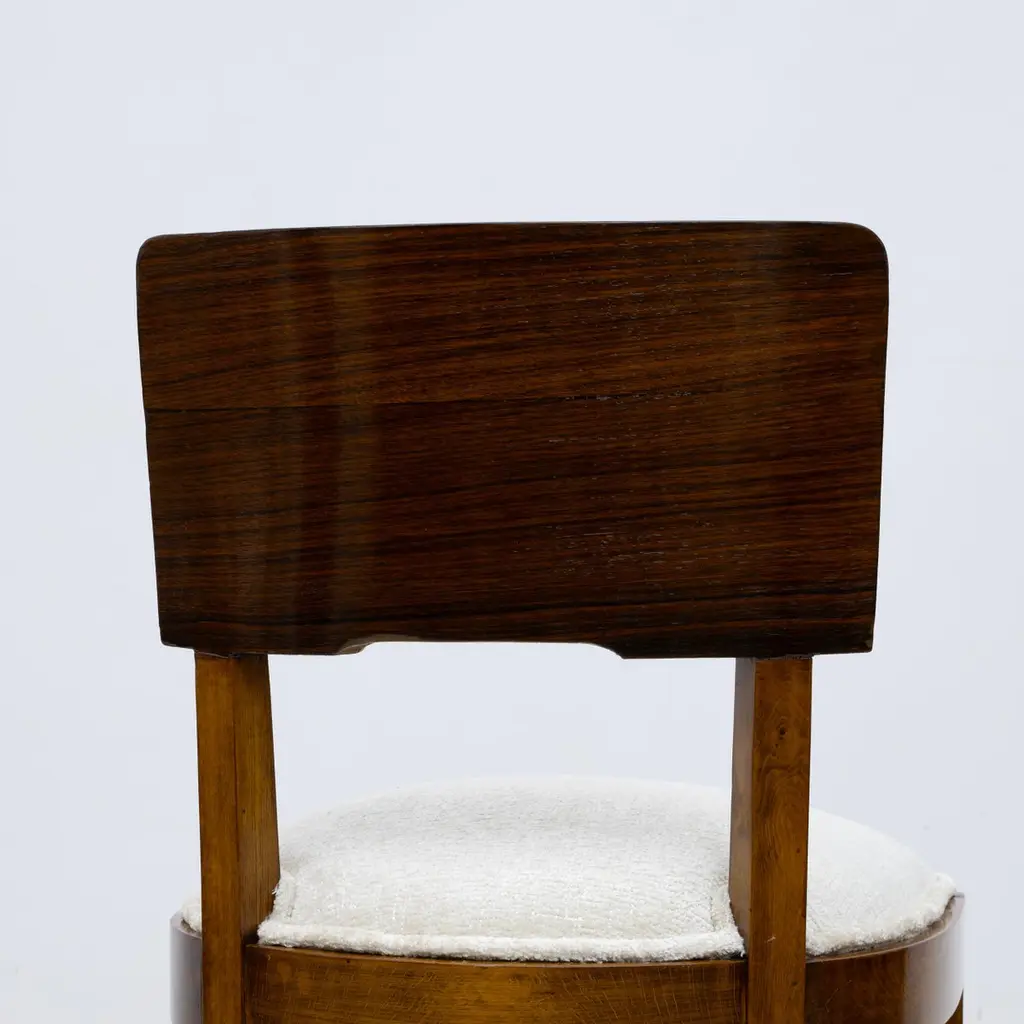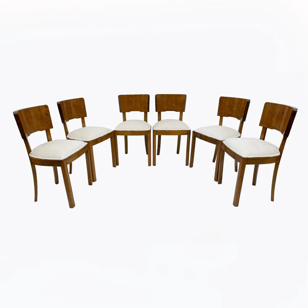 Set of 6 Art Deco dining chairs. Beech frame, with walnut burl veneer on the front of the backrest, while the rear of the backrest is veneered in rosewood. The chairs have been restored and upholstered in Bouclè fabric.