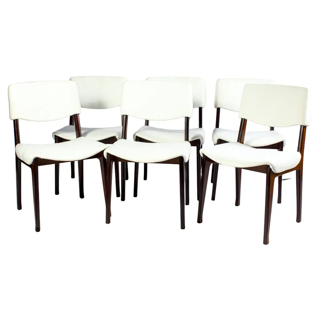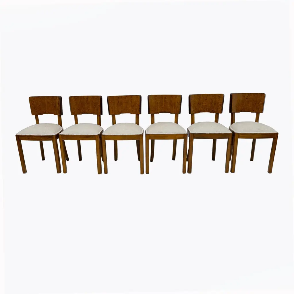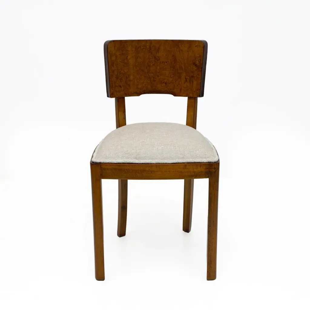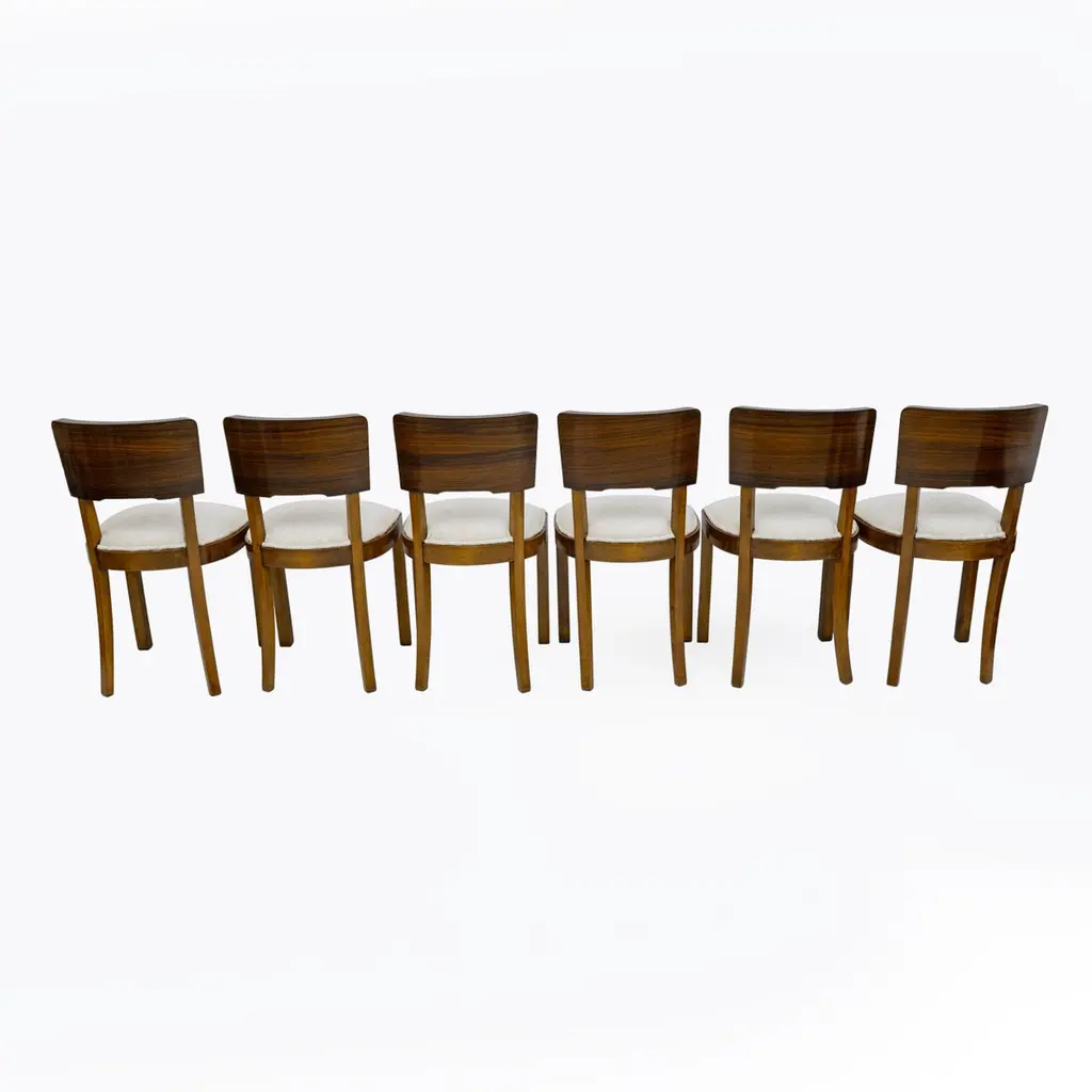 Set of 6 Art Deco dining chairs. Beech frame, with walnut burl veneer on the front of the backrest, while the rear of the backrest is veneered in rosewood. The chairs have been restored and upholstered in Bouclè fabric.