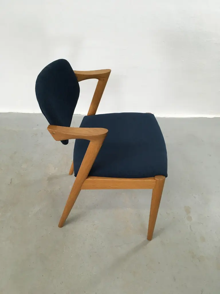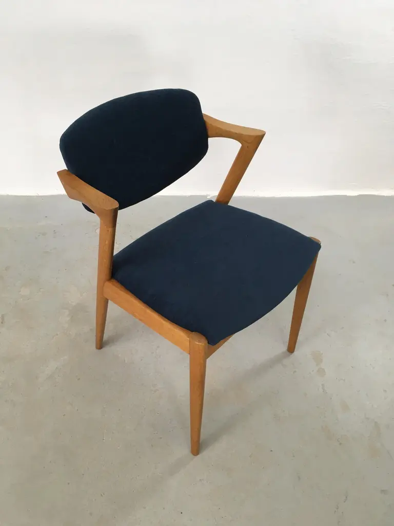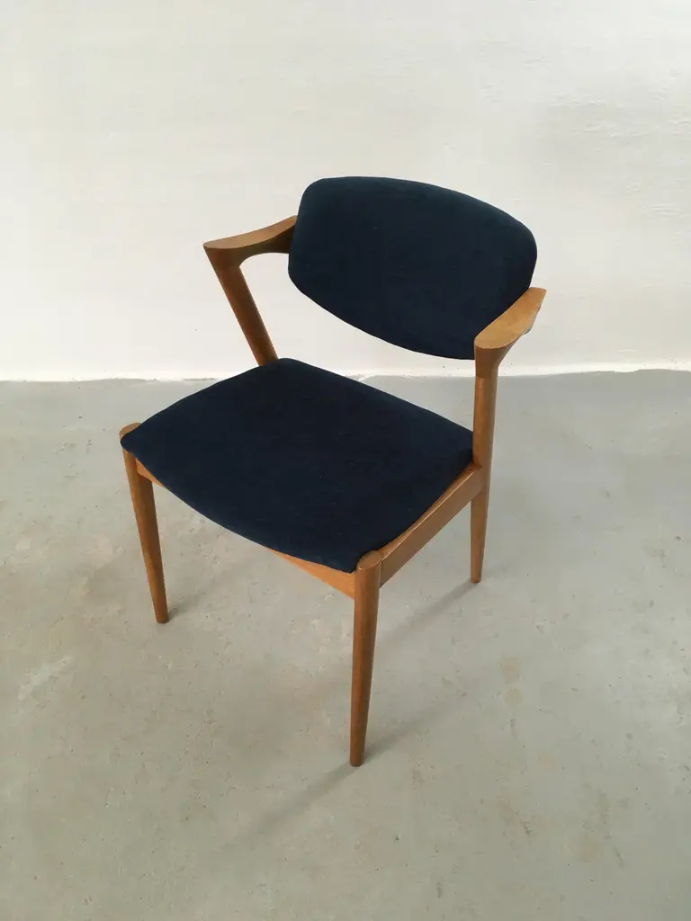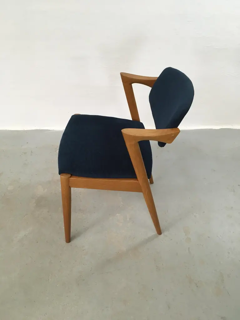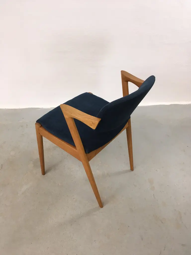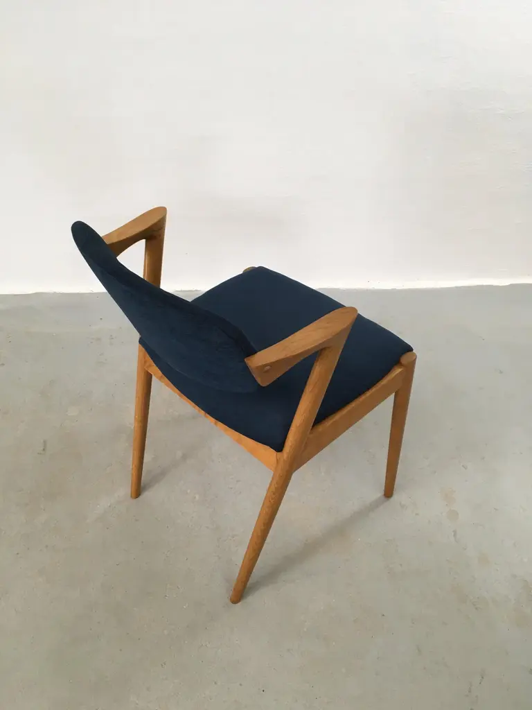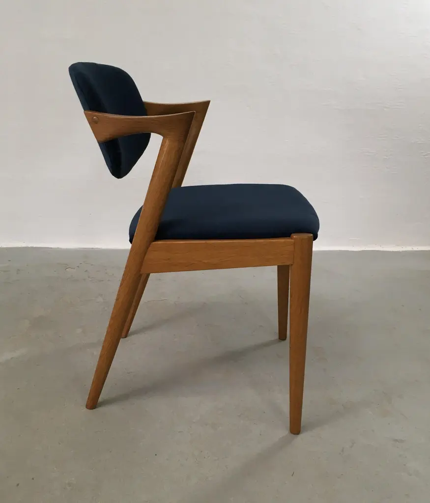 Set of six restored and refinished dining chairs in oak with adjustable backrest by Kai Kristiansen for Schous Møbelfabrik.The chairs have Kai Kristiansens typical light and elegant design that make them fit in easily where you want them in your home, a design that was so unique that his colleague the famous designer Hans J. Wegner characterized model 42 as beautiful from all angles when the chair was revealed in 1956.The chairs have been fully restored, sanded and refinished by our experienced workshop to insure that they are in very good condition with only minimal signs of age and use and will be reupholstered without additional cost in fabric of your choice from "Kvadrat" / standard leathers from "Sorensen Leather" or for additional price luxury leathers (Elegance, Vegetal, Rustic, Pure and Royal Nubuck).Kai Kristiansen was one of the last pupils of the famous architect Kaare Klint who founded modern Danish design and laid the foundation for the "Danish Modern" style. During the years 1958-1978 Kristiansen worked in his business in Aarhus owned jointly by himself and furniture maker Illum Wikkelsø (1919-1999).Kristiansens works met their most intense demand during a few decades from 1950, then production of them was discontinued. However, several of them are now being produced again by the Japanese furniture producer Miyazaki Chair Mill in Tokushima. An Australian producer has also included Kristiansen production in their portfolio. Kai Kristiansen might have been the originator of mass produced furniture, had he accepted an offer from Ikea-founder Ingvar Kamprad. He declined to let himself enroll in the Ikea staff.Kristiansen exhibitions include numerous participations in furniture and design shows in Milano, Paris, Cologne and London. Among his most cherished works is the Paper Knife collection, including two sofas, a coffee table and an armchair. His 4110 og Handy chairs are also widely sold. In fact, the Kai Kristiansen name is probably better known by a selected global furniture design public than it is known generally in his home country.