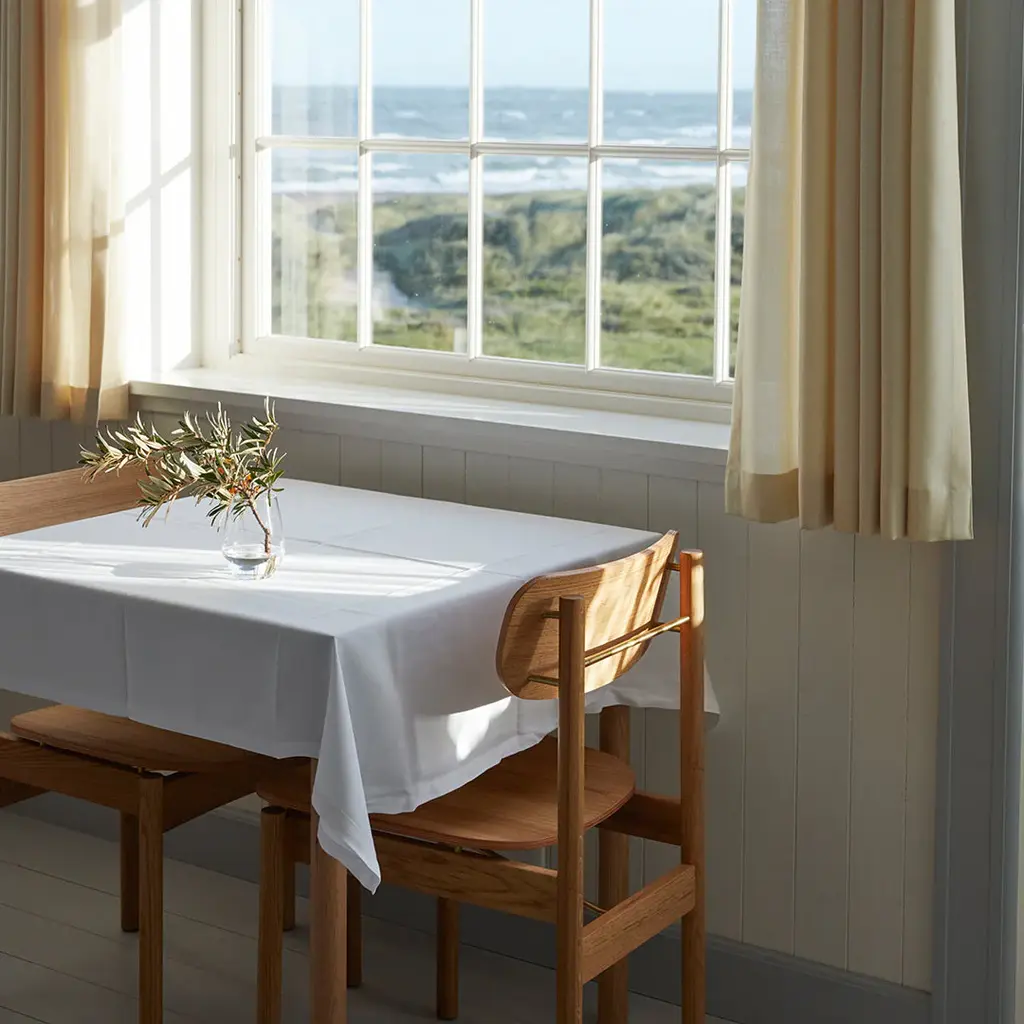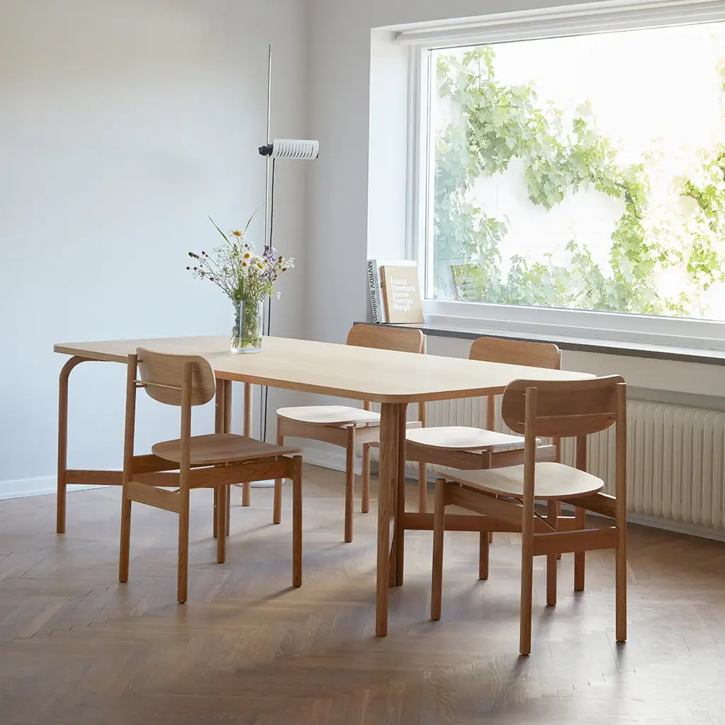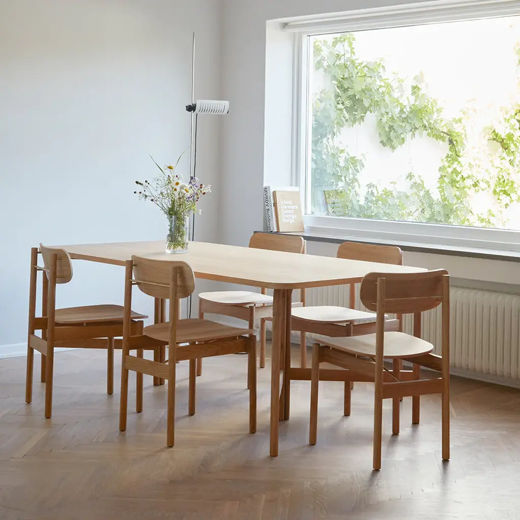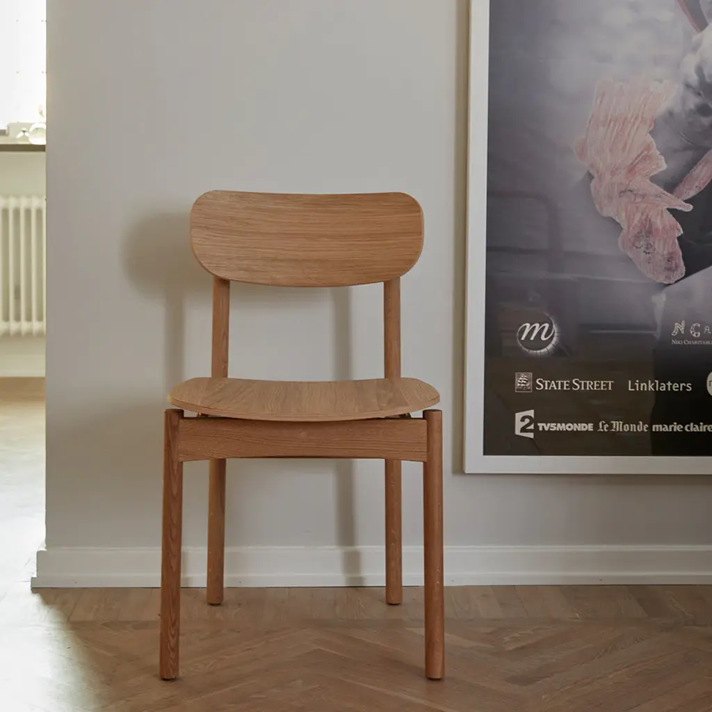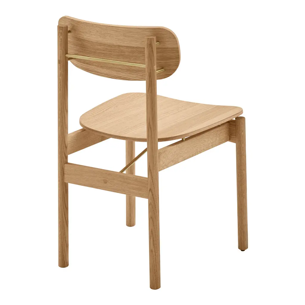 A transverse brass rod that indicates where you pull out the chair. Legs that continue up into the backrest and becomes a small hook, where you can hang your purse. A body in golden oiled oak that naturally contrasts the details in brass. A dining chair designed in a well-proportioned idiom, making it a comfortable seat. Vester Chair is elegant in a discreet way and understated without losing its momentum. Vester Chair is developed and produced by Skagerak for the seaside hotel, Svinkløv Badehotel. Cushion sold separately. Vester Chair won ”Furniture of the year” at Danish Design Awards 2020.