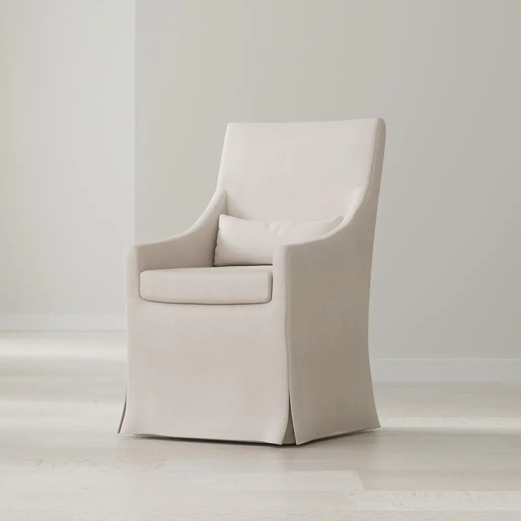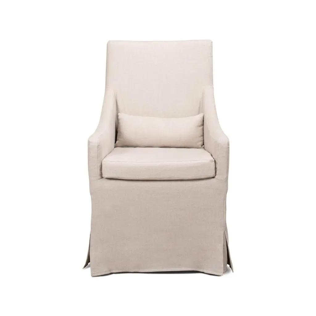 Elevate your living space with this sophisticated piece that seamlessly blends comfort with chic style. Crafted with a durable, sturdy frame, it's draped in a luxurious beige linen fabric.Designed for those who appreciate a blend of modern design with a touch of classic flair, the chair features a cushioned high back that provides ample support. The armrests slope and are crafted to support your posture, and the skirting detail adds an element of refined grace, ensuring this chair doesn't just sit in your room—it enhances it.Dimensions: 24" W x 28" D x 41" HSeat - 21"Arm - 25"