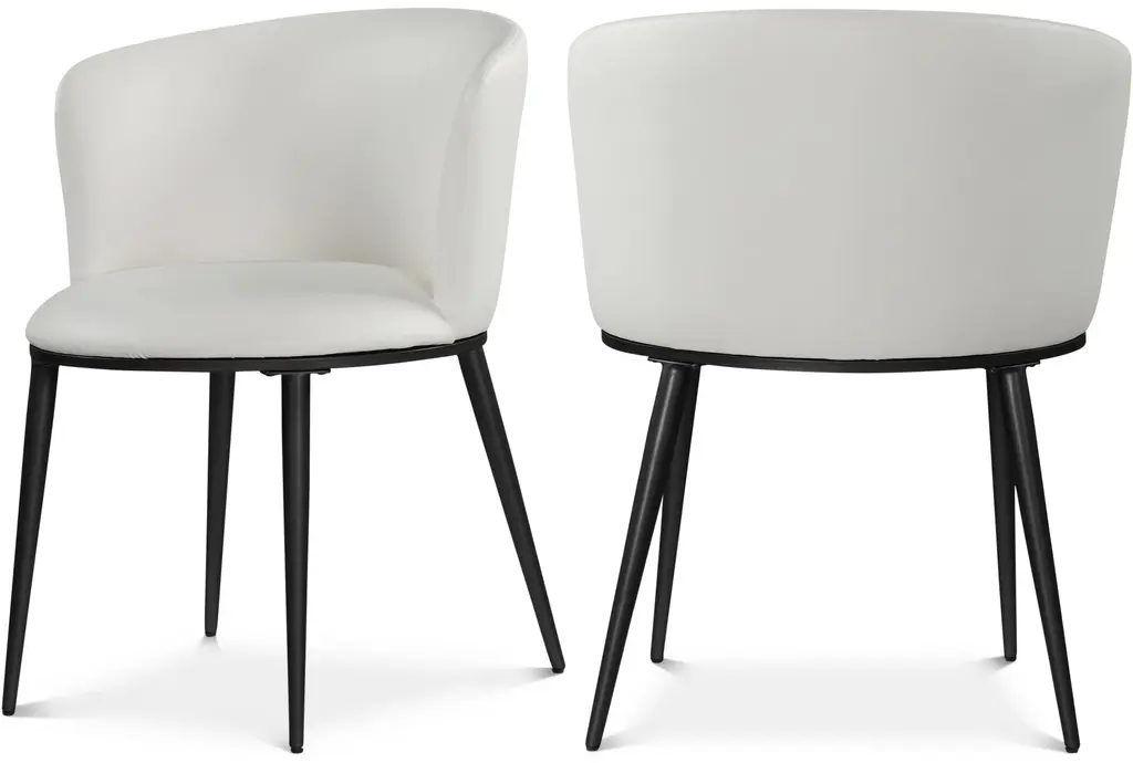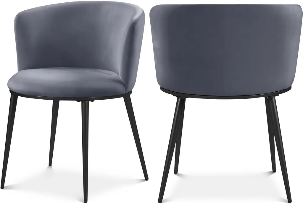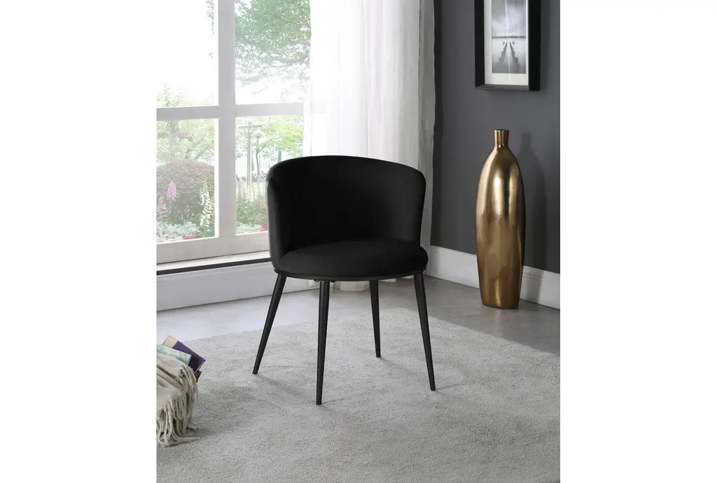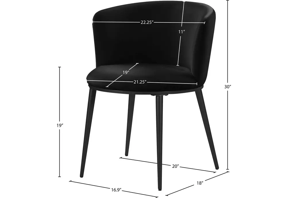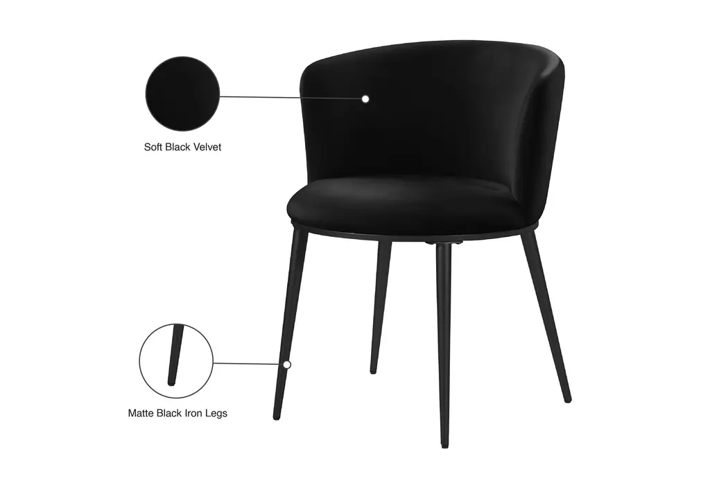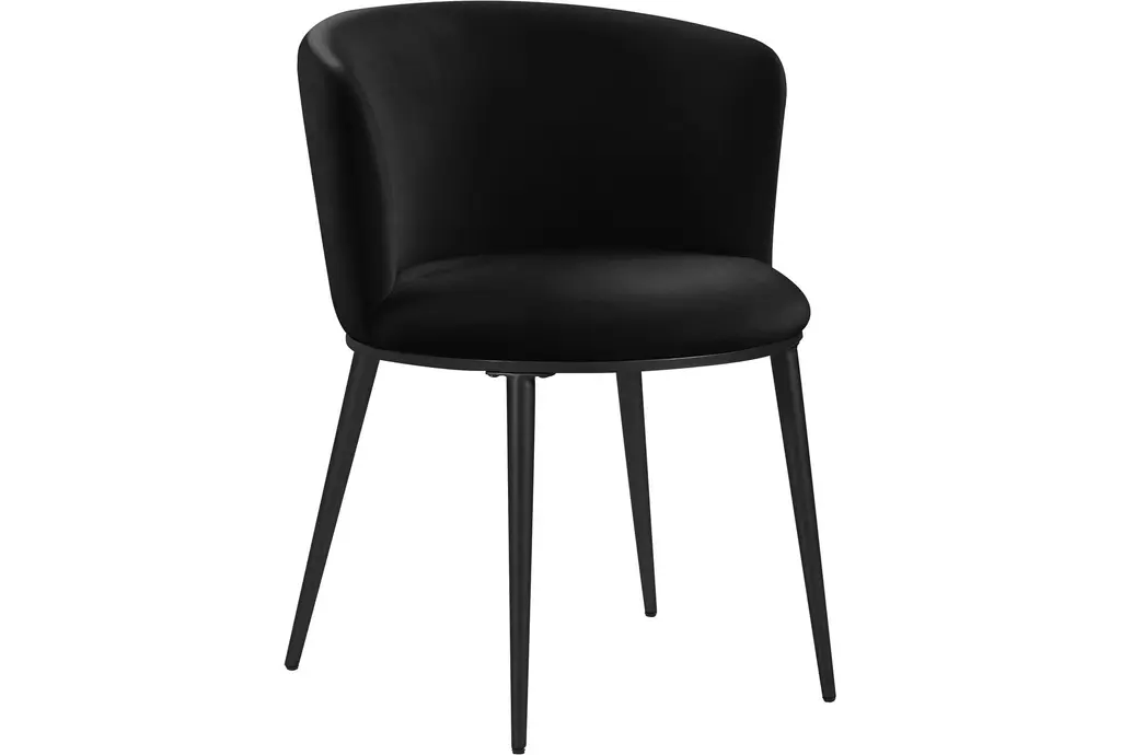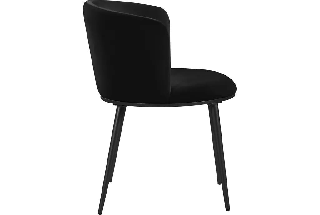 Skylar Black Velvet Dining Chair With Matte Black Finish Set Of 2 offers a modern, comfort-forward seat with a curved, armless silhouette upholstered in plush velvet. The foam-cushioned seat rests on an engineered wood platform with reinforced joinery and tapered iron legs finished in matte black for steady support. Designed to tuck easily under a table, these chairs bring cushioned comfort and a compact footprint to dining rooms and kitchens alike.
