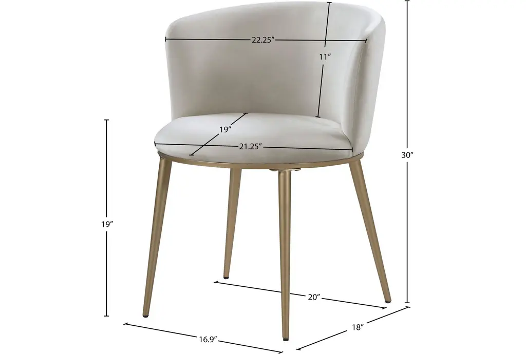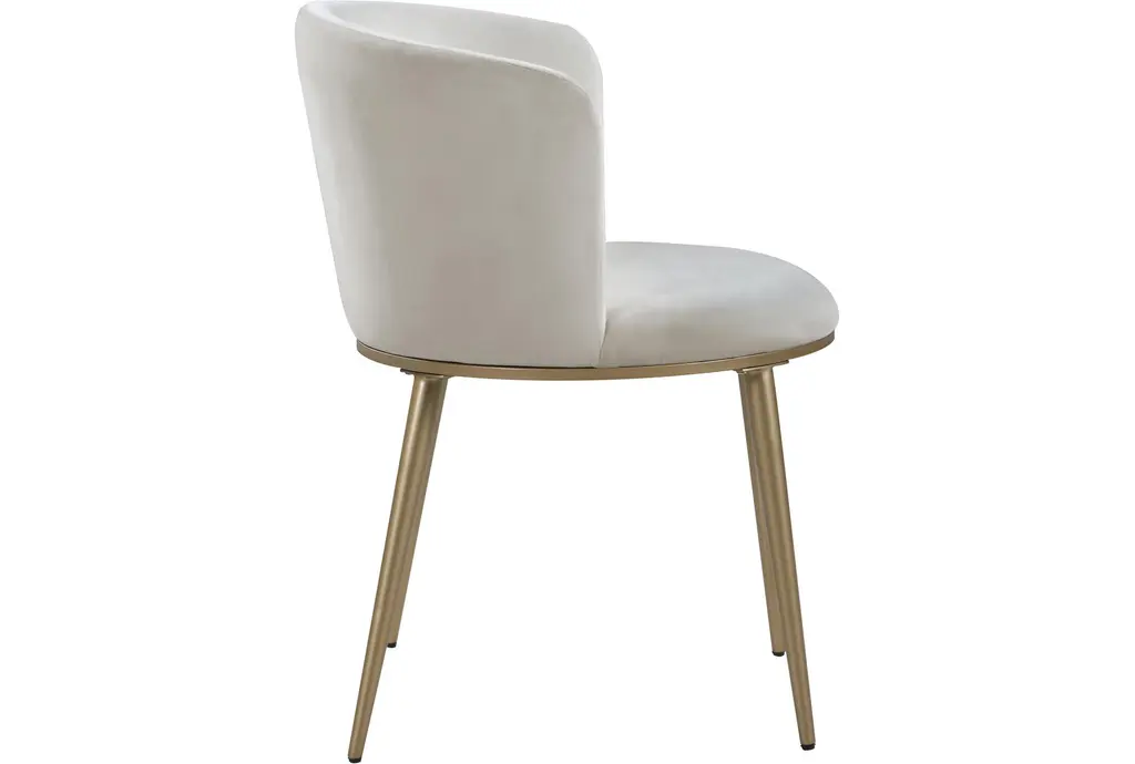 Skylar Cream Velvet Dining Chair Set Of 2 brings plush comfort and modern refinement to the dining room. Upholstered in cream velvet with a foam seat, each chair has a gently curved back that supports relaxed conversation while the armless silhouette saves space at the table. The chair pairs an engineered wood frame with tapered iron legs finished in brushed gold for steady support and a refined contrast, making it a versatile choice for everyday dining and kitchen seating.