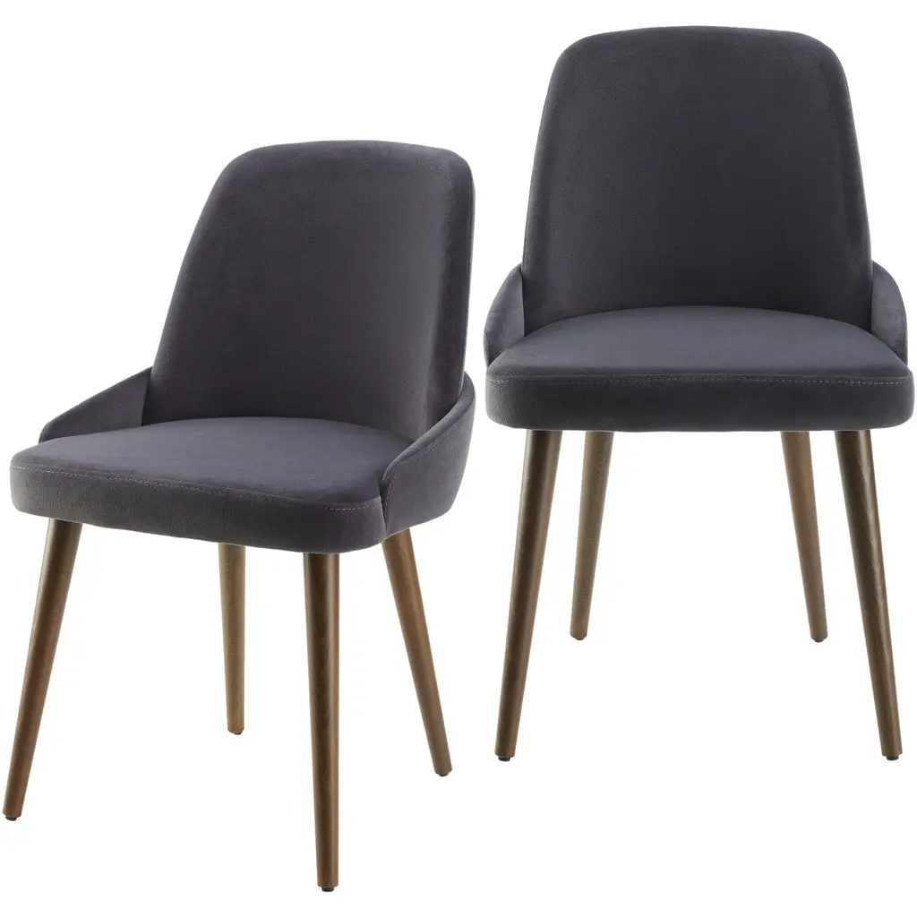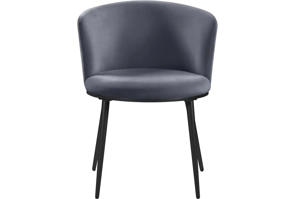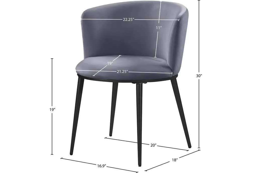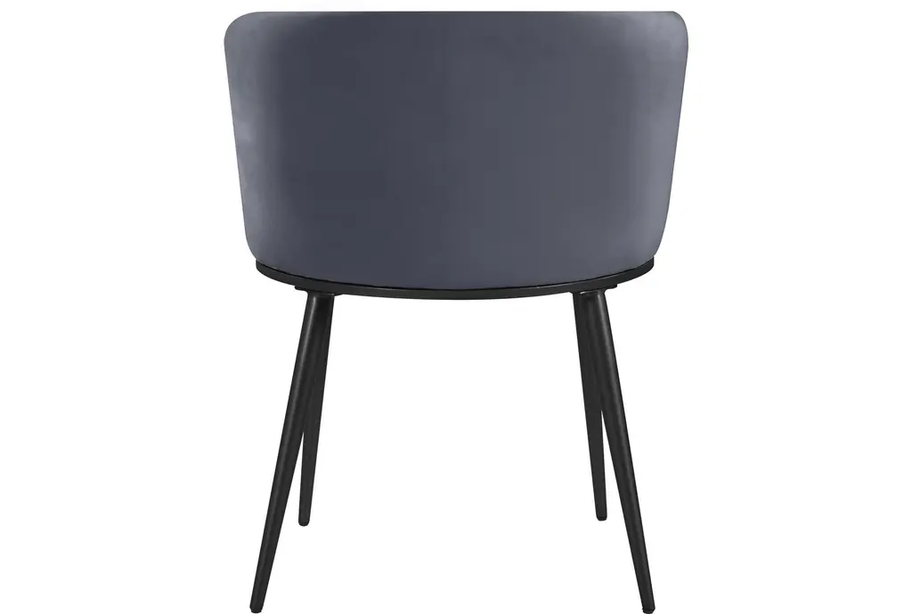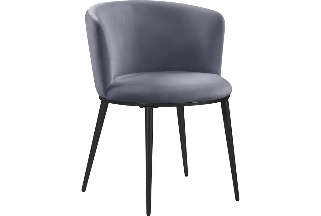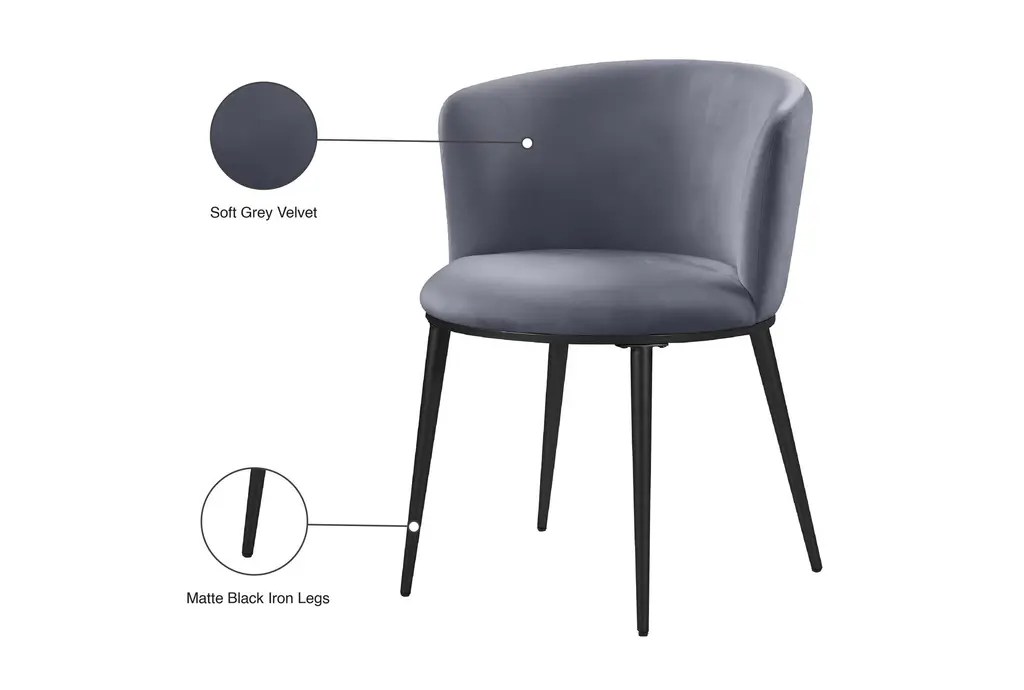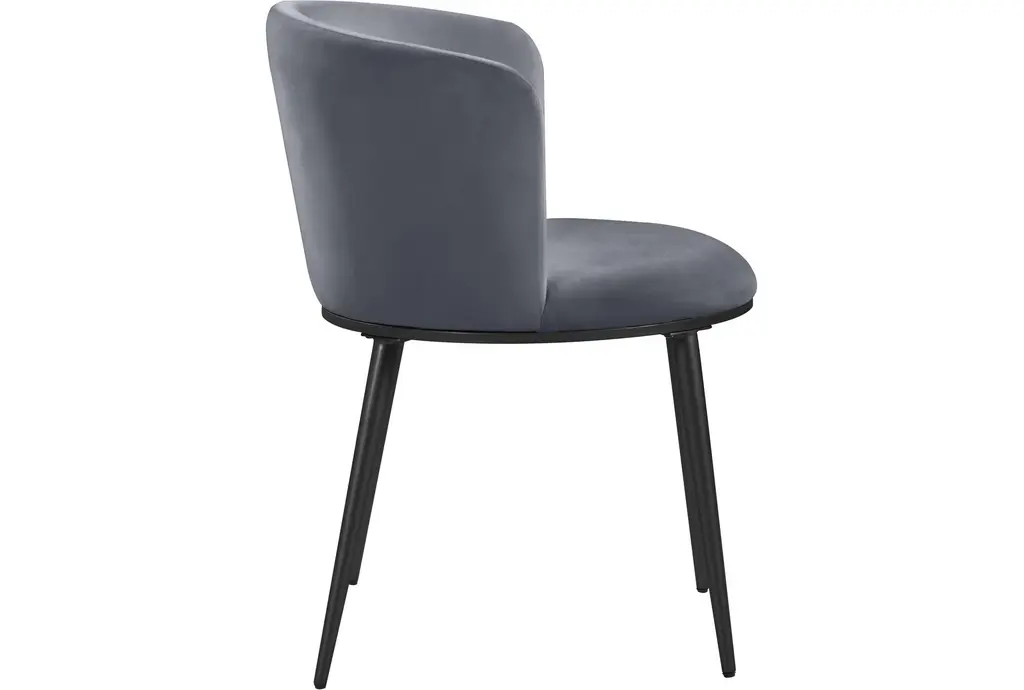Skylar Grey Velvet Dining Chair brings cloud-like comfort and a modern silhouette to your dining room. Upholstered in plush grey velvet with a cushioned seat, each chair sits on tapered iron legs with a matte black finish supported by an engineered wood frame for steady, everyday use. The compact, armless profile and gently curved back provide supportive seating while keeping sightlines open and tables easy to access. Sold as a set of 2, these chairs update a variety of dining rooms with comfortable, durable seating that tucks neatly under most tables.