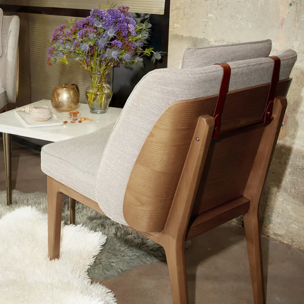 The Sloane Chair is the sister to our Sloane Arm Chair re-envisioned without the fully enclosed arm. Fully Upholstered Dining Chair. Solid Wood structure, with corner blocks to the support legs and ensure hospitality grade fabrication. Commercial grade medium density foam ensures long lasting comfort for a hospitality or residential environment. The large plush seat encourages you to sit for as long as the revelry lasts.