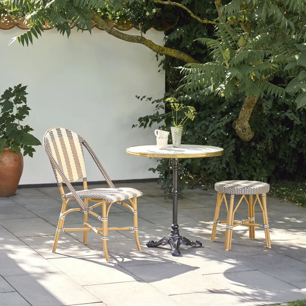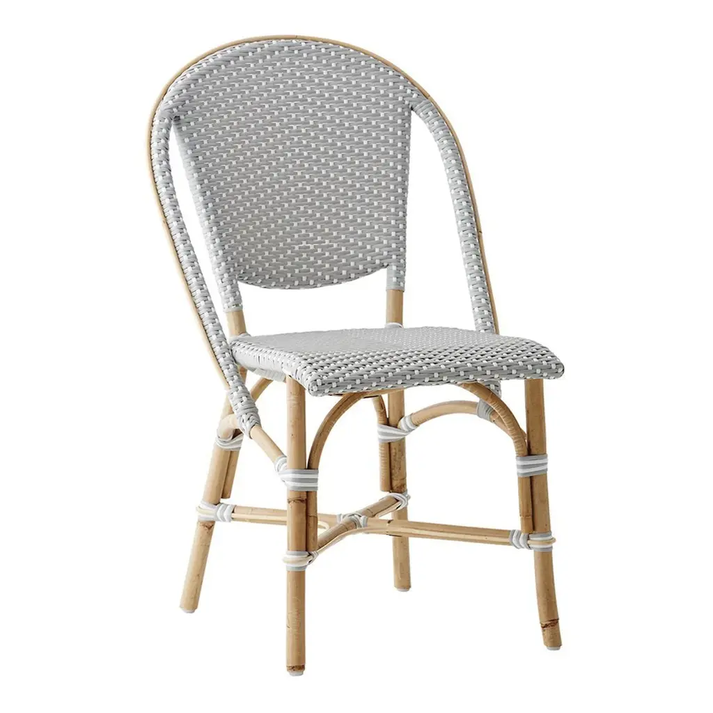 The Sofie Side Chair is a modern update of a classic Paris bistro chair and can be found in upper end cafes, brasseries, bistros and restaurants in historical European cities and capitals throughout the world. This colorful chair is a favorite among restaurants and cafes because of its durability and how well it stacks. The Sofie side chair is handmade using the finest Malacca cane rattan, stainless hardware, and our exclusive synthetic ArtFibre that can withstand rugged use. Each chair is meticulously handcrafted using the century-old method perfected by skilled Danish cane-makers in the 1970s. This technique creates signature organic marks by bending each piece of rattan into shape. Designed for indoor or covered outdoor use, the chair's rattan frame will patina to a lovely light gray finish over time. If the original natural rattan look is desired, rub with linseed oil.