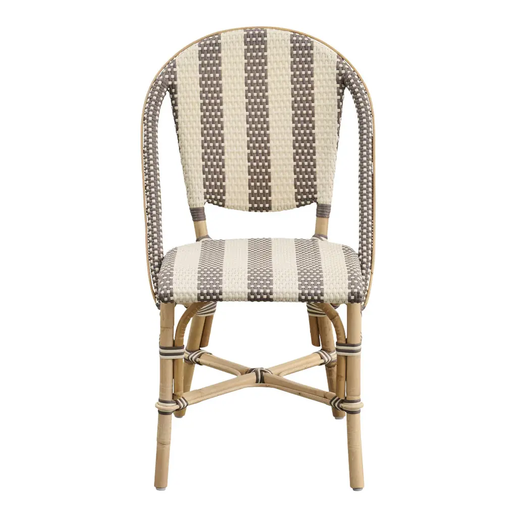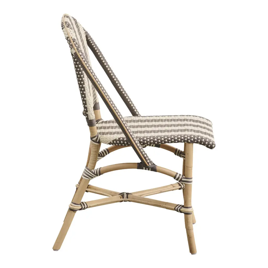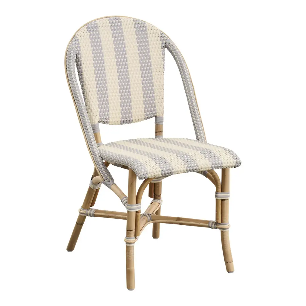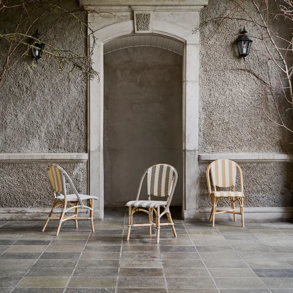 The Sofie Side Chair is a modern update of a classic Paris bistro chair and can be found in upper end cafes, brasseries, bistros and restaurants in historical European cities and capitals throughout the world. This colorful chair is a favorite among restaurants and cafes because of its durability and how well it stacks. The Sofie side chair is handmade using the finest Malacca cane rattan, stainless hardware, and our exclusive synthetic ArtFibre that can withstand rugged use. Each chair is meticulously handcrafted using the century-old method perfected by skilled Danish cane-makers in the 1970s. This technique creates signature organic marks by bending each piece of rattan into shape. Designed for indoor or covered outdoor use, the chair's rattan frame will patina to a lovely light gray finish over time. If the original natural rattan look is desired, rub with linseed oil.