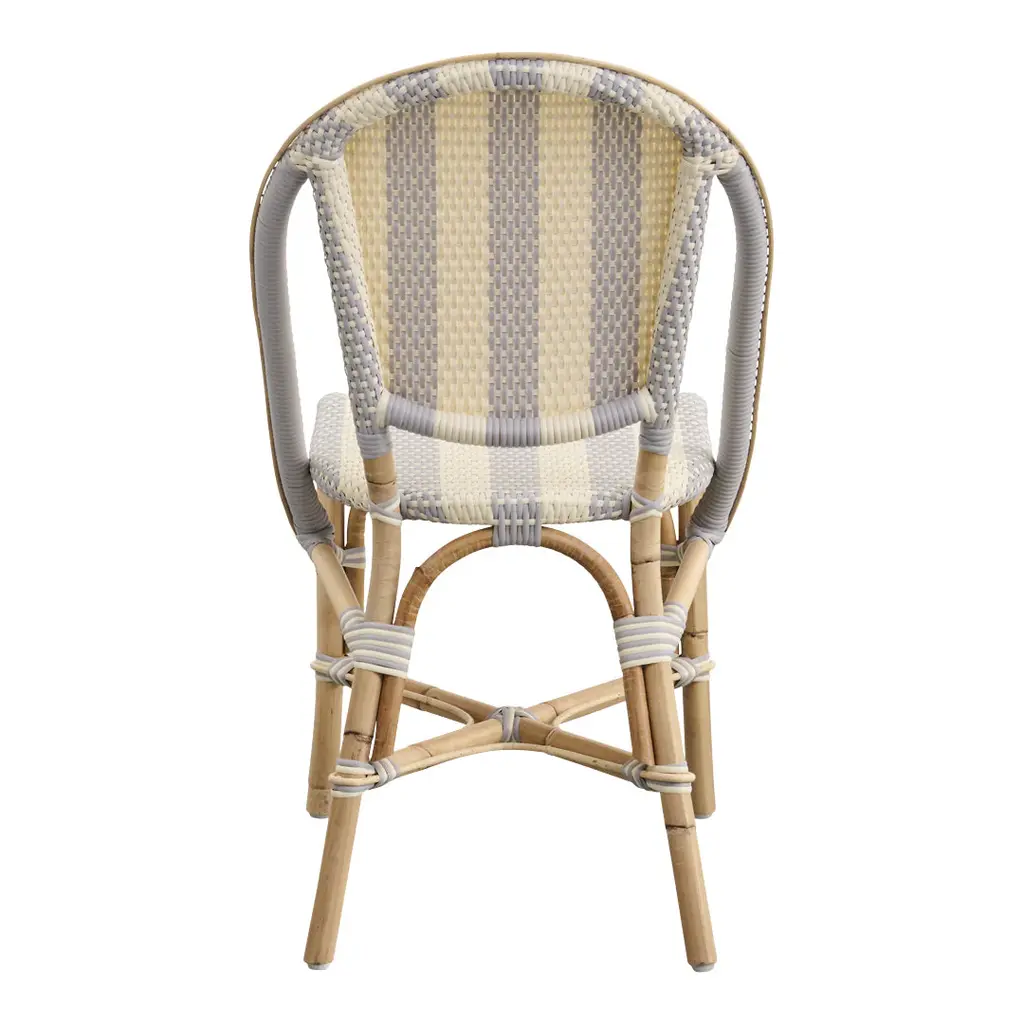 The Sofie Side Chair is a modern update of a classic Paris bistro chair and can be found in upper end cafes, brasseries, bistros and restaurants in historical European cities and capitals throughout the world. This colorful chair is a favorite among restaurants and cafes because of its durability and how well it stacks. The Sofie side chair is handmade using the finest Malacca cane rattan, stainless hardware, and our exclusive synthetic ArtFibre that can withstand rugged use. Each chair is meticulously handcrafted using the century-old method perfected by skilled Danish cane-makers in the 1970s. This technique creates signature organic marks by bending each piece of rattan into shape. Designed for indoor or covered outdoor use, the chair's rattan frame will patina to a lovely light gray finish over time. If the original natural rattan look is desired, rub with linseed oil.