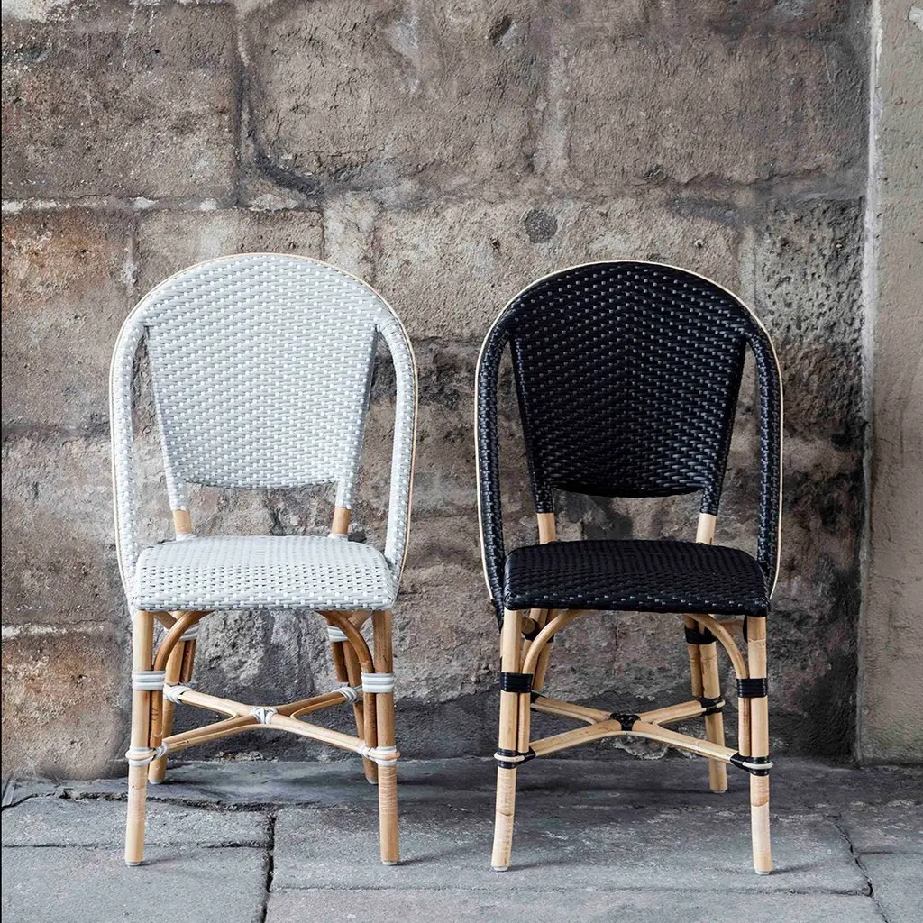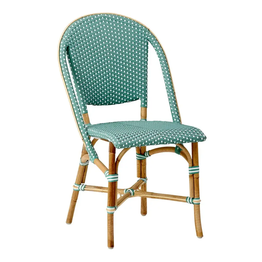 The Sofie Side Chair is a modern update of a classic Paris bistro chair and can be found in upper end cafes, brasseries, bistros and restaurants in historical European cities and capitals throughout the world. This colorful chair is a favorite among restaurants and cafes because of its durability and how well it stacks. The Sofie side chair is handmade using the finest Malacca cane rattan, stainless hardware, and our exclusive synthetic ArtFibre that can withstand rugged use. Each chair is meticulously handcrafted using the century-old method perfected by skilled Danish cane-makers in the 1970s. This technique creates signature organic marks by bending each piece of rattan into shape. Designed for indoor or covered outdoor use, the chair's rattan frame will patina to a lovely light gray finish over time. If the original natural rattan look is desired, rub with linseed oil.
