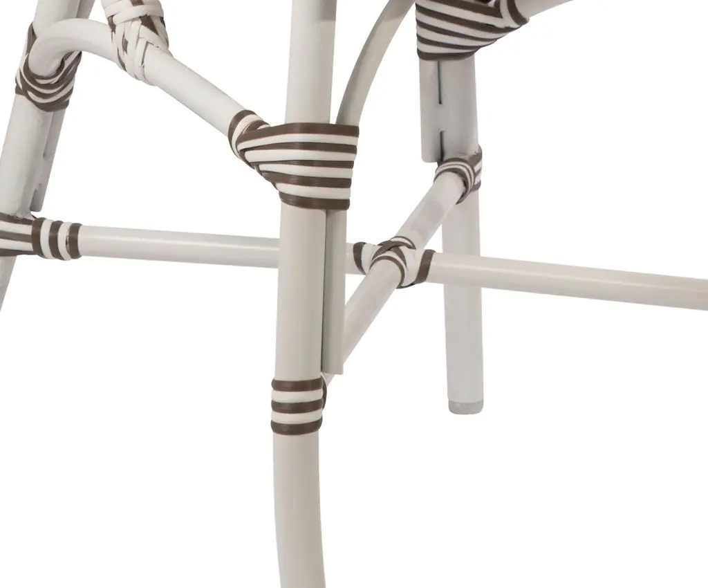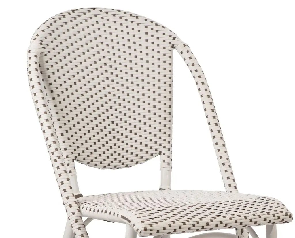 Chic enough for indoors and hardy enough for outdoors, this chair was inspired by timeless bistro chic. It's made of powder-coated aluminum and a proprietary wickerlike fiber that is UV resistant and retains its shape for years.