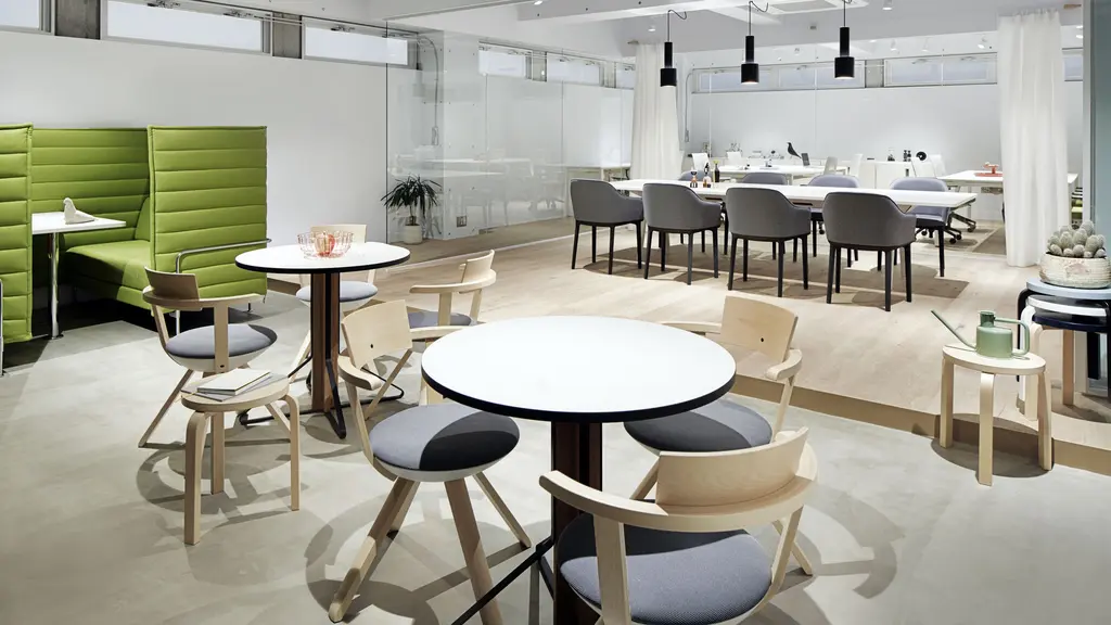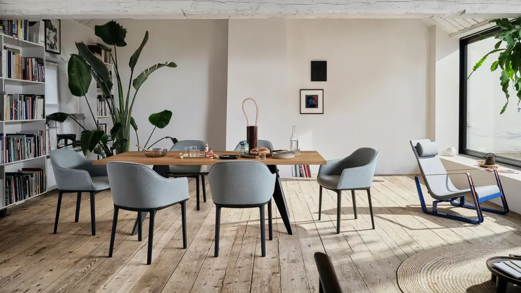 The Softshell Chair by Ronan and Erwan Bouroullec will surprise users with its exceptional comfort: flexible ribs are concealed in the back shell and adapt to the user, providing freedom of movement. The four-legged version of the elegant, lounge-style chair can be combined with a wide selection of dining tables.