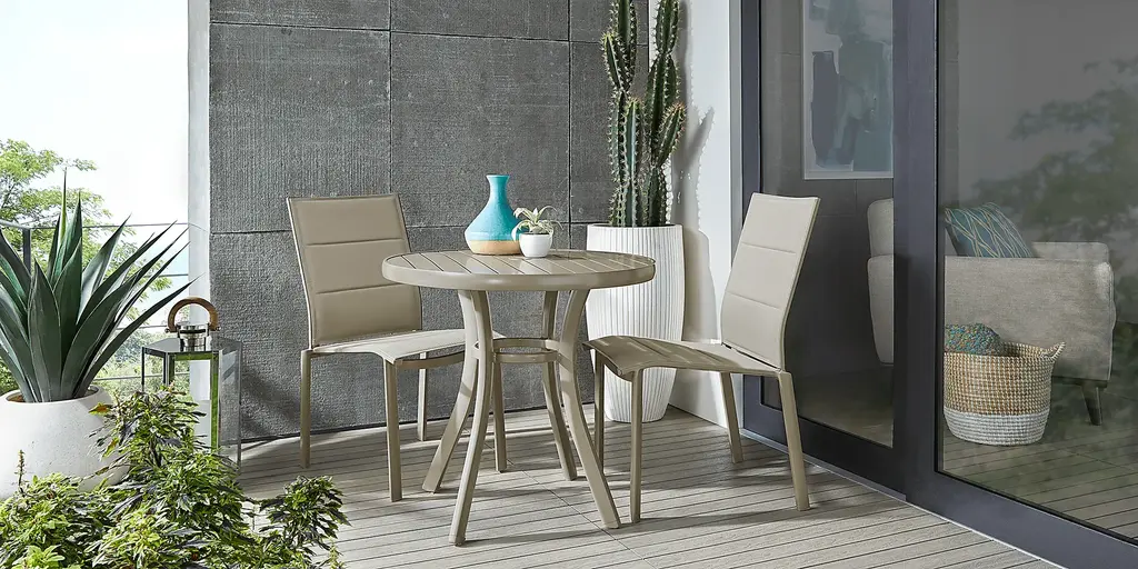 The Solana side chair offers a timeless look suitable for any outdoor space. Made with a rust-resistant sturdy aluminum frame in a powder coated taupe finish, the padded vinyl seat features Dacron padding for streamlined comfort. Easily spot cleaned with mild soap and water, the lightweight and stackable frame gives it an ease of mobility that makes re-decorating a snap.
