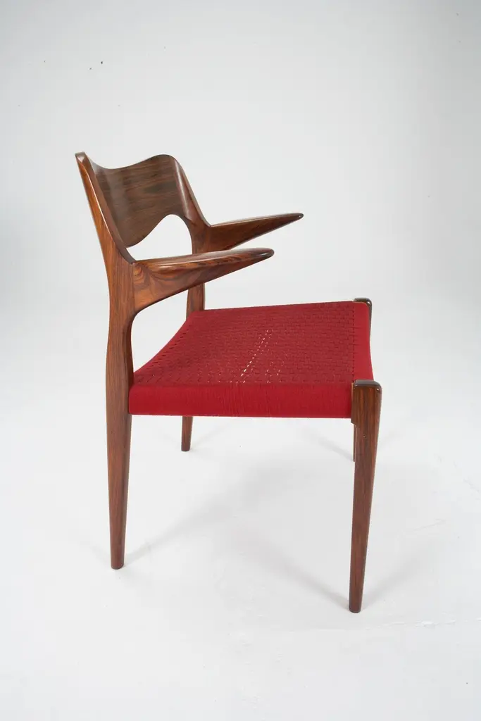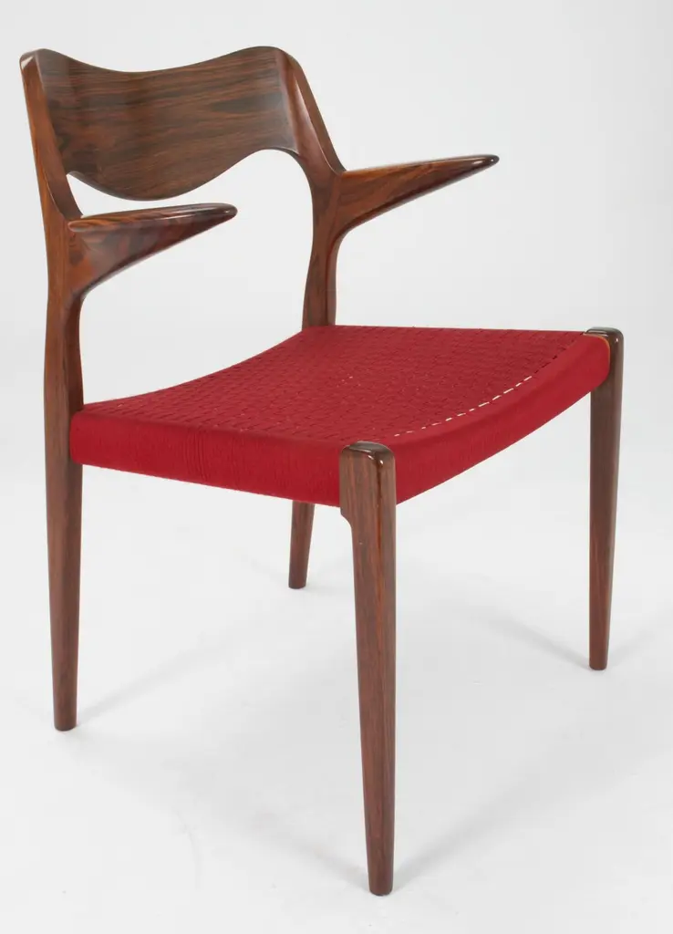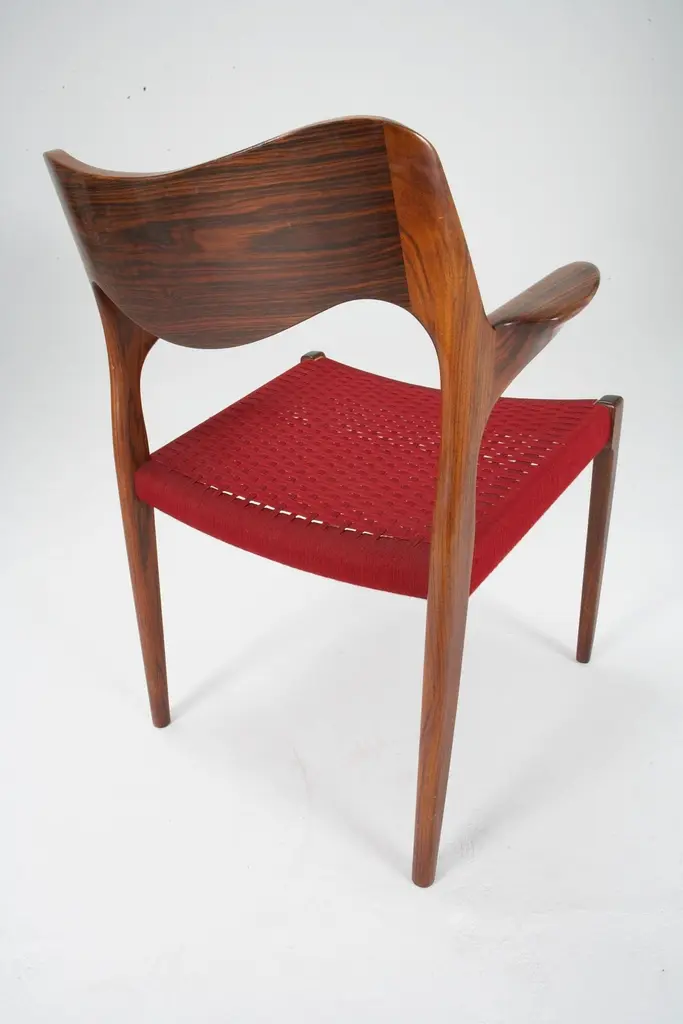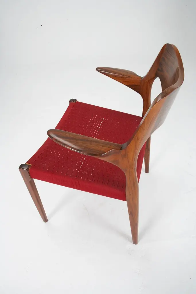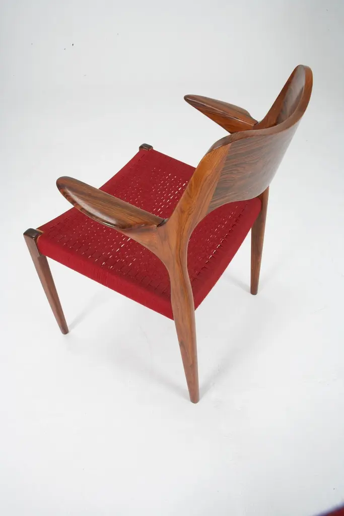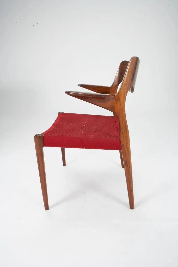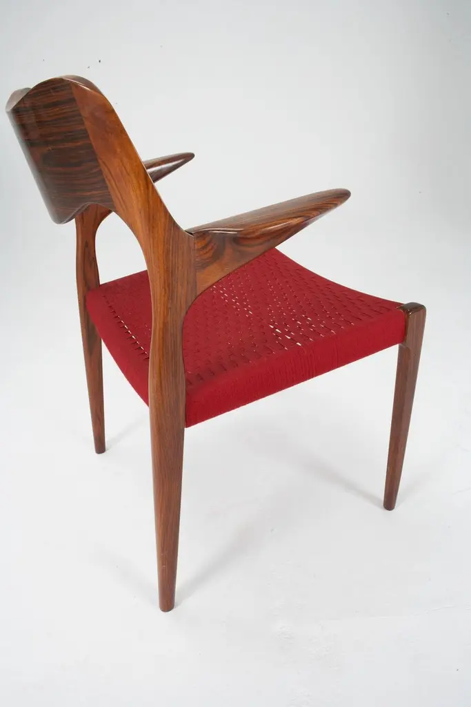 Sold individually, these eight of Niel Otto Moller Model 51 chair was designed in 1951. Most assume that Niel Otto Moller designed this first chair produced by his workshop JL Moller but, in fact, Niels Otto Moller commissioned Arne Hovmand Olsen to design this model. These eight chairs with original red cord appear to have little use as indeed they did. Sourced from a board room in Germany, they few signs of wear, Available in a separate listing are a set of 4 side chairs of this design also in red cord.
