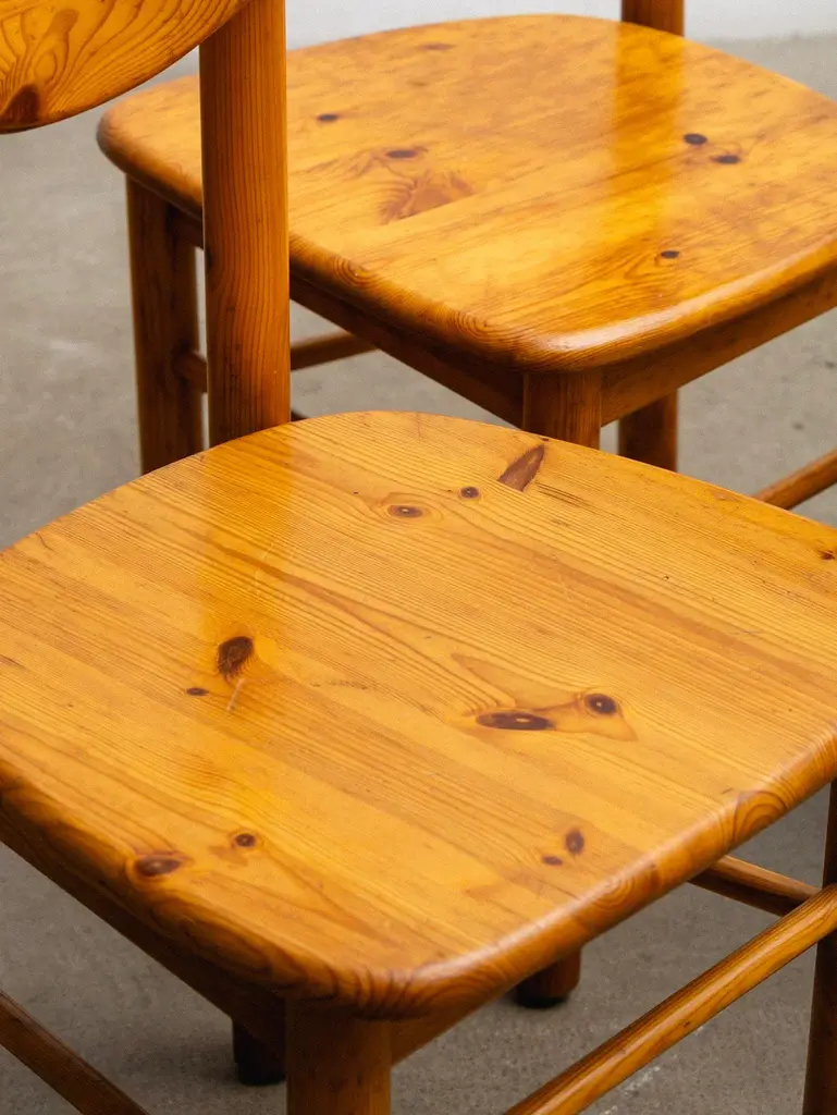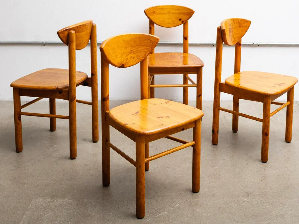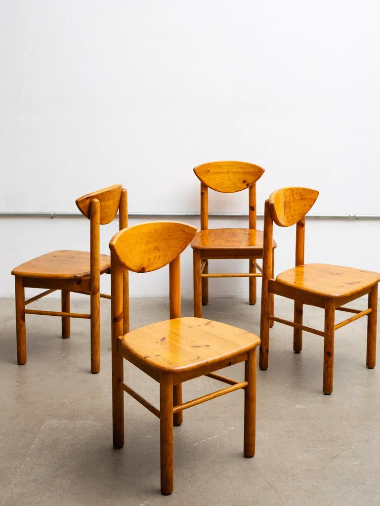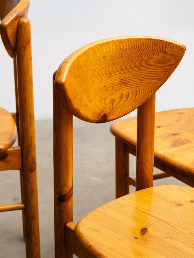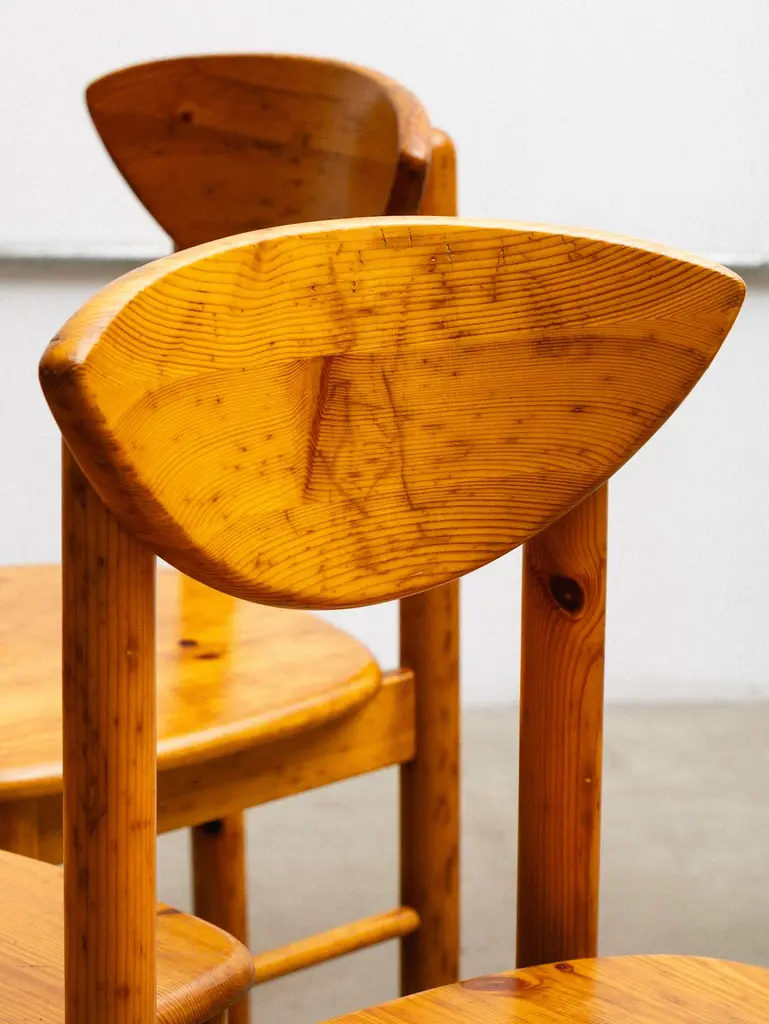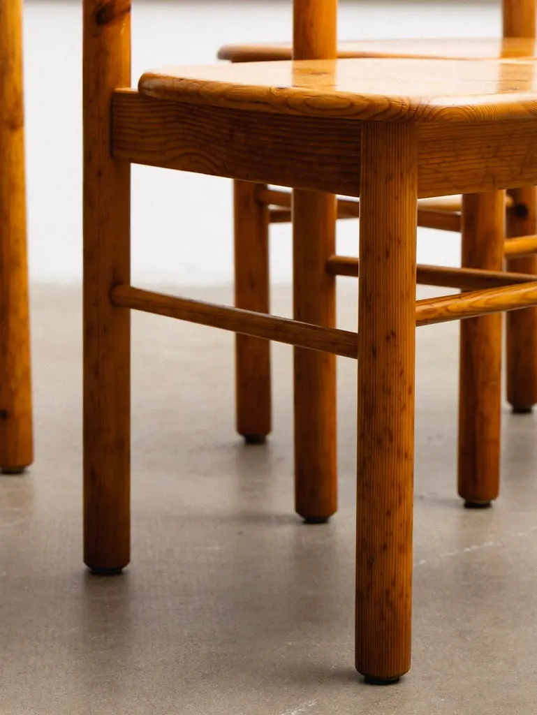 Danish solid pine dining chairs attributed to Rainer Daumiller. Sold in pairs. 4 pairs available (8 chairs total). Rainer Daumiller was a mid-20th century German-born designer closely associated with Scandinavian modernism. Active during the 1960s and 1970s, he is best known for his sculptural solid pine furniture produced by Hirtshals Savværk in Denmark. Daumiller favored natural, locally sourced woods and designed with an ecological sensibility, creating durable, ergonomic forms that highlight the material’s grain and character. His work blends Nordic simplicity with everyday functionality, making his pieces both practical and highly collectible.