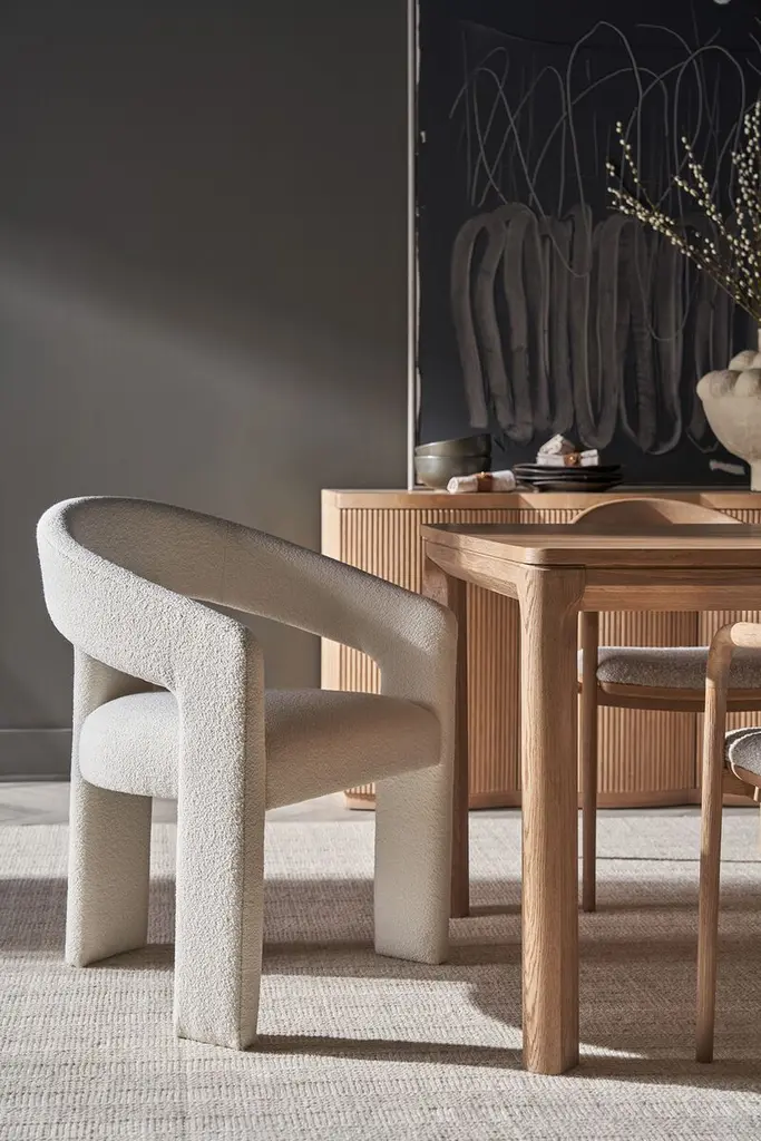 The Solly Dining Chair is a masterful display of angular artistry, blending sharp lines with open air spaces to create a dynamic interplay of form. Fully upholstered, it invites a tactile exploration of space, where the balance of negative and positive areas crafts a narrative of playful discovery and modern elegance.