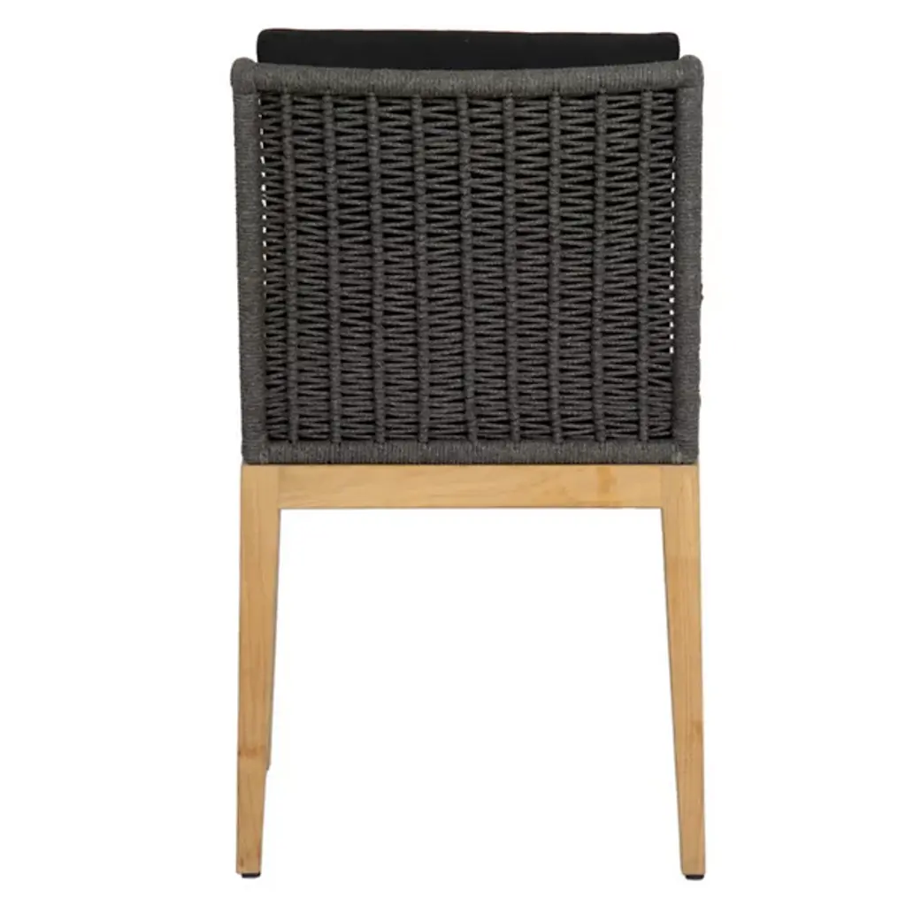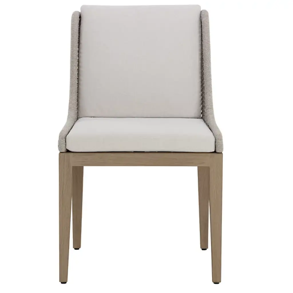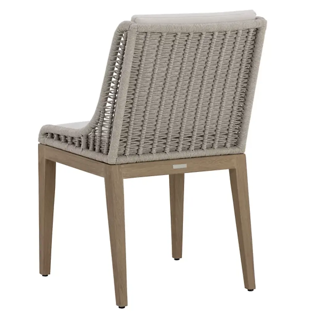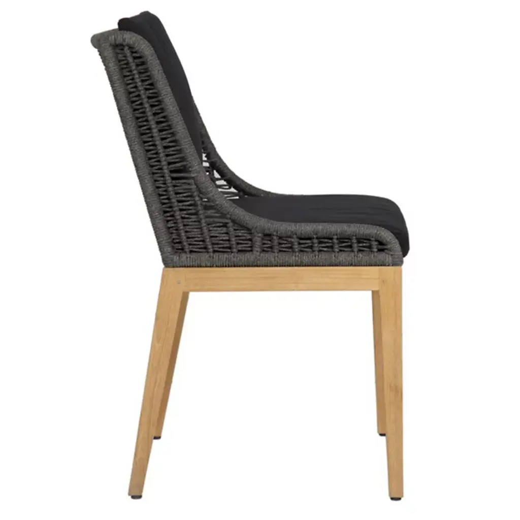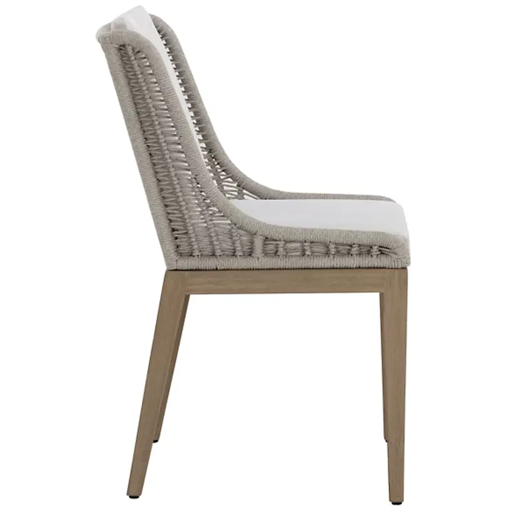 Keep things comfortable with the Sorrento Outdoor Dining Chair from Sunpan, an Indonesian-made construct resting on teak wood legs and a seat base; it uses a weave set around a powder-coated aluminum frame to act as the seat sides and back. The weave gives the seat a clever coastal touch, while a seat and back of quick-drying foam sit beneath a polyester envelope, easily able to resist weather, wind, and sun.