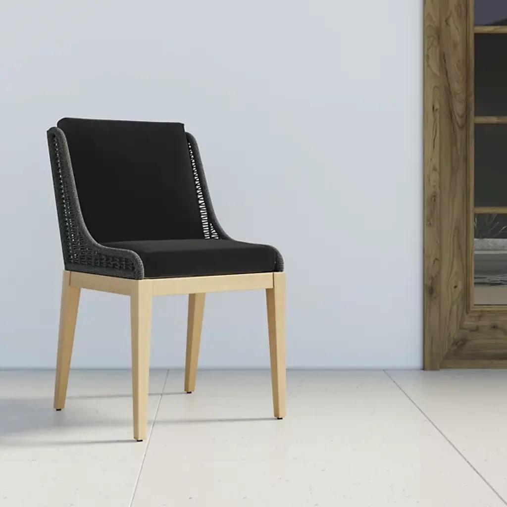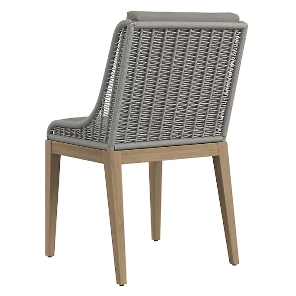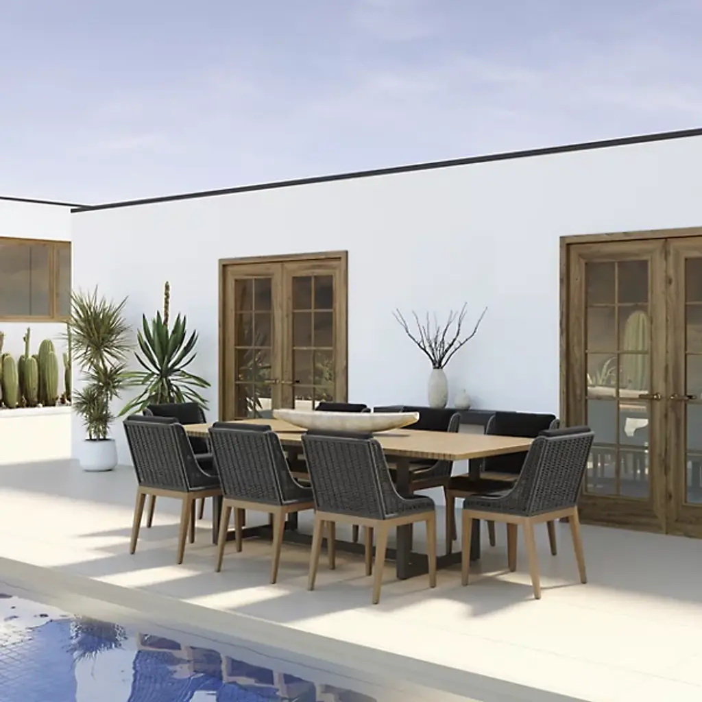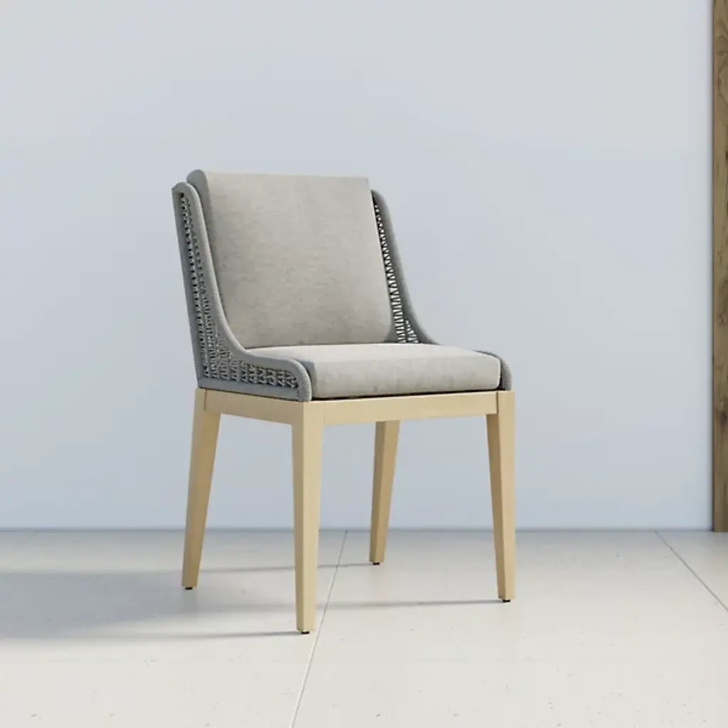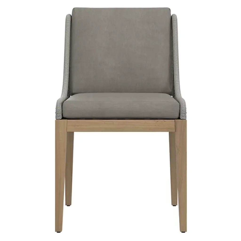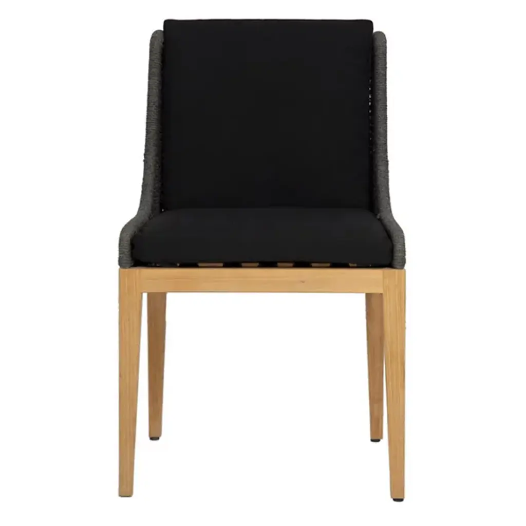 Keep things comfortable with the Sorrento Outdoor Dining Chair from Sunpan, an Indonesian-made construct resting on teak wood legs and a seat base; it uses a weave set around a powder-coated aluminum frame to act as the seat sides and back. The weave gives the seat a clever coastal touch, while a seat and back of quick-drying foam sit beneath a polyester envelope, easily able to resist weather, wind, and sun.