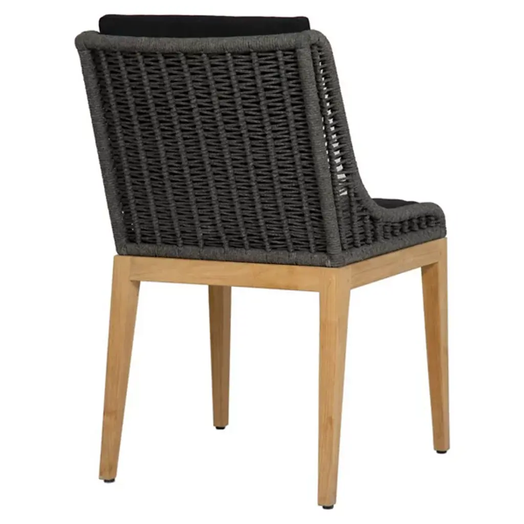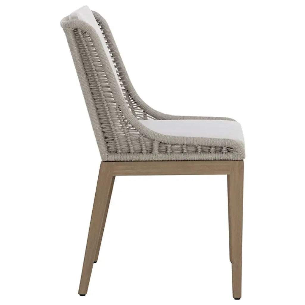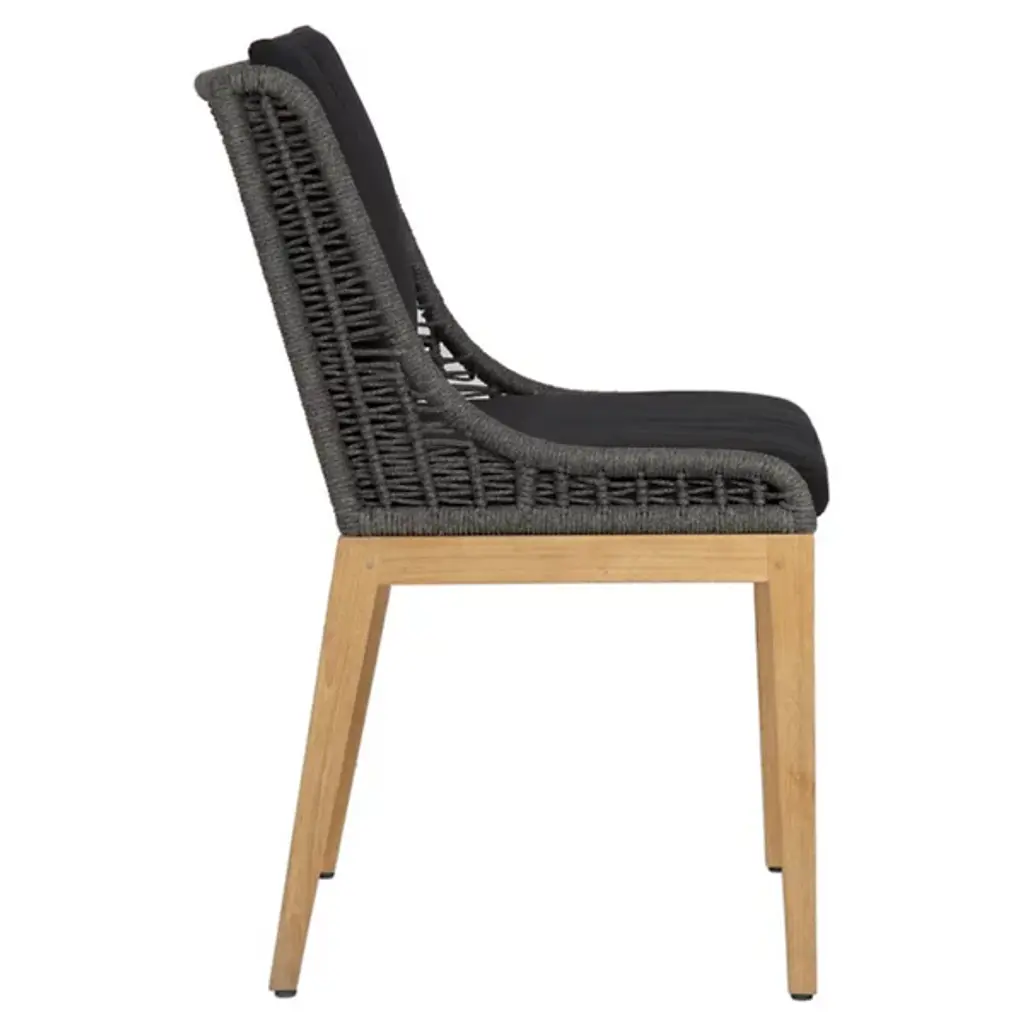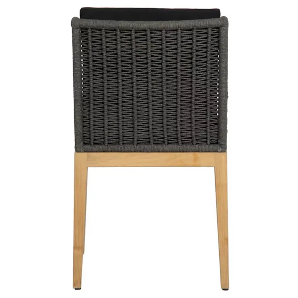 Keep things comfortable with the Sorrento Outdoor Dining Chair from Sunpan, an Indonesian-made construct resting on teak wood legs and a seat base; it uses a weave set around a powder-coated aluminum frame to act as the seat sides and back. The weave gives the seat a clever coastal touch, while a seat and back of quick-drying foam sit beneath a polyester envelope, easily able to resist weather, wind, and sun.