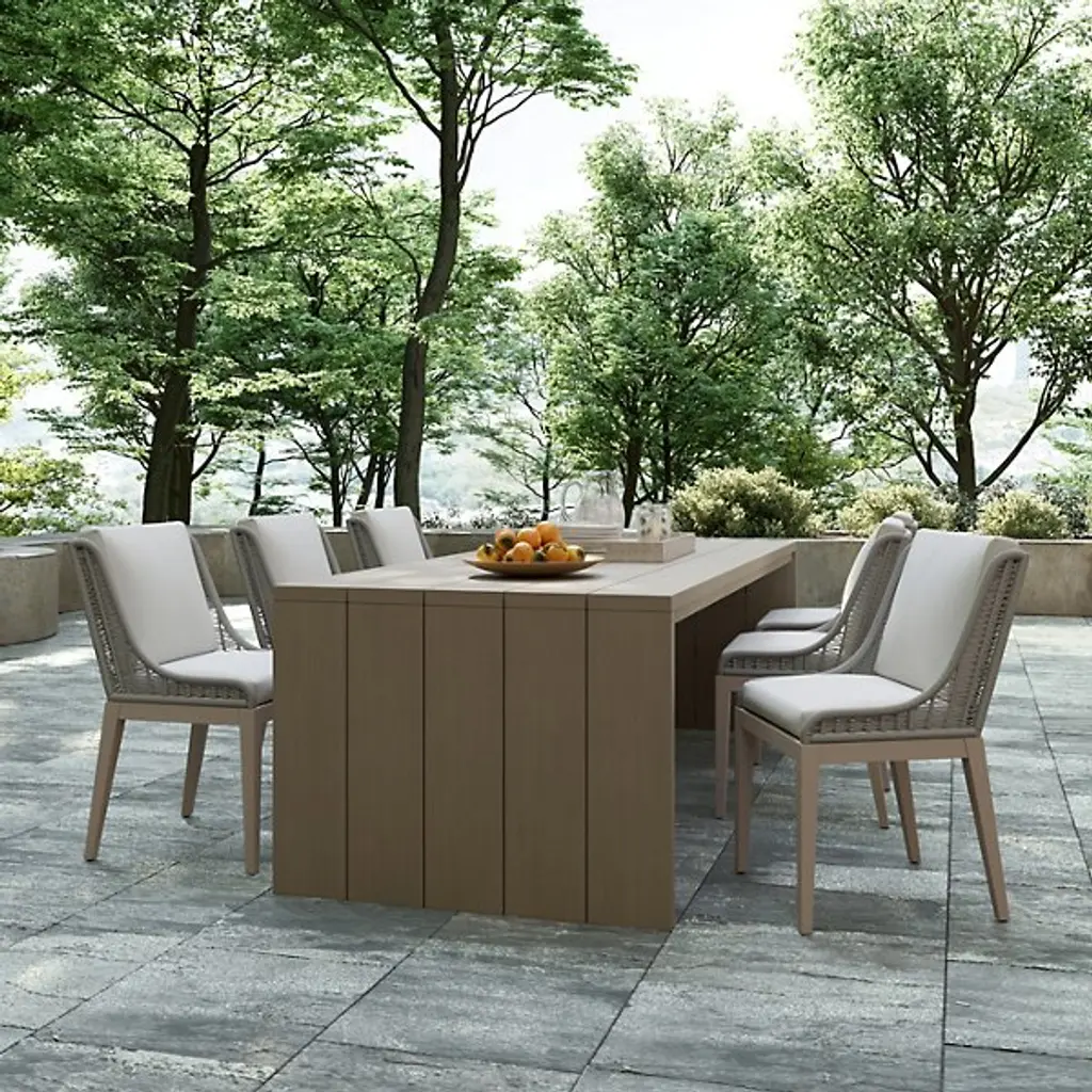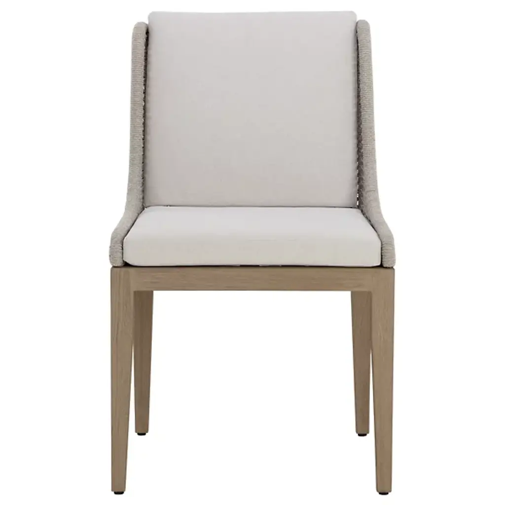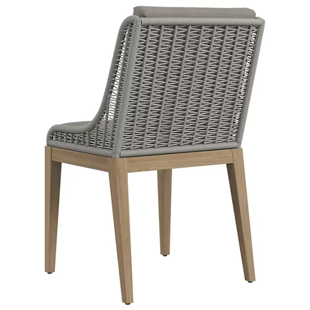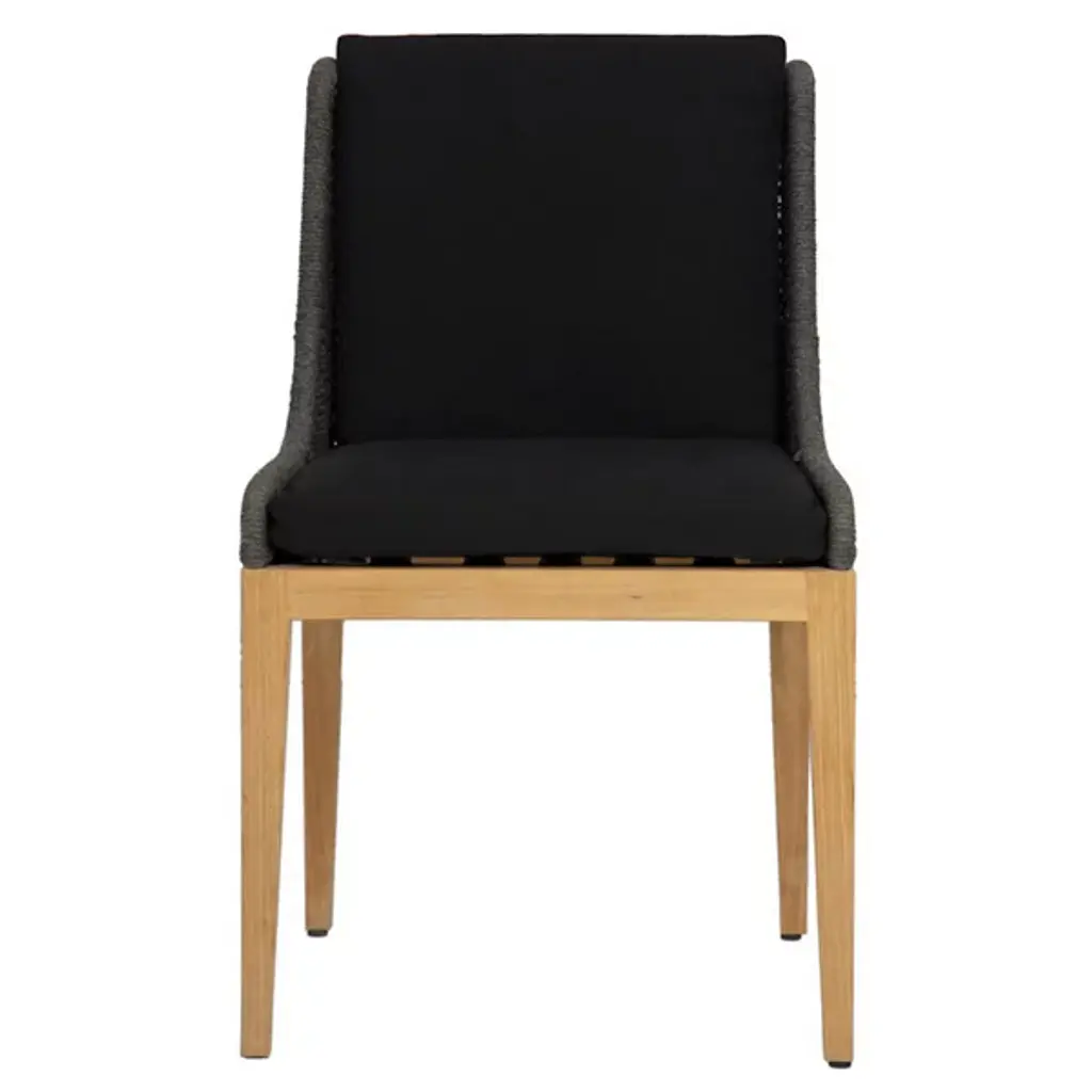 Keep things comfortable with the Sorrento Outdoor Dining Chair from Sunpan, an Indonesian-made construct resting on teak wood legs and a seat base; it uses a weave set around a powder-coated aluminum frame to act as the seat sides and back. The weave gives the seat a clever coastal touch, while a seat and back of quick-drying foam sit beneath a polyester envelope, easily able to resist weather, wind, and sun.