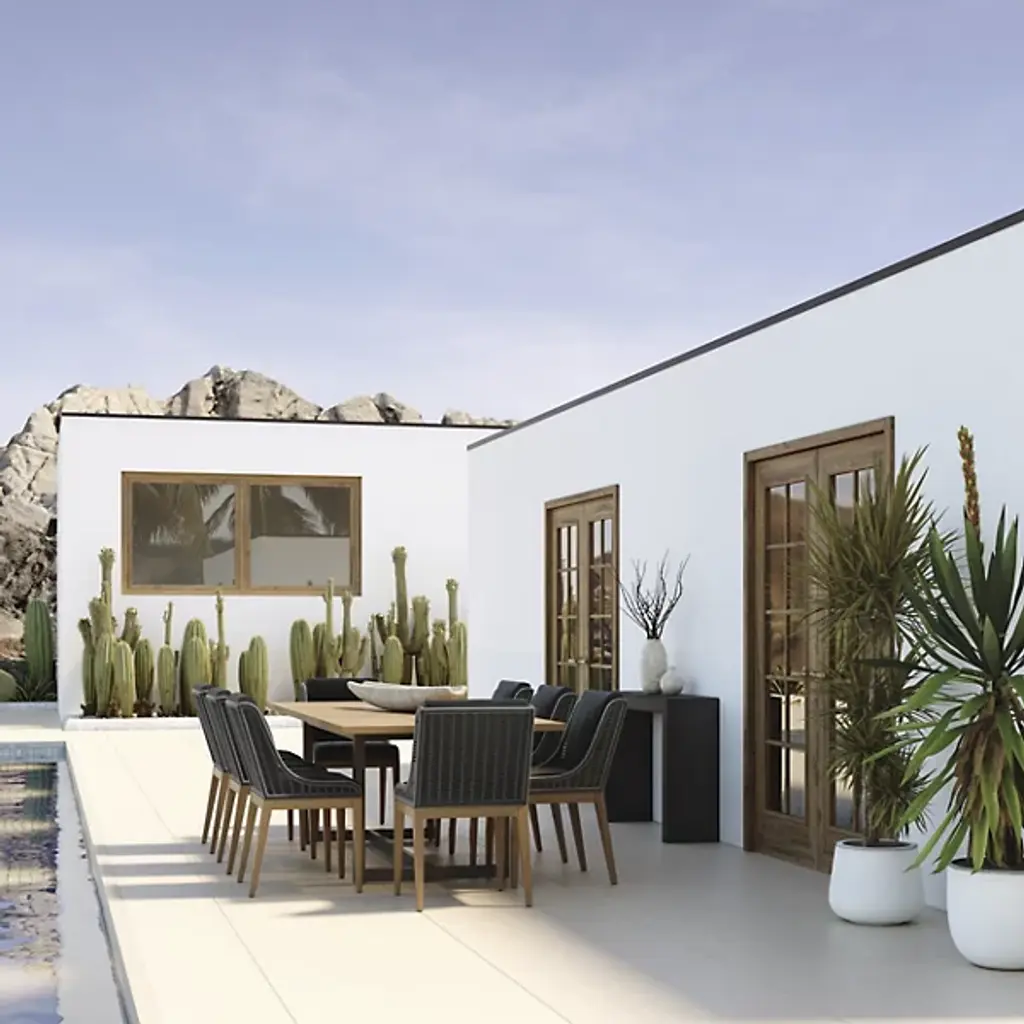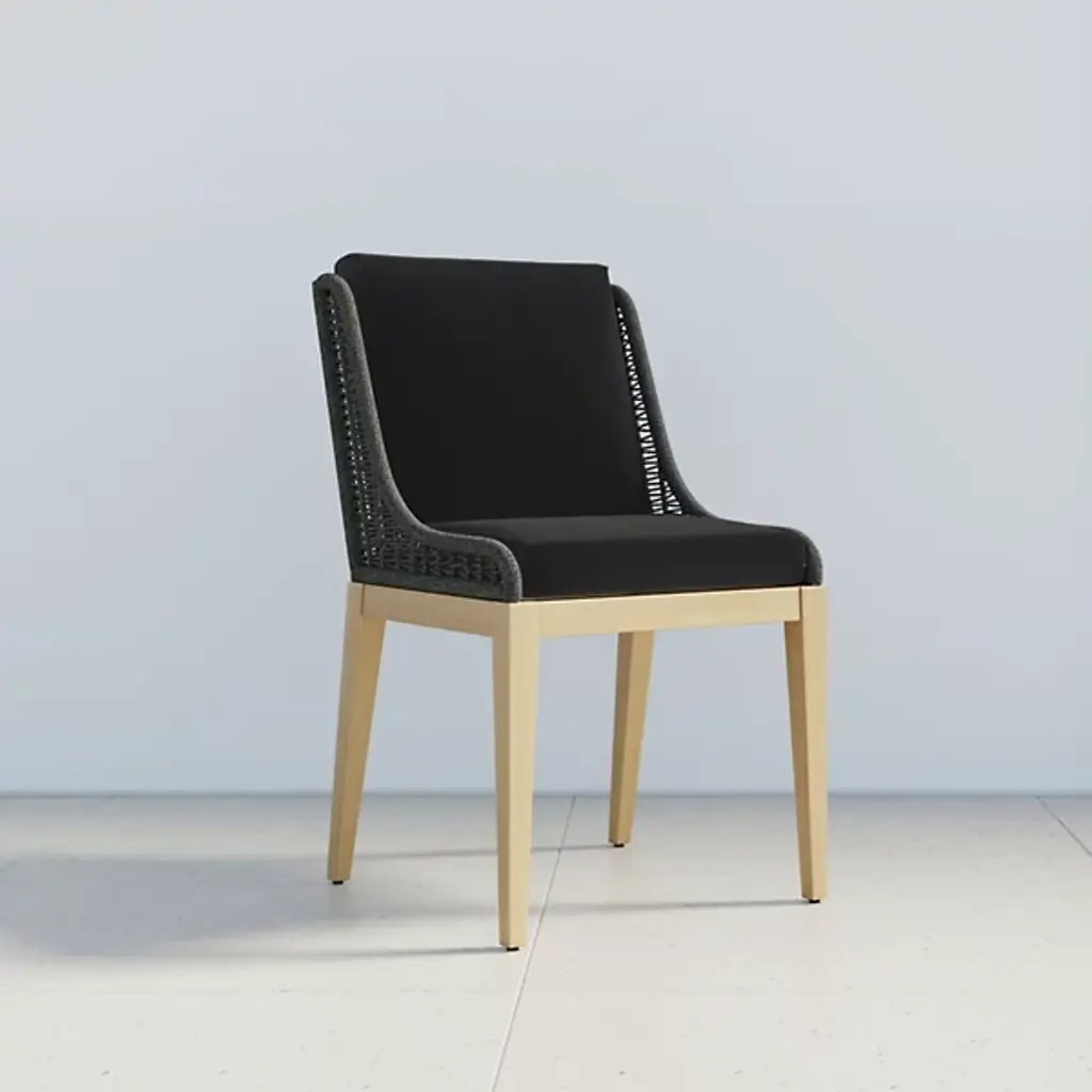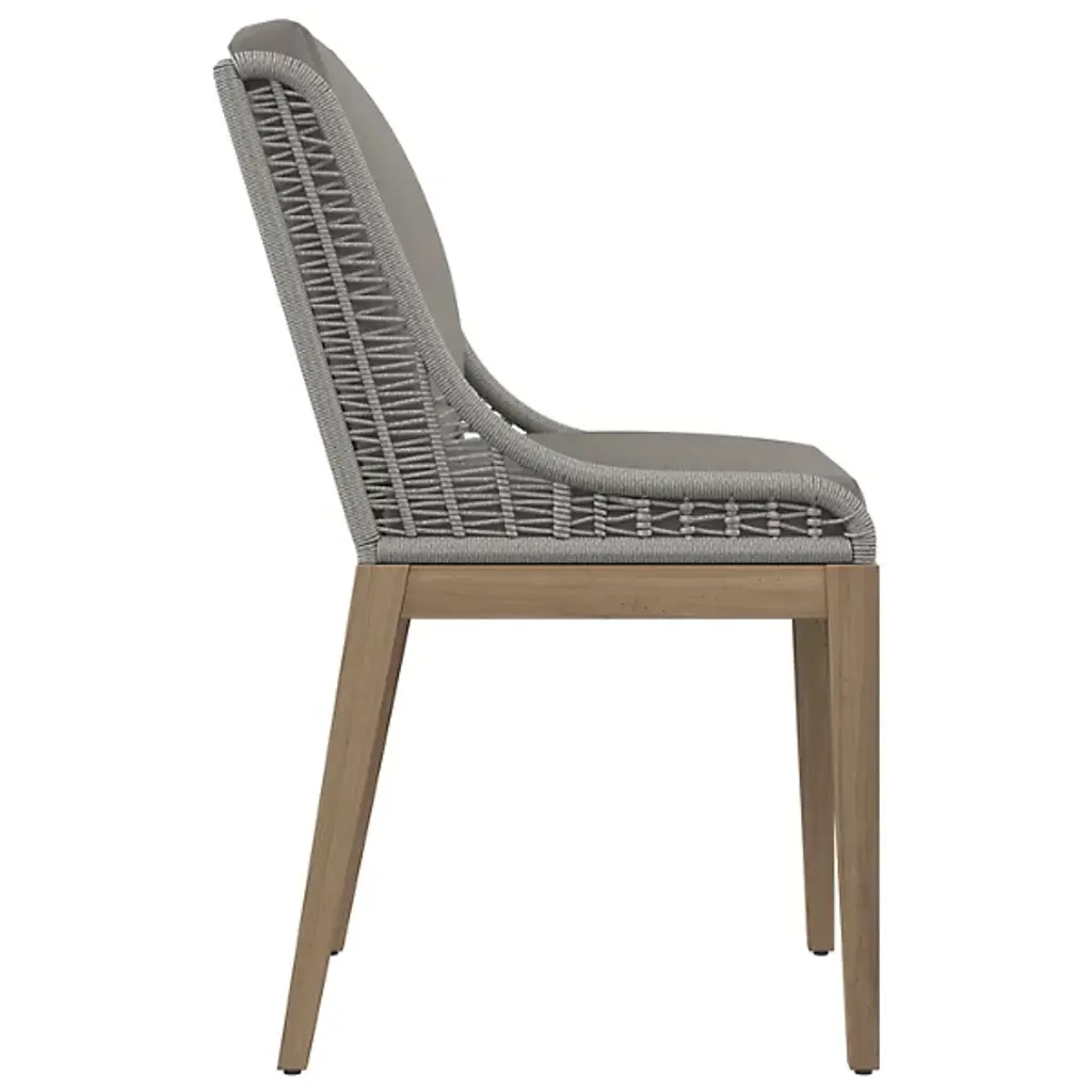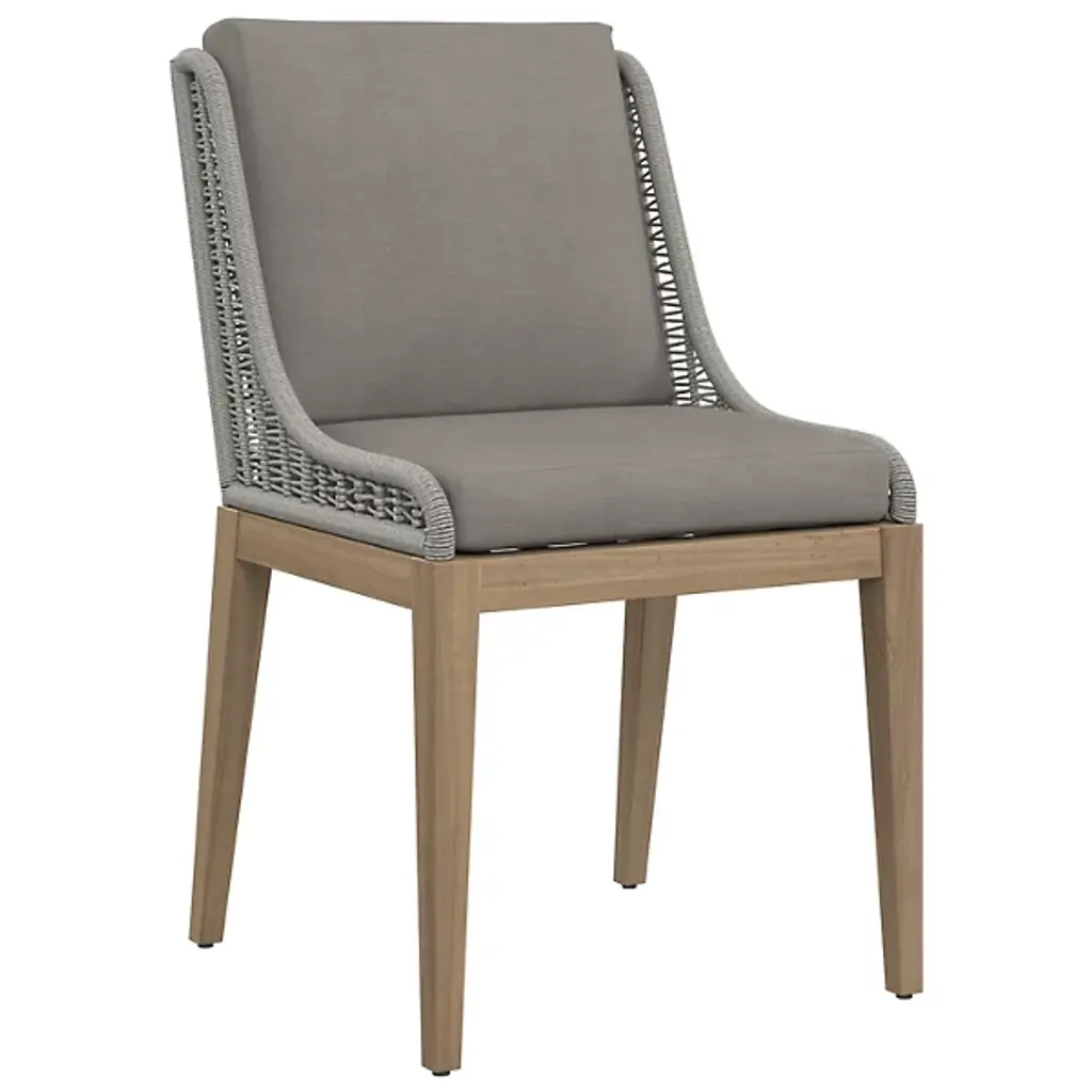 Keep things comfortable with the Sorrento Outdoor Dining Chair from Sunpan, an Indonesian-made construct resting on teak wood legs and a seat base; it uses a weave set around a powder-coated aluminum frame to act as the seat sides and back. The weave gives the seat a clever coastal touch, while a seat and back of quick-drying foam sit beneath a polyester envelope, easily able to resist weather, wind, and sun.