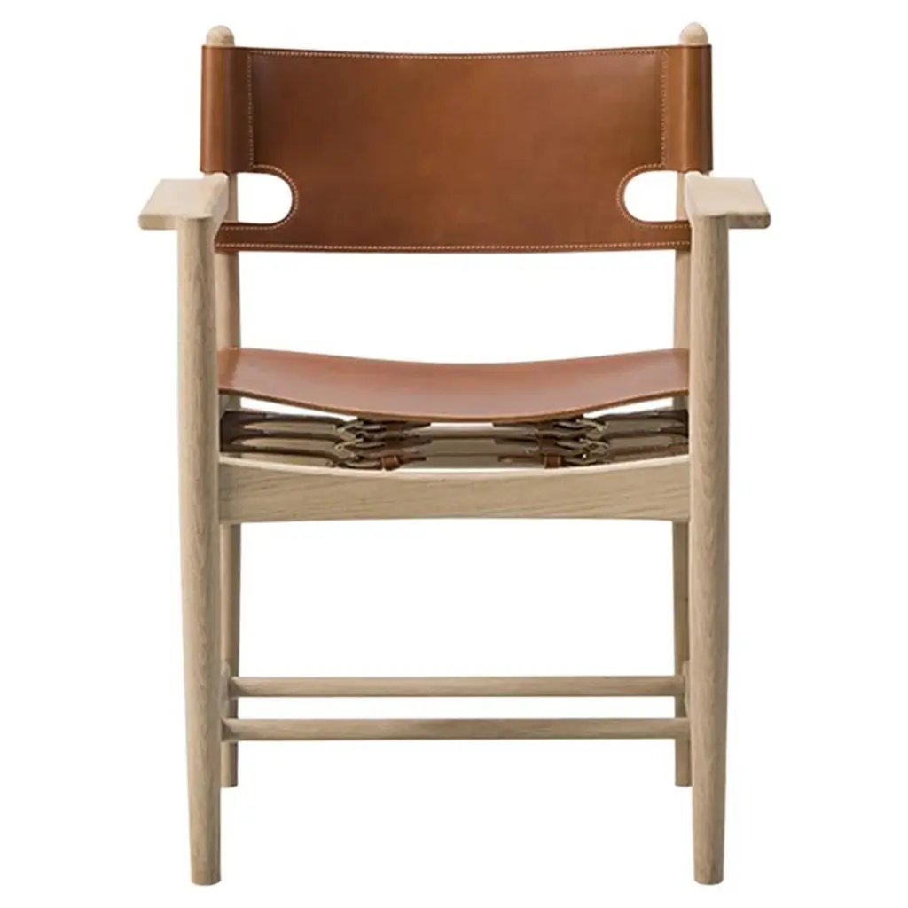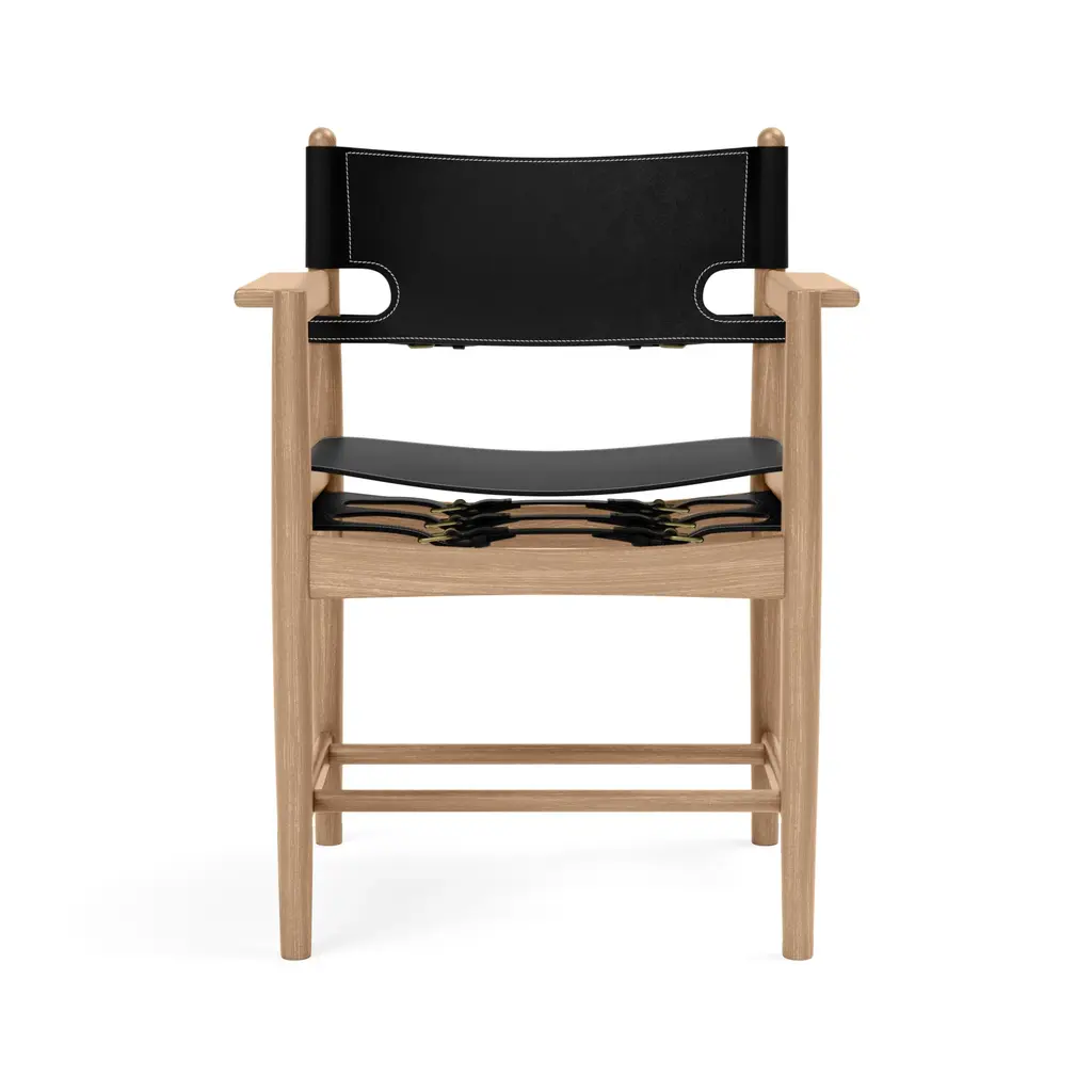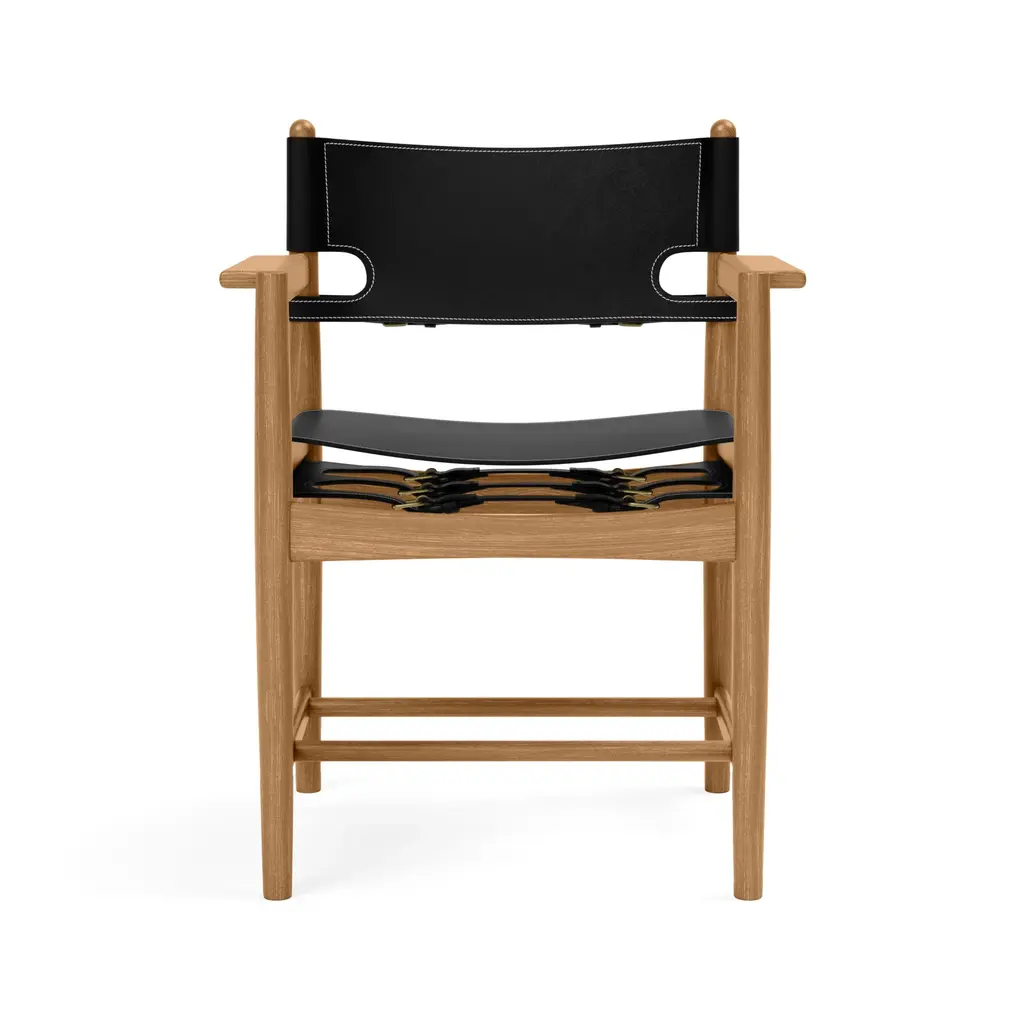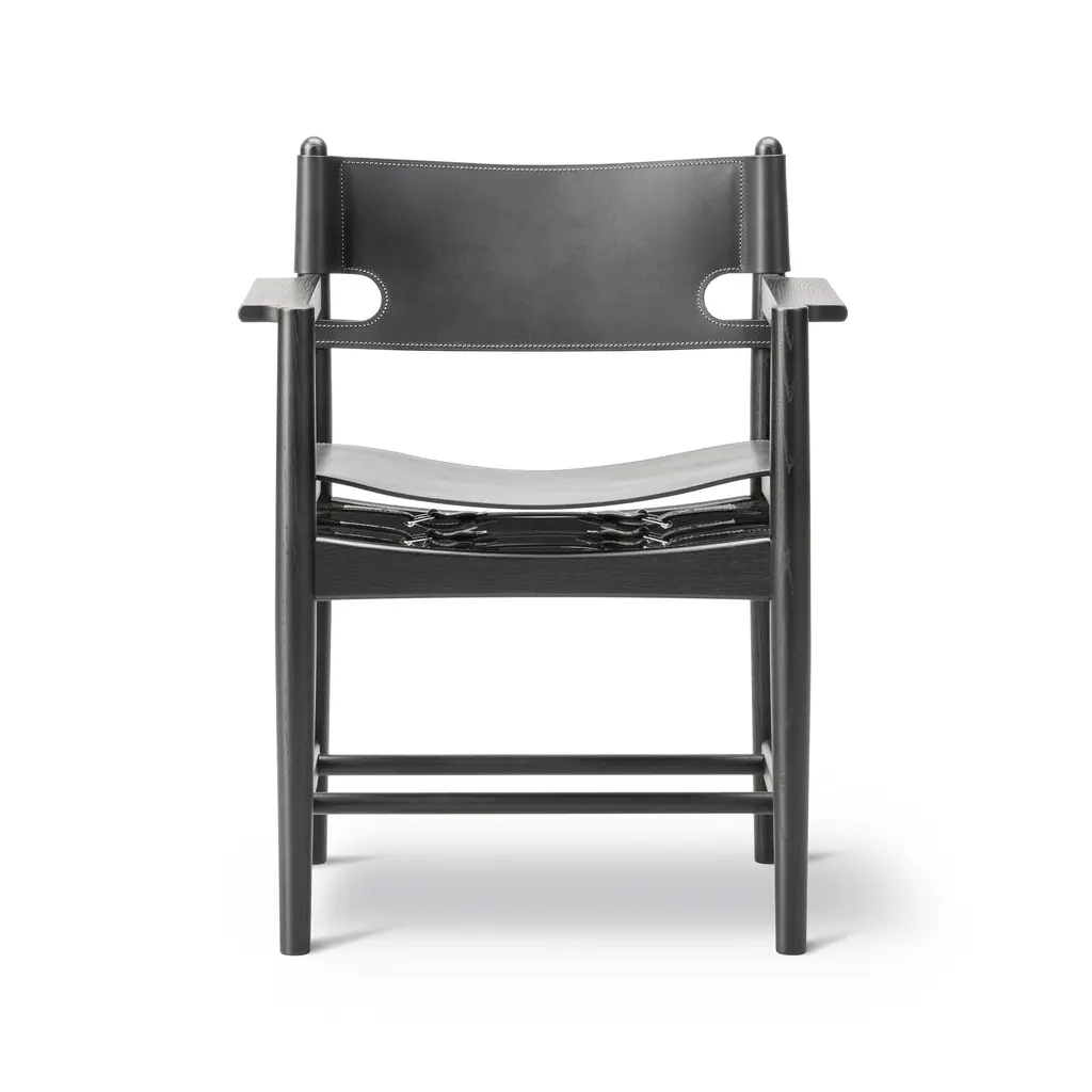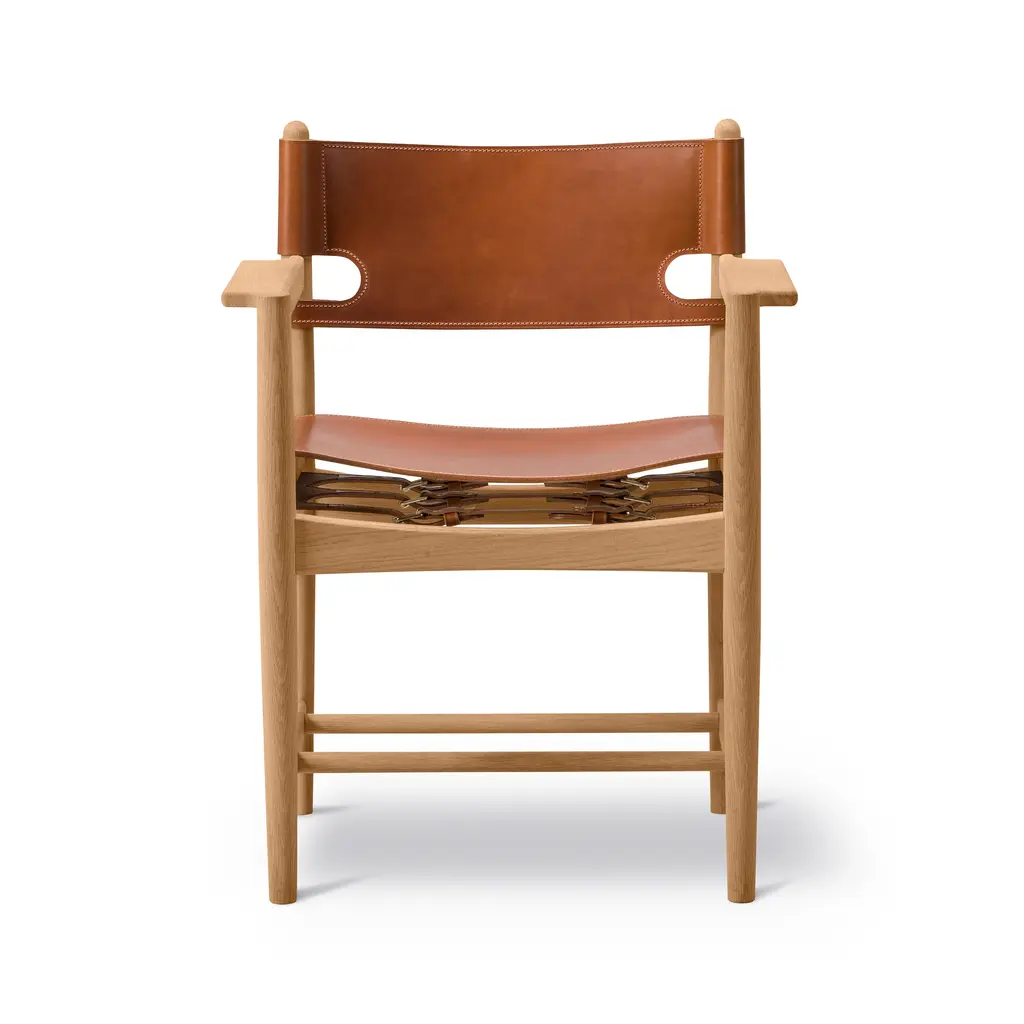 Designed by Børge Mogensen with a focus on human-centered and lasting craftsmanship, the Spanish Dining Armchair from Fredericia Furniture, masterfully elevates any interior. Crafted from sustainably-sourced solid wood and high-quality saddle leather, it's unique form is as functional as it is beautiful. As the leather stretches over time, hidden adjustable straps allow for a personalized and comfortable fit. Highlights