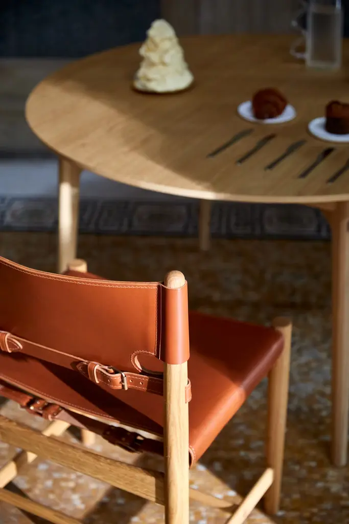 Børge Mogensen aimed to produce furniture that would be a pleasure to interact with and last for generations. His human-centered approach and focus on craftsmanship are evident in his well-known Spanish Dining Chair (1958). The chair is beautifully crafted in solid wood with the finest quality saddle leather seat and back. It's designed so that over time and with use, as the leather stretches, adjustable straps beneath the seat can be tightened. Made in Denmark.