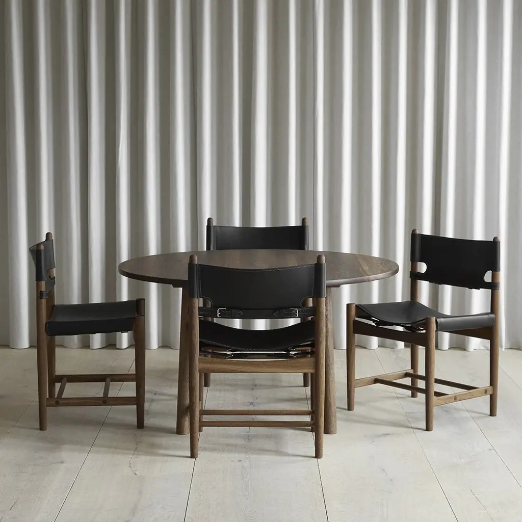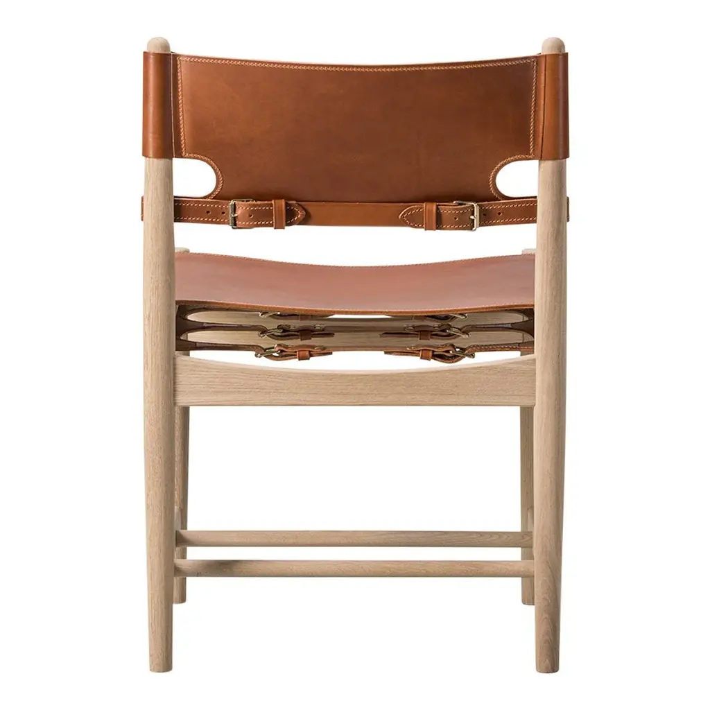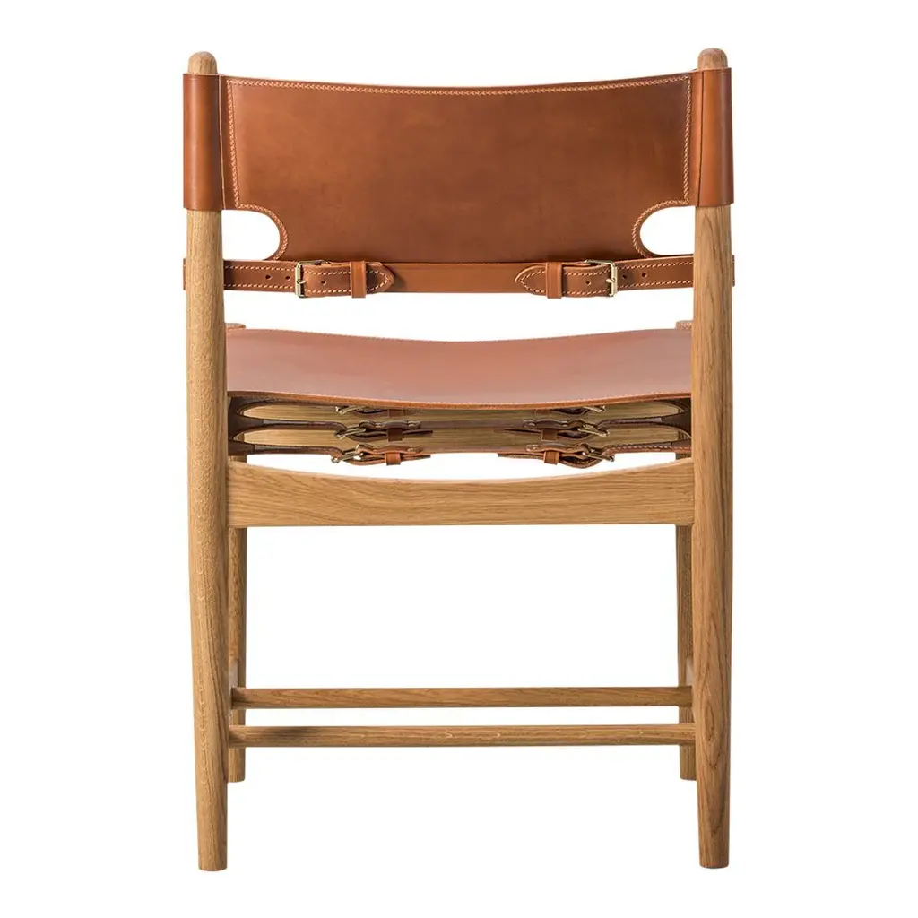 The Spanish Dining Chair brings Borge Mogensen's timeless design to the dining room. It is a testament to the application of honest materials. Crafted from the finest selection of oak and flawless saddle leather, the chair is available with or without armrests, and with multiple finishes from light to darker shades, depending on the atmosphere you want to create.