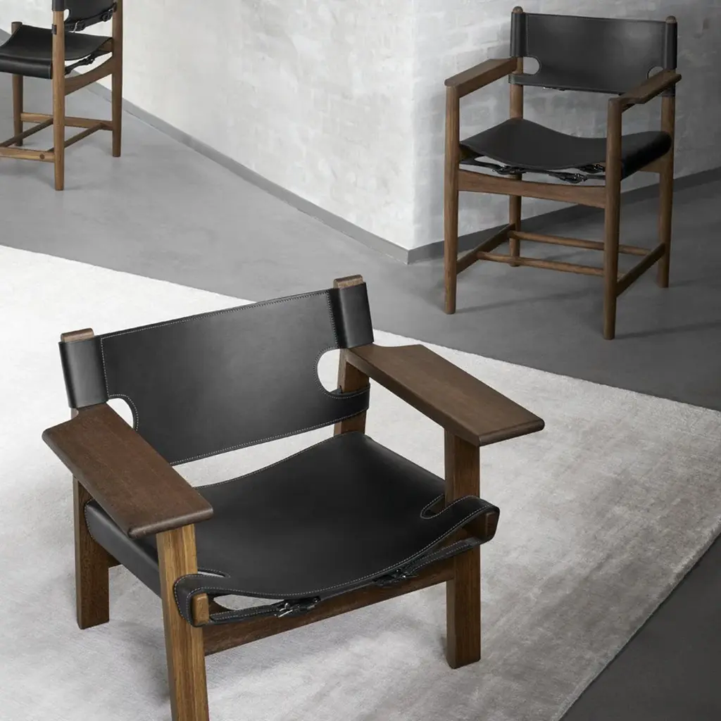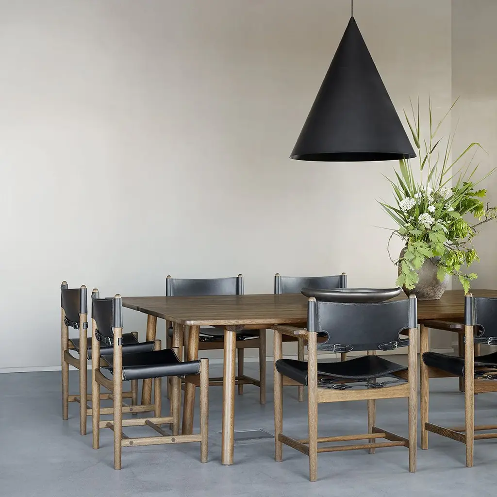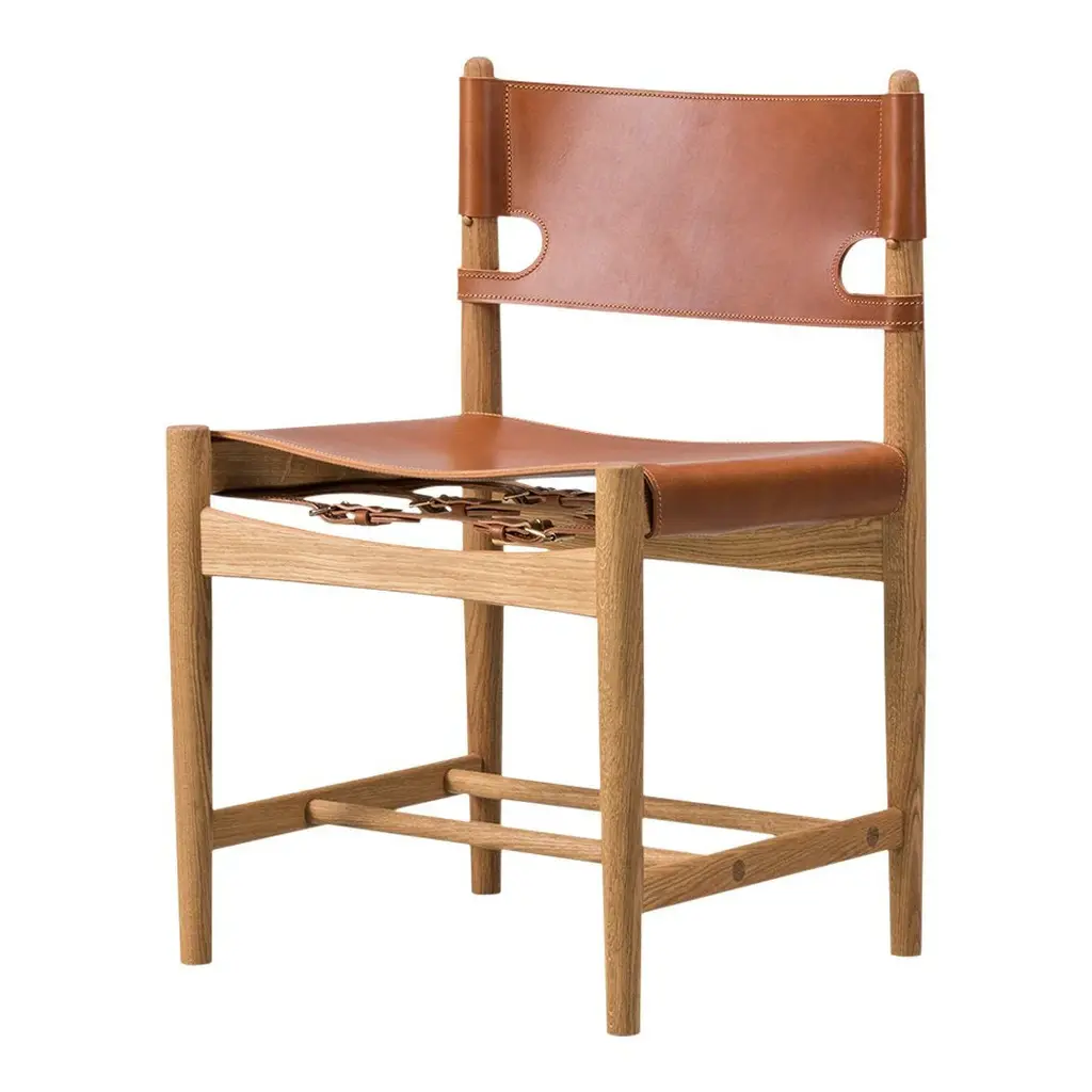 The Spanish Dining Chair brings Borge Mogensen's timeless design to the dining room. It is a testament to the application of honest materials. Crafted from the finest selection of oak and flawless saddle leather, the chair is available with or without armrests, and with multiple finishes from light to darker shades, depending on the atmosphere you want to create.