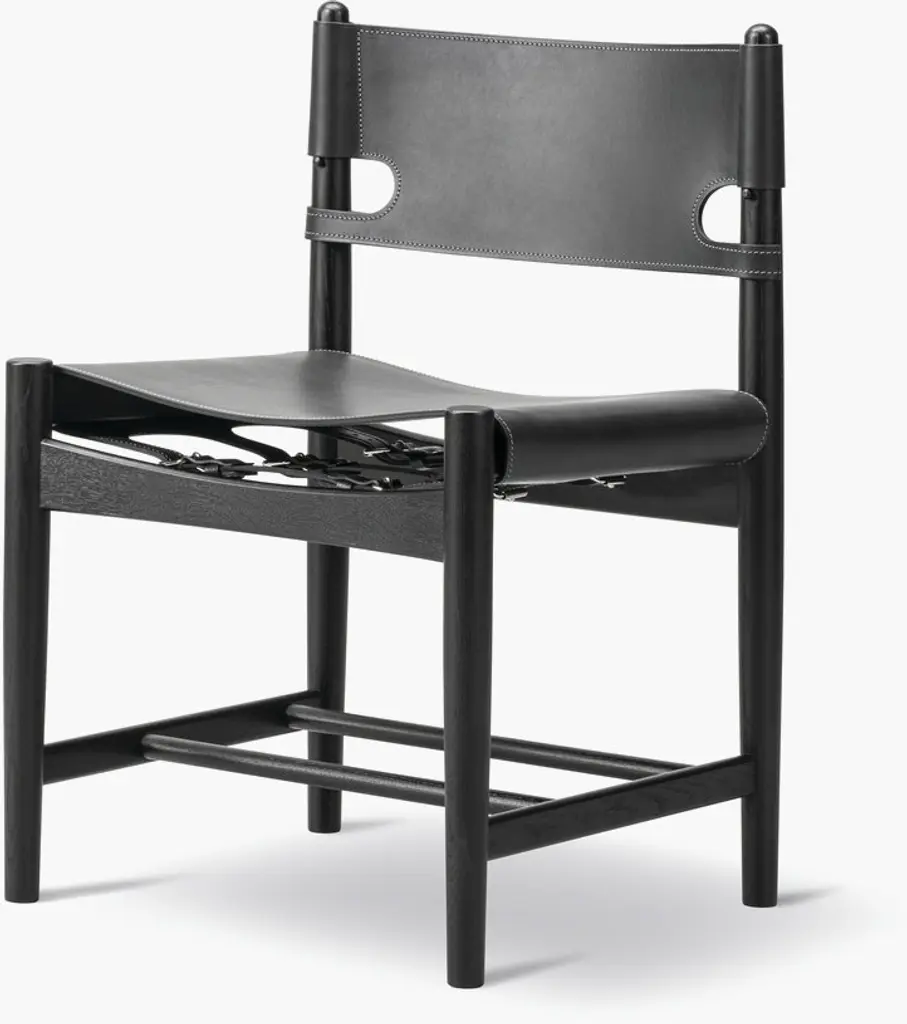 Børge Mogensen aimed to produce furniture that would be a pleasure to interact with and last for generations. His human-centered approach and focus on craftsmanship are evident in his well-known Spanish Dining Chair (1958). The chair is beautifully crafted in solid wood with the finest quality saddle leather seat and back. It's designed so that over time and with use, as the leather stretches, adjustable straps beneath the seat can be tightened. Made in Denmark.