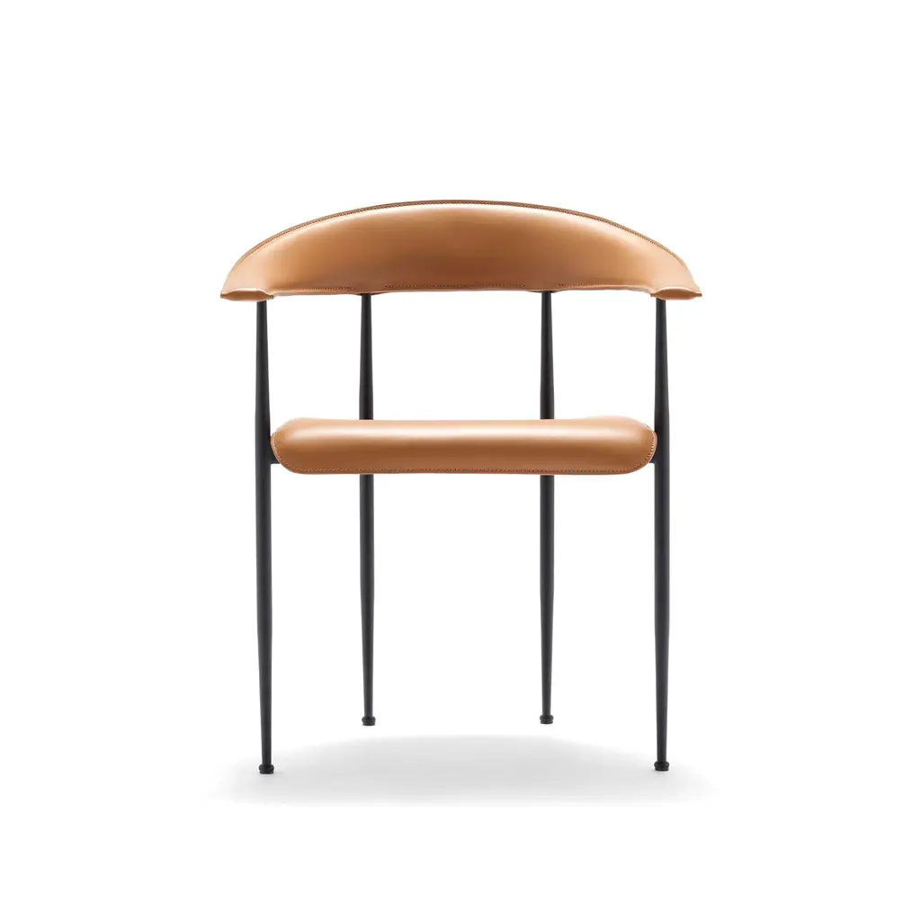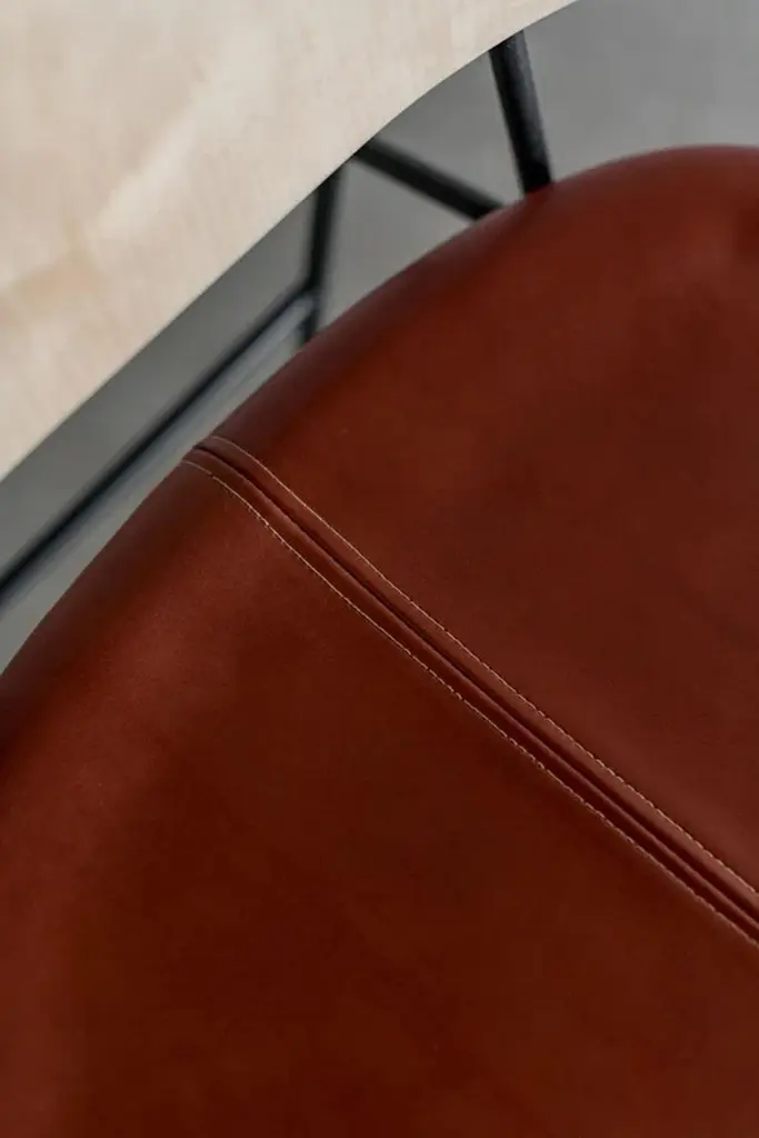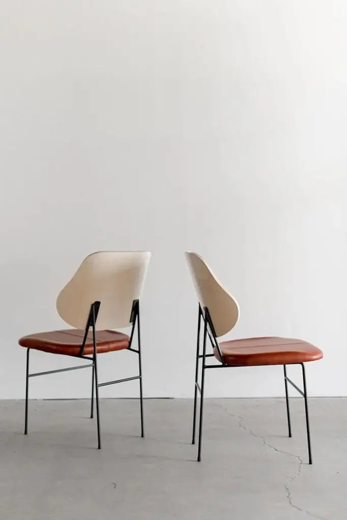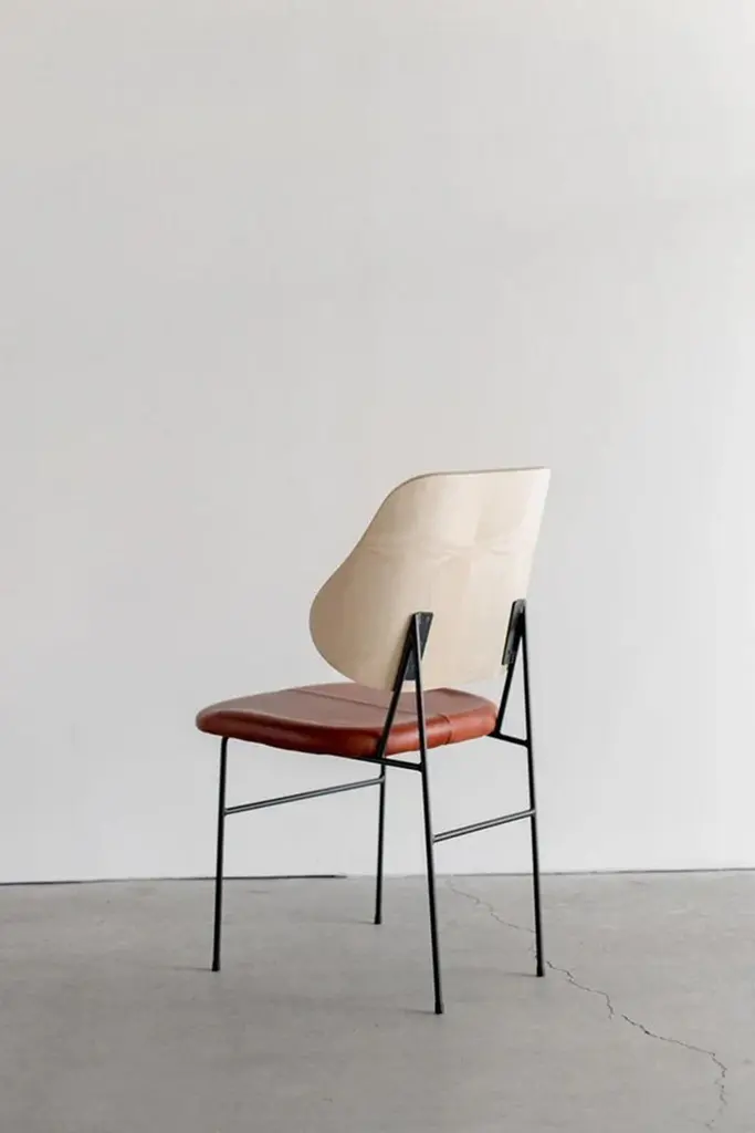 Our take on the classic Penguin Chair by Ib Kofod-Larsen. This Dining Chair is Custom Made in Los Angeles. Metal frame is welded. Maple back is bent and formed to shape by hand. Upholstered leather seat.INDUSTRIAL STEEL + BIRCH + LEATHER + MAPLE VENEER POLY FINISHCustomiztion: specializes in handmade, quality furniture to fit your space. Each piece is made to order in our downtown Los Angeles workroom which allows for a truly tailored experience. Personalization can include a change in size, orientation, design elements and much more. We offer a variety of leather and fabric options and welcome COM, COL and COH (for trade members only). The specific customization options available will depend on the product..For all furniture, protection from heat and moisture is crucial to the longevity of the piece. To help prevent scratches, use adhesive felt pads, coasters, placemats, and avoid sliding objects across the surface of the piece when possible.Lacquer + Paint + Metal Surfaces - Dry dust with a clean microfiber or feather duster. Wipe with a slightly damp microfiber towel and mild cleaner as needed. Wipe dry promptly.We recommend that you clean with ammonia-free Windex or a mild surface cleaner. Please stay away from bleach, alcohol, or petroleum based cleaners. You may use a general purpose wood cleaner.Avoid using furniture polish as over time it can accumulate and leave a residue.Wax + Oil Finish - Dry dust with a clean microfiber or feather duster. Wipe with a slightly damp microfiber towel. Wipe dry immediately. Clean with ammonia-free Windex or a mild surface cleaner. Stay away from bleach, alcohol, or petroleum based cleaners. Our natural wax and oil finishes will dull over time. Wax or teak oil may be reapplied as needed using a soft white cloth. Raw Wood - Dry dust with a clean microfiber or feather duster. Use a damp microfiber towel or soft brush as needed.Do not use any product containing wax or oil to clean.Outdoor Furniture - Outdoor furniture may require frequent oiling. A cover is strongly recommended for all outdoor furniture. Avoid prolonged exposure to moisture and/or direct sunlight.If exposed to rain, allow cushions to air dry completely before putting them back on the frame. Leather Care - Dry dust with a clean microfiber or feather duster. Wipe with a slightly damp microfiber towel. Do not use cleaning products on the leather. The recommended leather conditioner is Skidmore’s Original Leather Cream. Marble + Stone - Dry dust with a clean microfiber or feather duster. Wipe with a slightly damp microfiber towel. Wipe dry immediately. For daily cleaning we recommend using Orange Glo and/or Method Stone Cleaner on the marble. All marble and stone surfaces are protected with a sealer. To maintain the overall appearance and protection of the marble or stone, reseal with Miracle 511 Seal & Enhance. It is important to use coasters and clean up moisture immediately on marble and stone surfaces. Additional information:Dimensions: 21"W + 24 1/2"D + 37"H