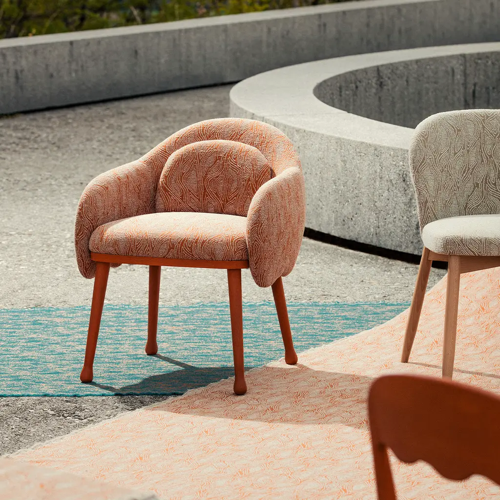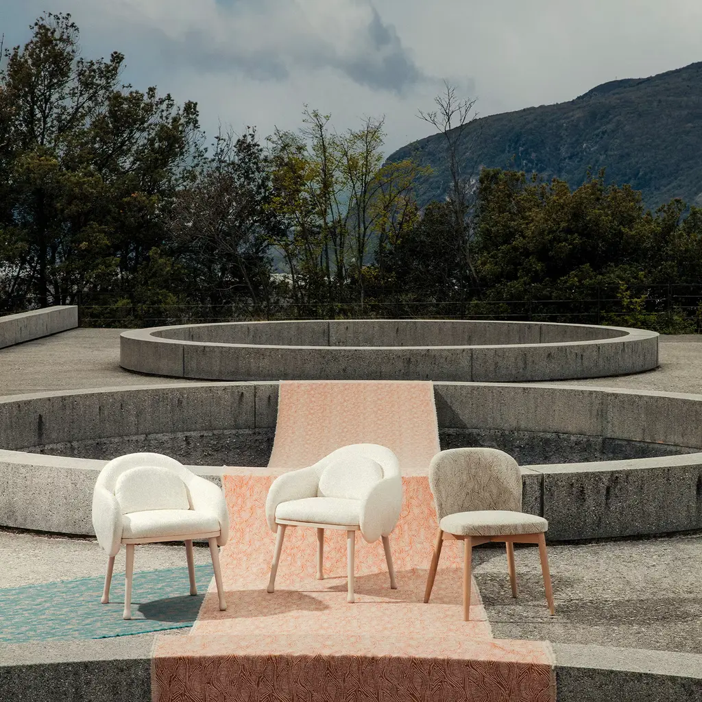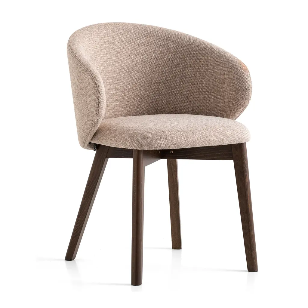 A luxurious design intriguing in its tailored detailing, this plush chair is sure to uplift the look of any modern dining room. The structure in solid beech offered in a natural finish has its tone harmonized with the 48cm-high seat's upholstery (Greto 2628), characterized by an intricate beige pattern of abstract nature.