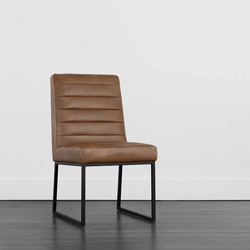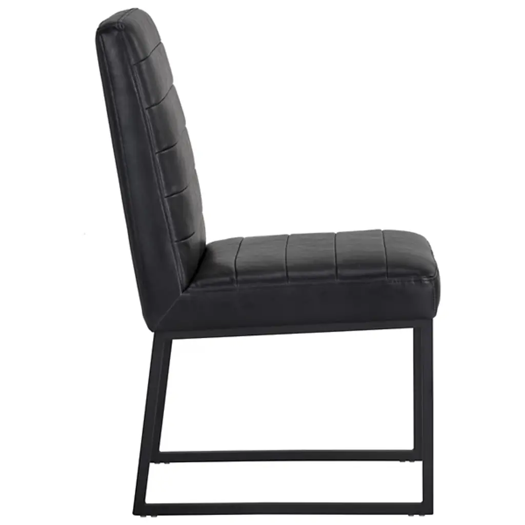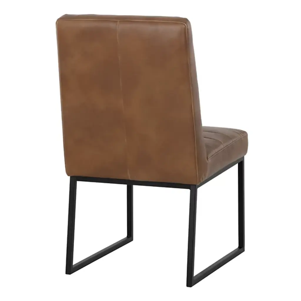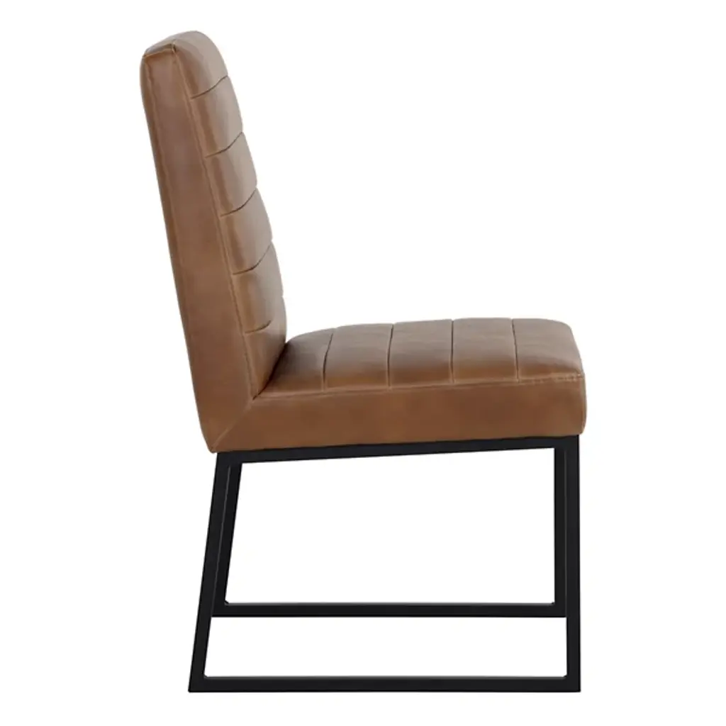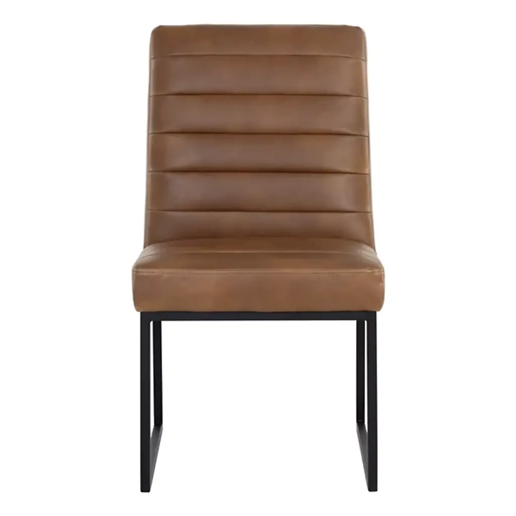 Make a stately retro enhancement to indoor gathering spaces with the commanding lines and robust design of the Spyros Dining Chair, Set of 2 from Sunpan. Solid and squarish, it ascends from two bracket-style iron bases, using a layer of metal to hold a wood frame in place, accompanied by upholstery and surfaced in segmented sheaths of faux leather. Each seat has a unique, expressive surface, contrasting well with the clean-surfaced metal structure below and juxtaposing its airy openness with the solid upper surface.
