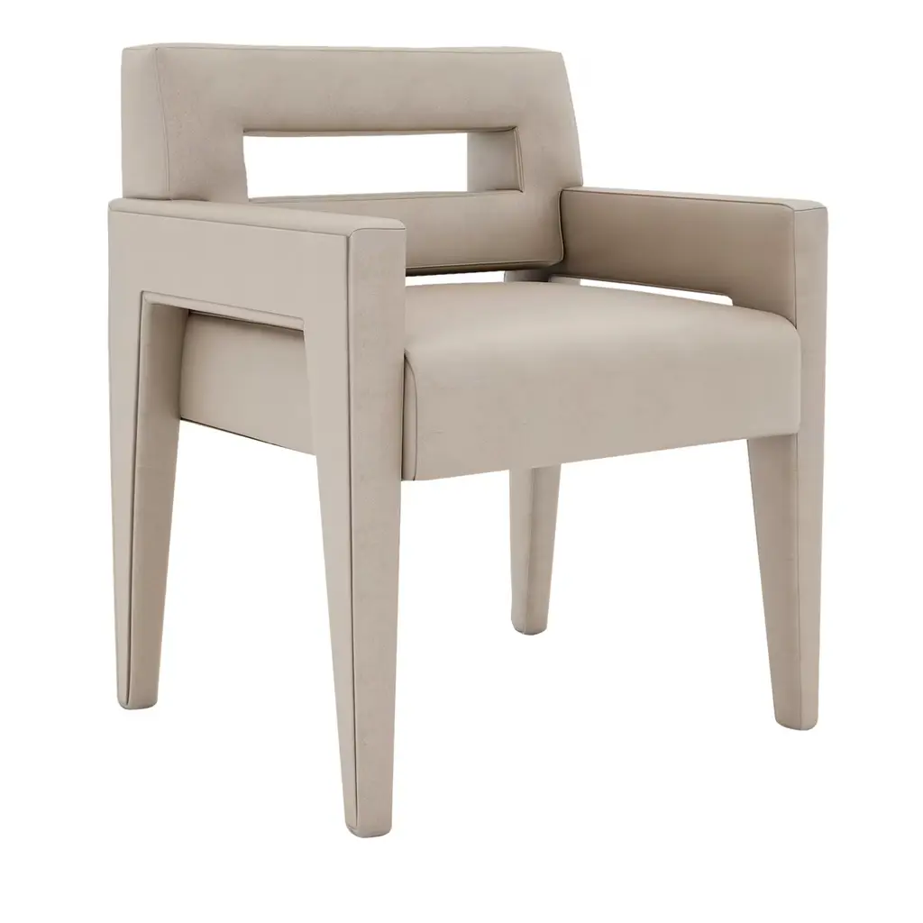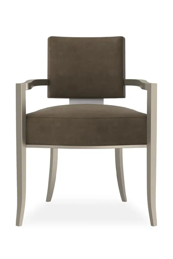 This contemporary armchair takes on dramatic style when you view the wide panel that shines off its back. Neutral fabric fully surrounds the square upper back and seat cushion that rest on an exposed wood frame, sabre legs and gracefully curving arms finished in Soft Silver Paint. This is a low, klismos chair with truly polished appeal.