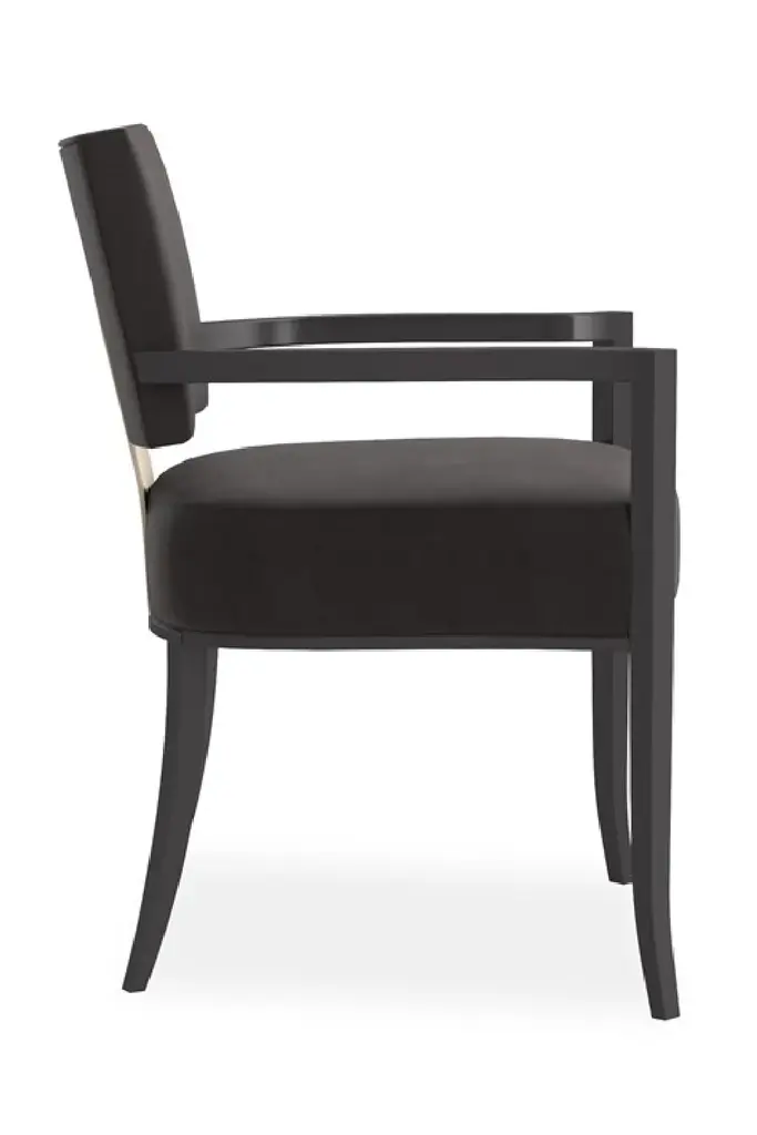 This contemporary armchair takes on dramatic style when you view the wide panel that shines off its back. Neutral fabric fully surrounds the square upper back and seat cushion that rest on an exposed wood frame, sabre legs and gracefully curving arms finished in Soft Silver Paint. This is a low, klismos chair with truly polished appeal.