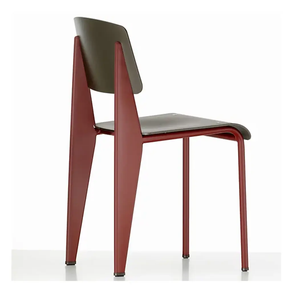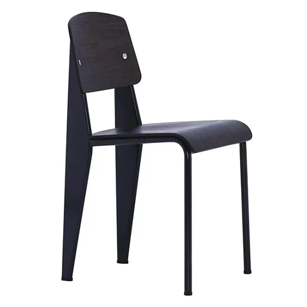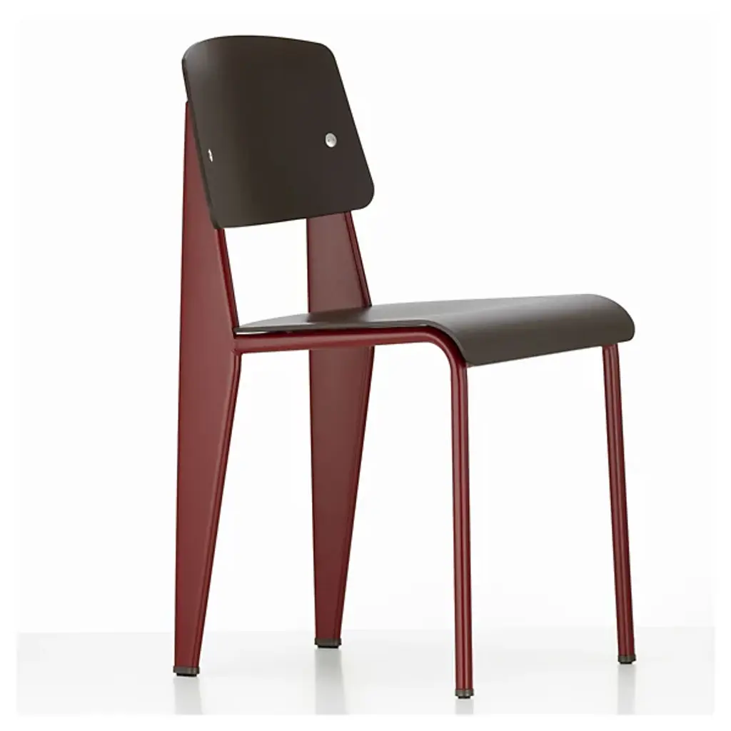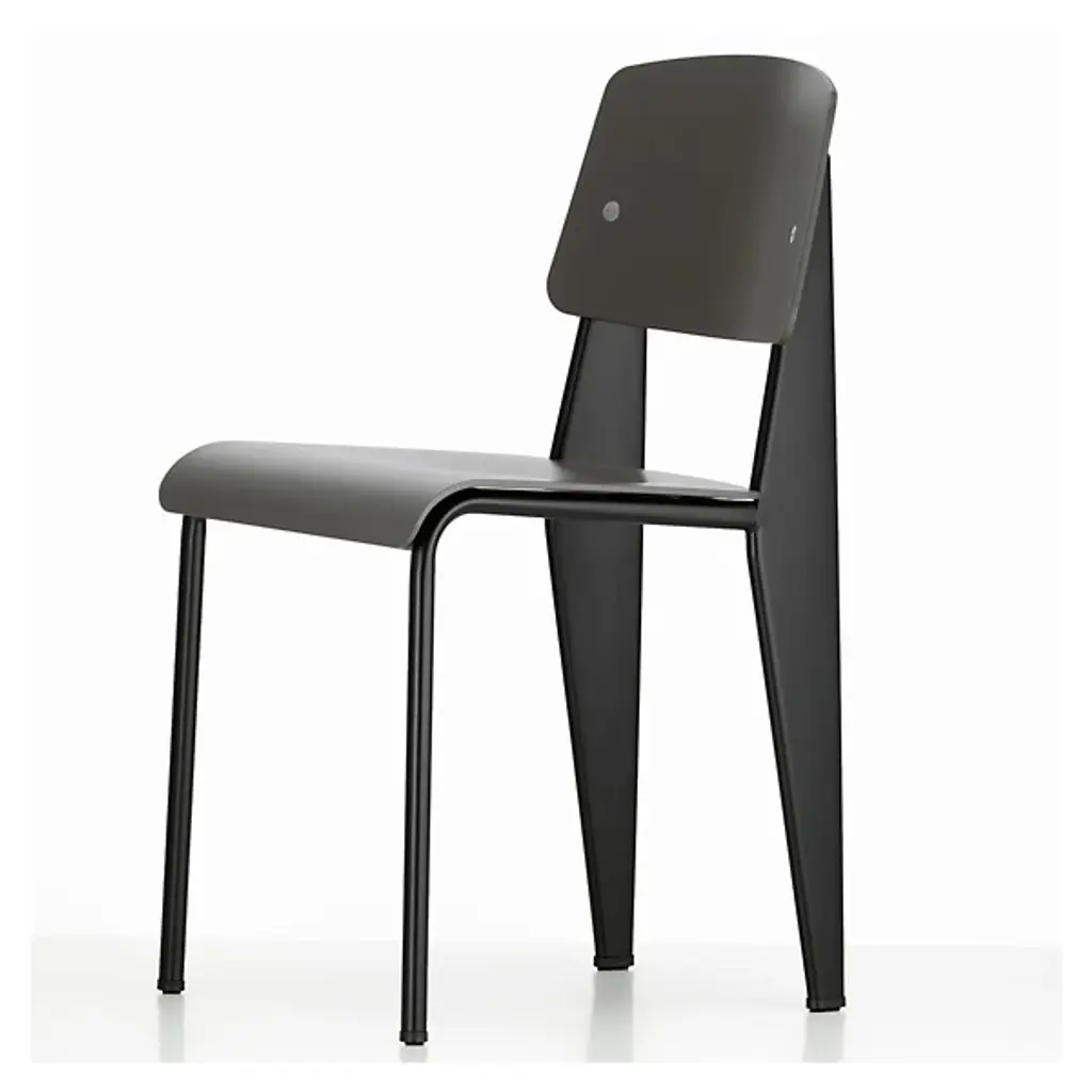 The Vitra Standard Dining Chair is Jean Prouve 101. While certainly a distinctive aesthetic, the lengthy wedge-shaped sheet steel back legs were designed to bear the full weight of a sitter's body. Meanwhile, tubular steel is enough to support the front of the chair. The modern industrial look--and comfort--of this chair is completed by a curved oak wood seat and back.