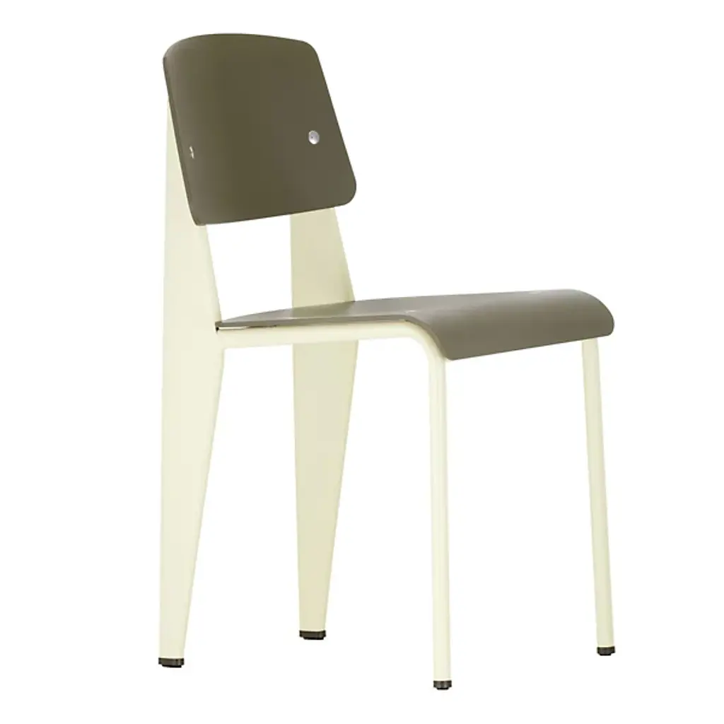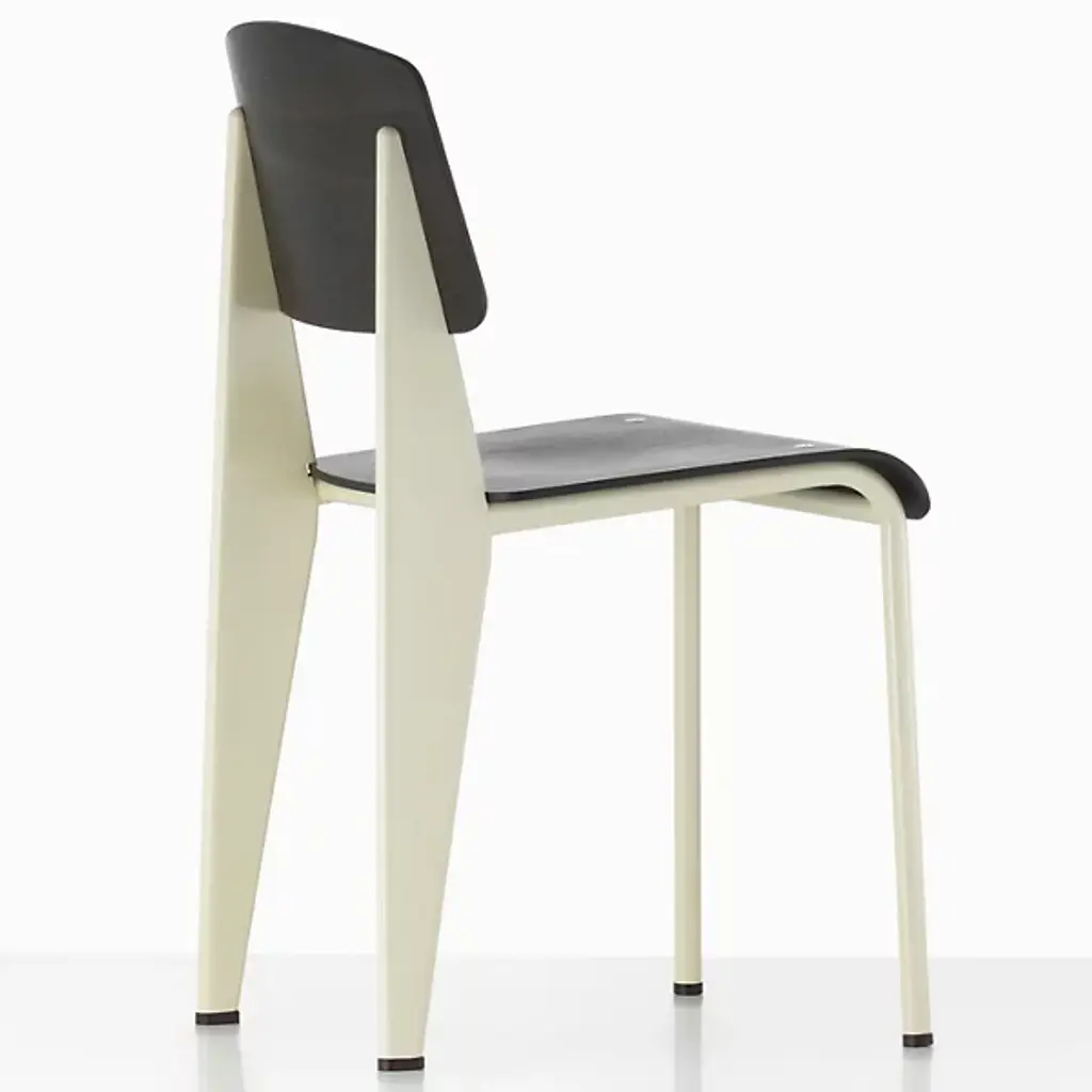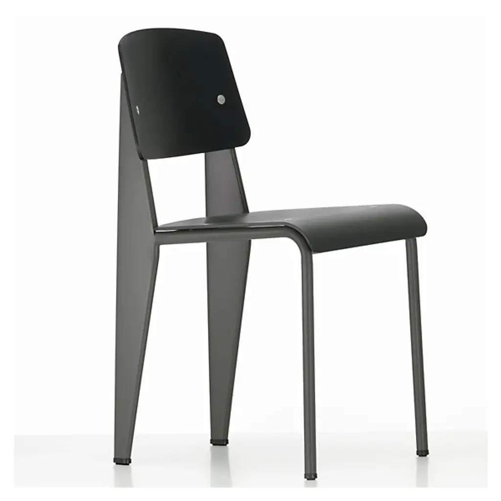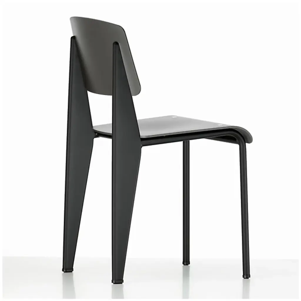 The Vitra Standard Dining Chair is Jean Prouve 101. While certainly a distinctive aesthetic, the lengthy wedge-shaped sheet steel back legs were designed to bear the full weight of a sitter's body. Meanwhile, tubular steel is enough to support the front of the chair. The modern industrial look--and comfort--of this chair is completed by a curved oak wood seat and back.