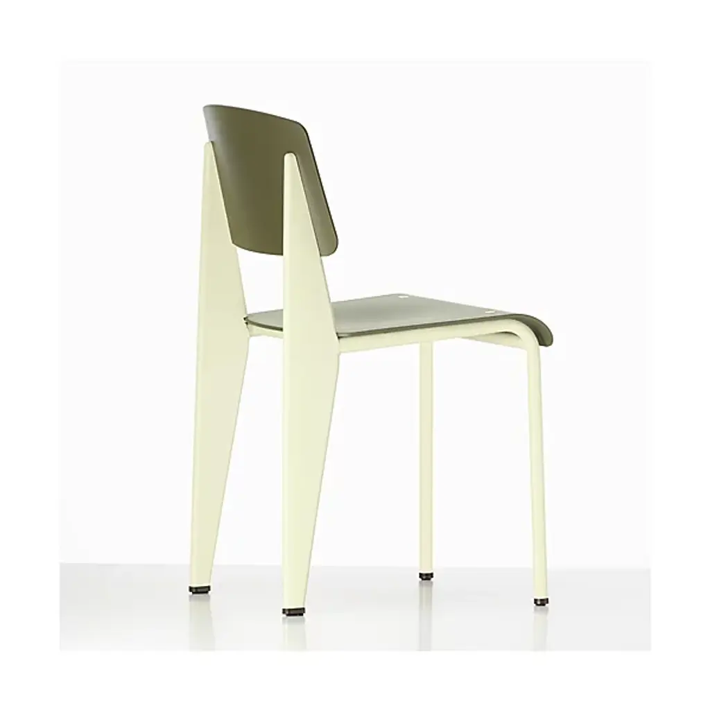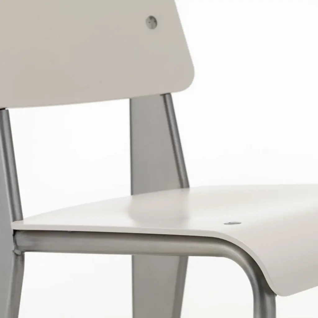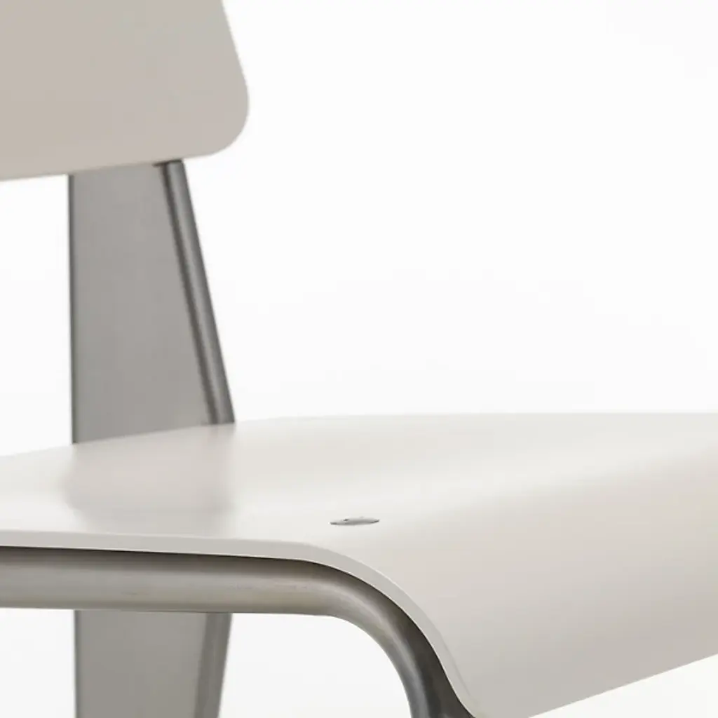The Standard SP Chair brings a contemporary look to a Jean Prouve classic design. Like the original Standard Chair, the Standard SP Chair achieves its unique style by combining different front and back chair legs with a two-tone color palette. Far from just an aesthetic choice, Prouve designed the chair legs to support the varying levels of strain a seated person places on the chair. Taking the brunt of the weight, the rear legs are substantial, yet hollow, to pass any strain from the chair frame to the floor. The lighter impact on the front legs allows the chair to rest on legs crafted from tubular steel piping. A robust plastic seat surface and backrest completes the transformation of this classic side chair.