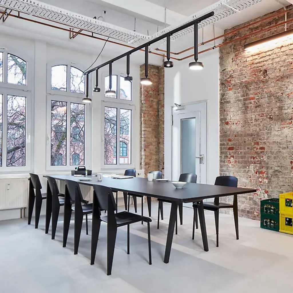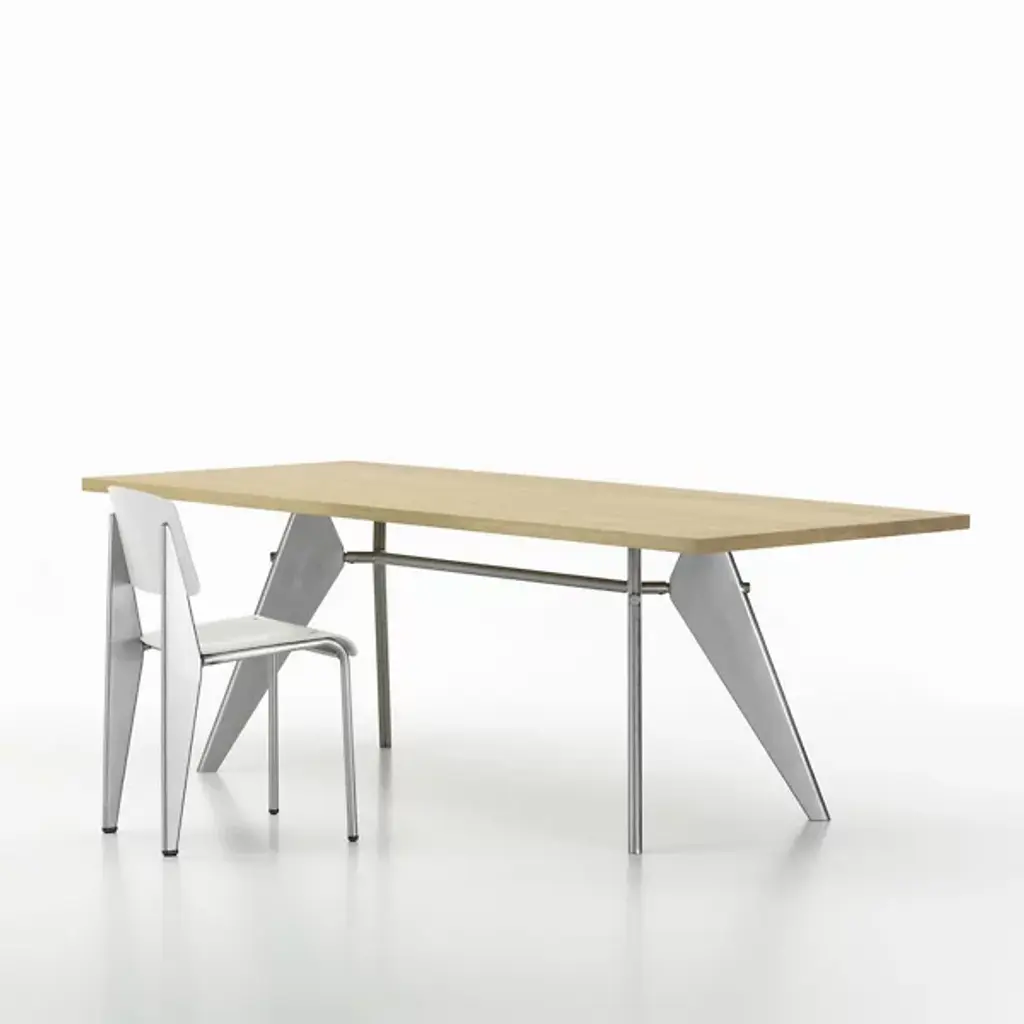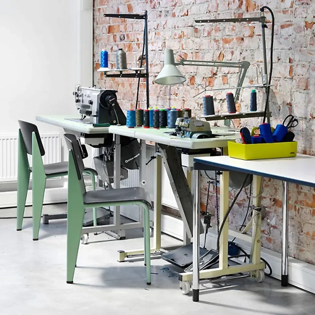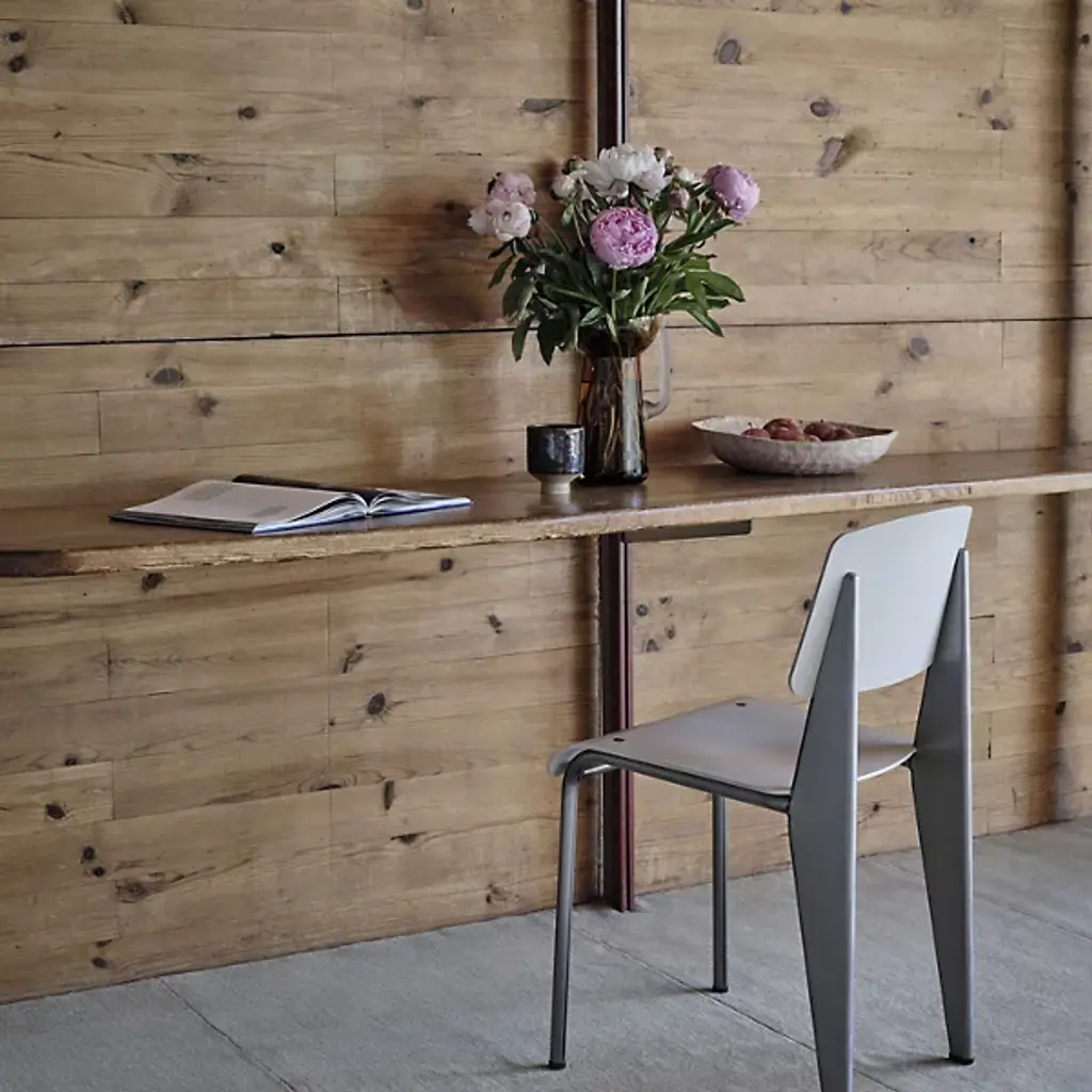 The Standard SP Chair brings a contemporary look to a Jean Prouve classic design. Like the original Standard Chair, the Standard SP Chair achieves its unique style by combining different front and back chair legs with a two-tone color palette. Far from just an aesthetic choice, Prouve designed the chair legs to support the varying levels of strain a seated person places on the chair. Taking the brunt of the weight, the rear legs are substantial, yet hollow, to pass any strain from the chair frame to the floor. The lighter impact on the front legs allows the chair to rest on legs crafted from tubular steel piping. A robust plastic seat surface and backrest completes the transformation of this classic side chair.