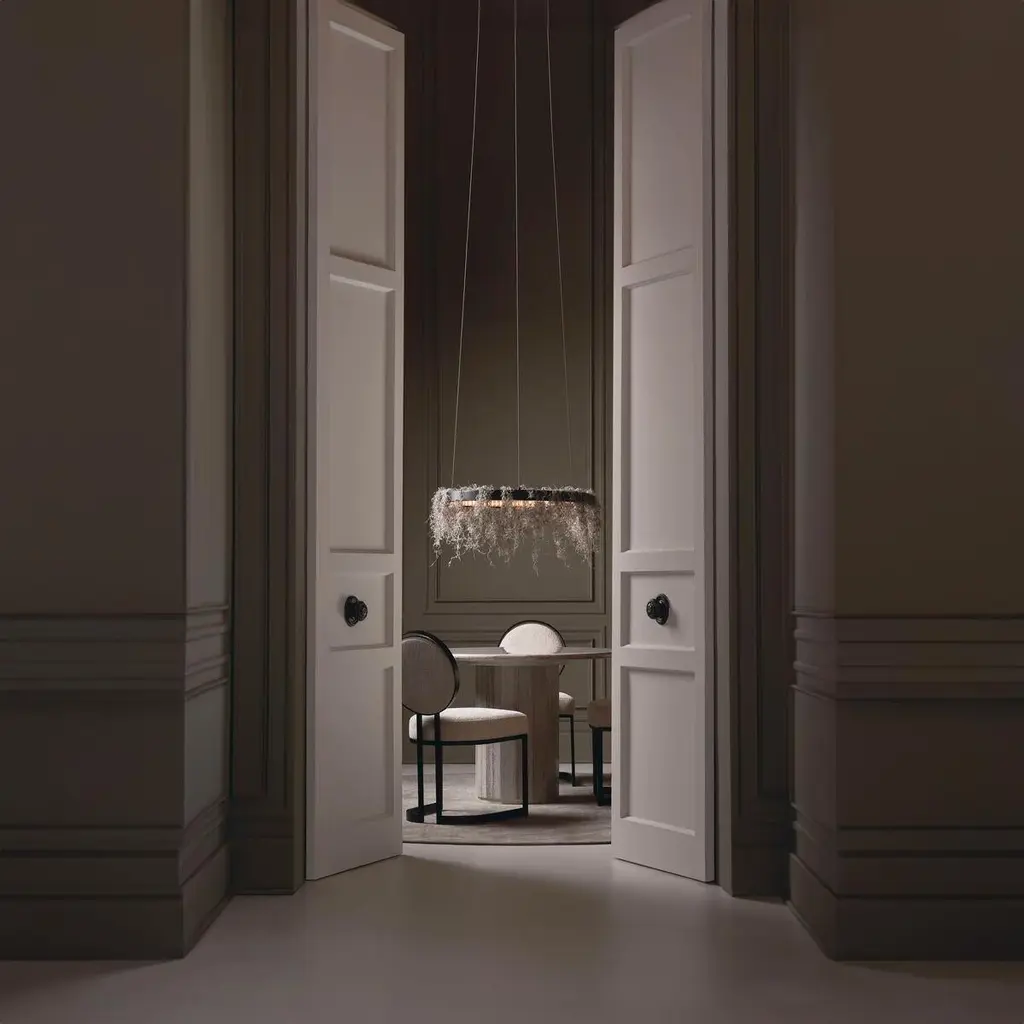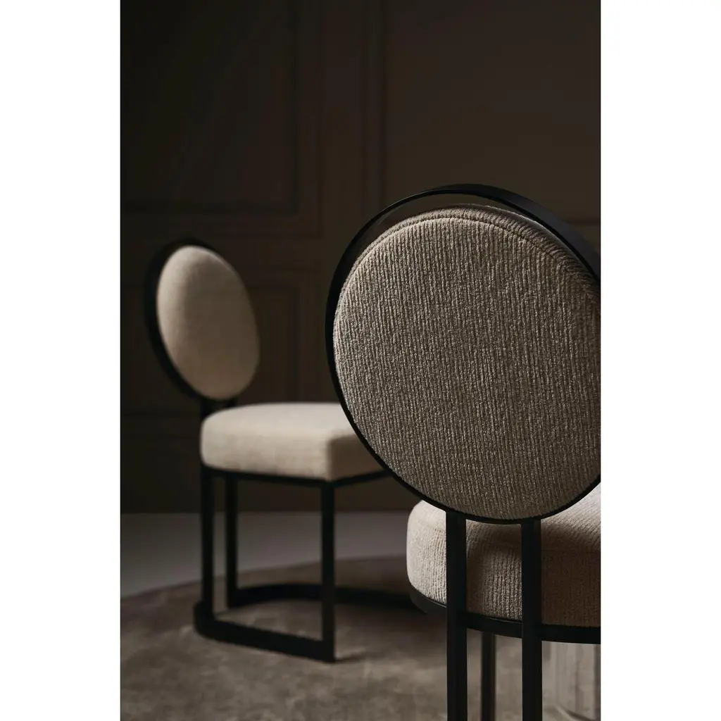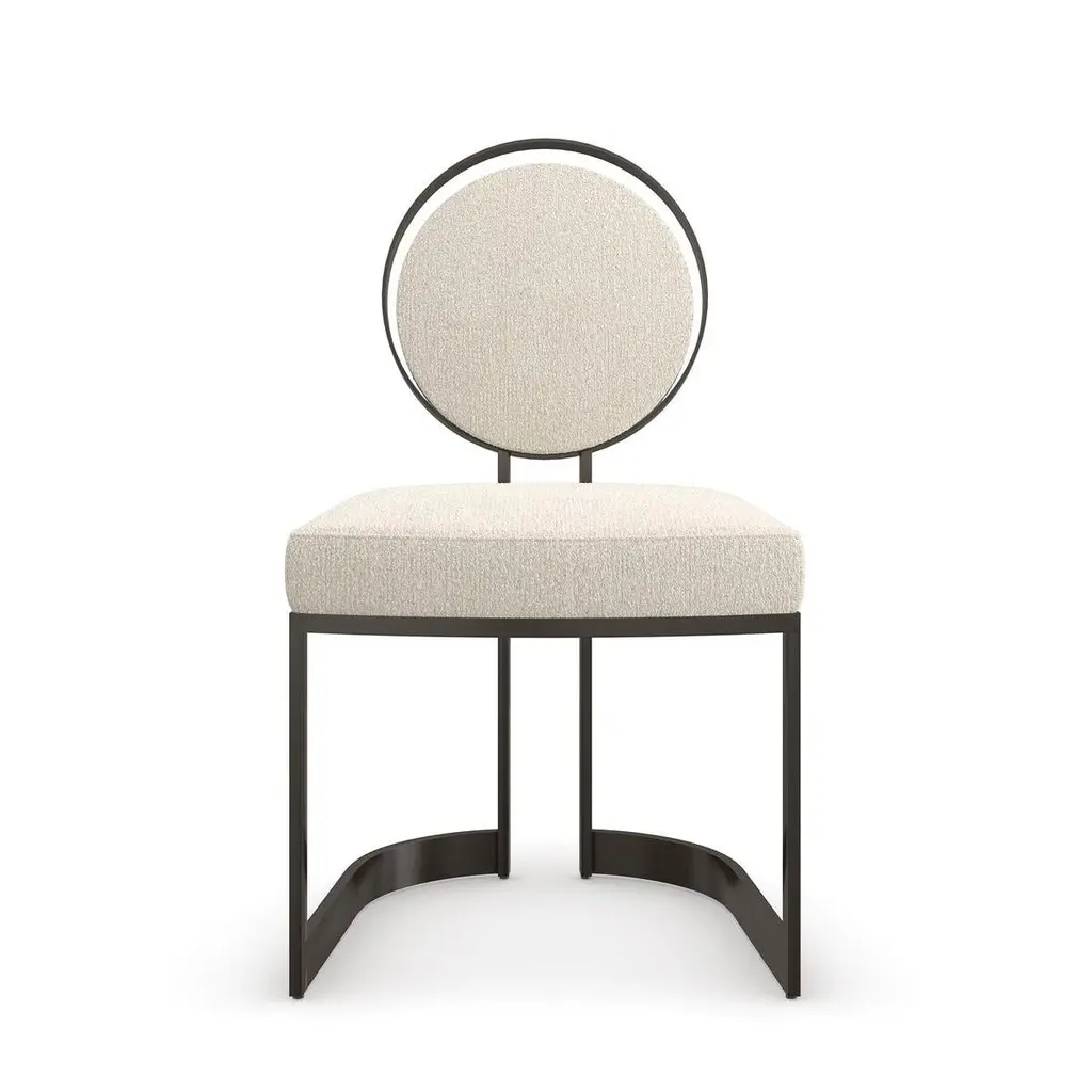 This sculptural metal chair lends an artful element to dining interiors, with a seemingly floating upholstered back set inside a metal circle. A sliver of space around the edges evokes phases of the moon and mimics its crescent-shaped frame. A tactile performance ivory fabric is welcoming to the senses and in dramatic contrast to a rich, Chocolate Bronze finish.Dimensions: 20" W x 24" D x 35" HSeat - 19.5" H x 20" W x 17.5" DUpholstered seat, seat front and seat back.Metal frame in Chocolate Bronze.Chairs are individually priced.Upholstered in 2932-34CC-P Performance fabric.The listing is for two chairs. The chairs are packaged and sold 2 at a time.