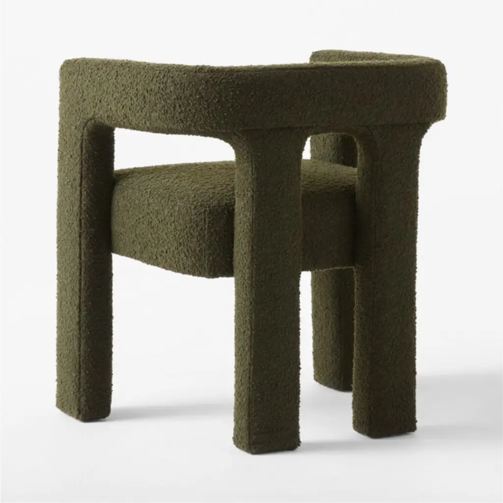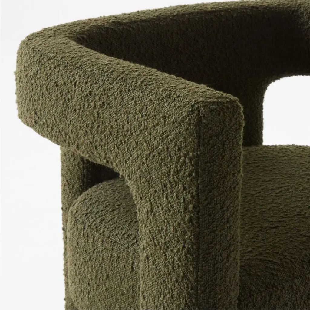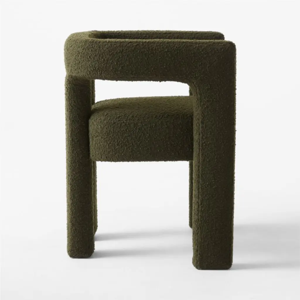 Green boucle dining armchair by Caleb Zipperer brings lounge to the table. Architectural in profile and plush all around, floating seat sits deep with a rounded cutout back for extra comfort. CB2 exclusive.