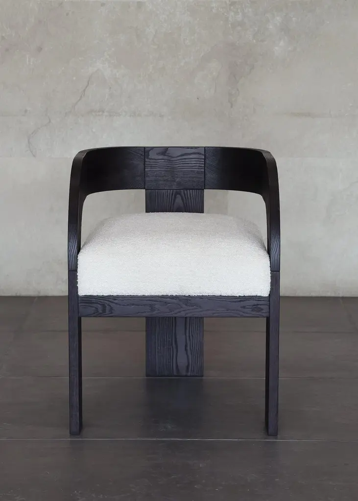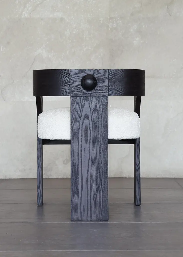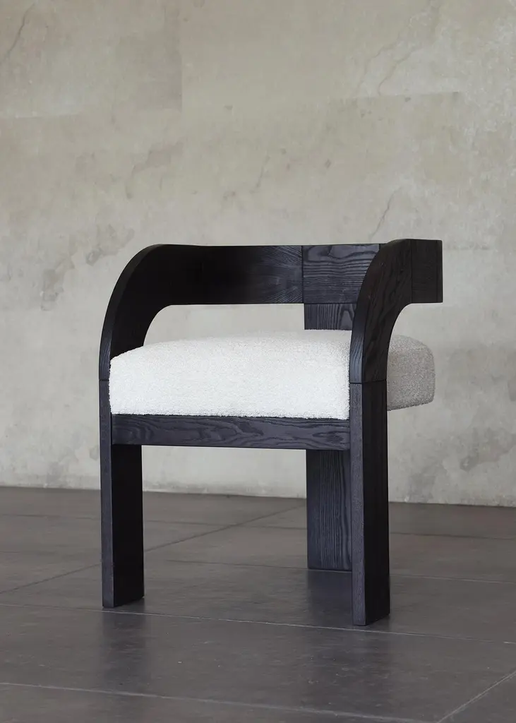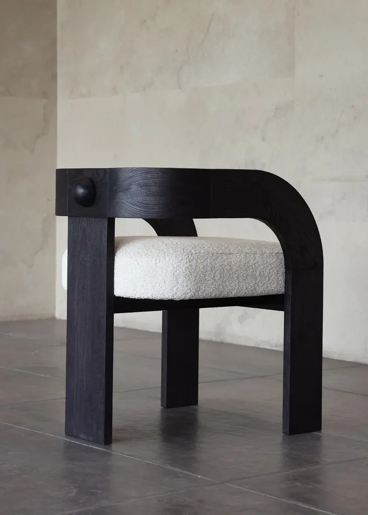 - 22" width x 26" depth x 28.25" height x 23.50" seat depth x 21" seat height- Upholstered in our Still Boucle in Soft White- Ebony Oak frameThis chair will cause excessive sophistication and refinement in your dining space. Prolonged use may lead to an excessive number of dinner parties, increased wine consumption, and a sudden urge to use words like 'boucle' in everyday conversation.But don't worry, it's worth it. The Stud Dining Chair is the ultimate wingman for your dinner table, bringing a touch of elegance and a whole lot of style to any meal. Its rich Ebony Oak frame is like the George Clooney of woods - dark, handsome, and impossible to resist. And the Cream Boucle fabric? That's like the perfect accessory - soft, inviting, and guaranteed to make you feel like a million bucks.So go ahead, treat yourself to a Stud (or 8!). Your dinner guests will thank you, your kitchen will thank you, and your inner interior designer will do the happy dance. Just don't say we didn't warn you..."