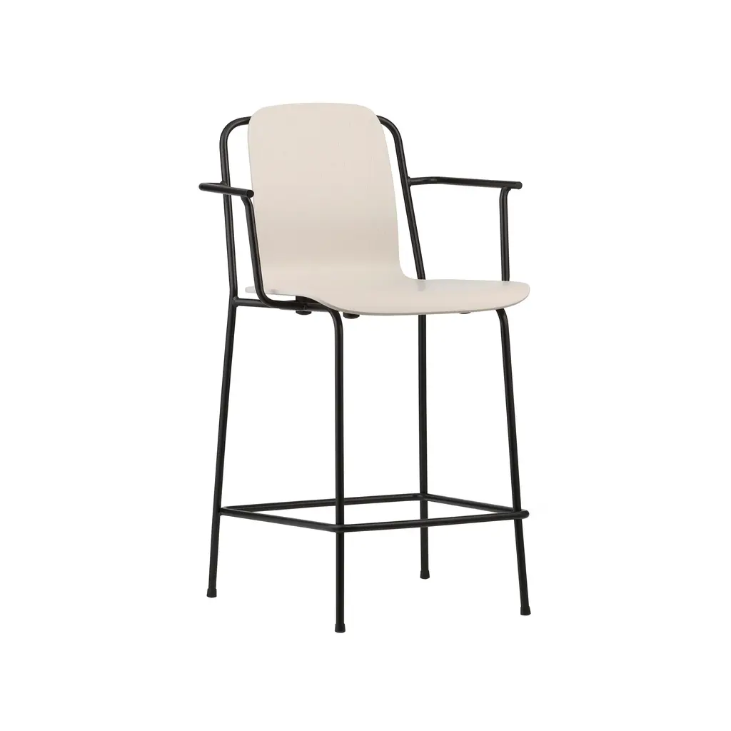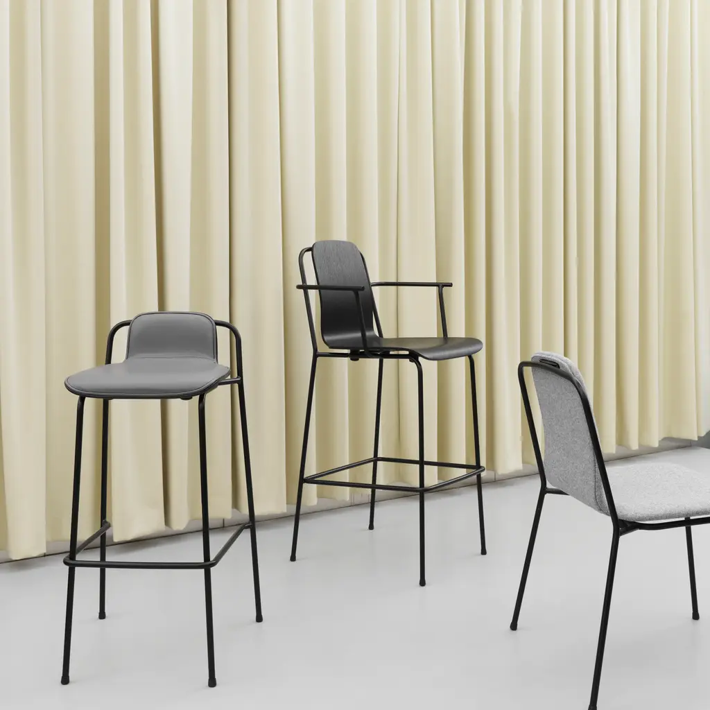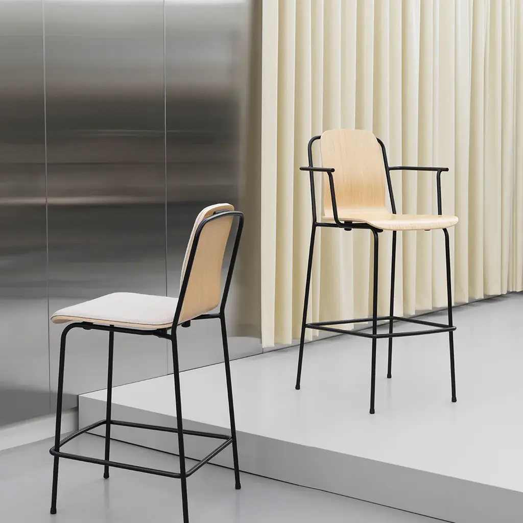 Normann Copenhagen adds a comfortable armchair barstool to Studio seating with its signature tubular look. Available in a choice of bar or counter heights, designer Simon Legald stool is stackable and the frame makes it easy to grab hold of and move around. Suggested by the industrial style of old French factory chairs, its black powder-coated steel construction comes with a choice of natural oak or earthy lacquer shades for the molded wood-veneer seat.