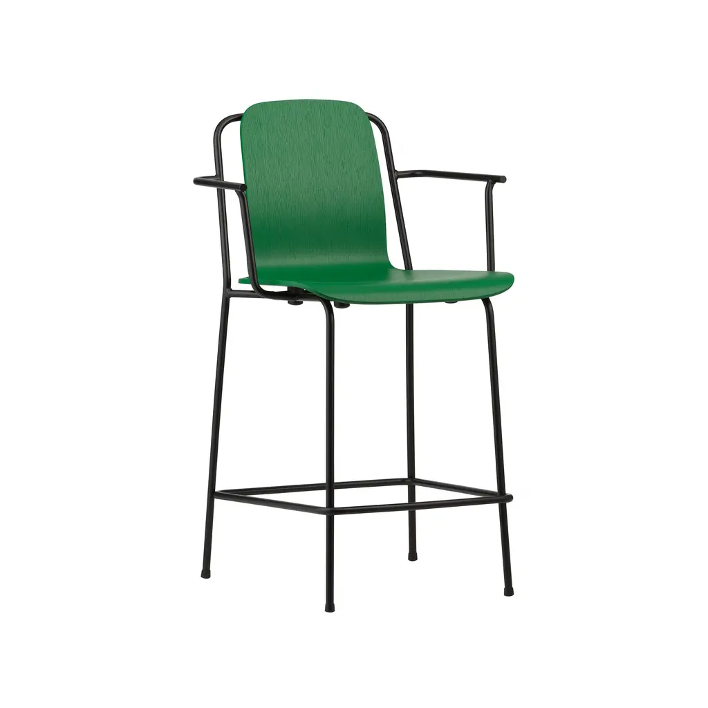 Normann Copenhagen adds a comfortable armchair barstool to Studio seating with its signature tubular look. Available in a choice of bar or counter heights, designer Simon Legald stool is stackable and the frame makes it easy to grab hold of and move around. Suggested by the industrial style of old French factory chairs, its black powder-coated steel construction comes with a choice of natural oak or earthy lacquer shades for the molded wood-veneer seat.