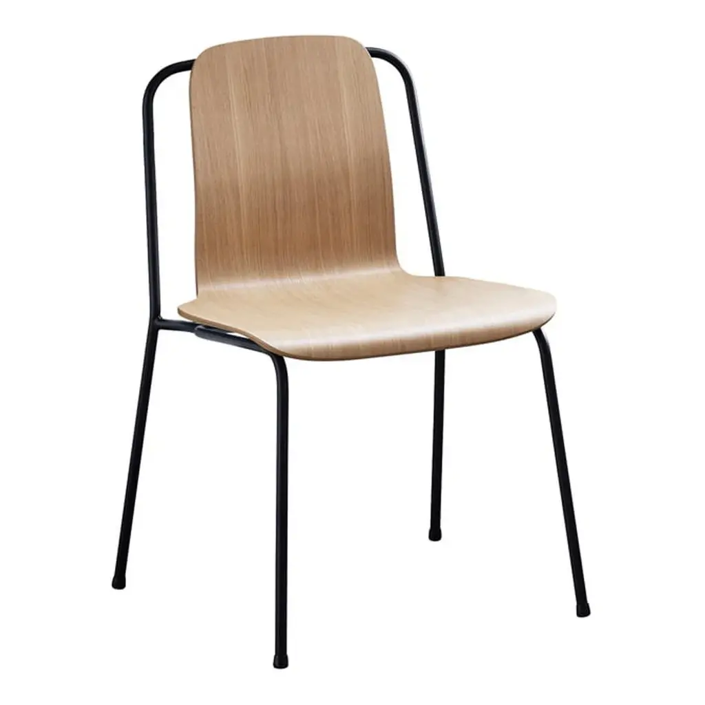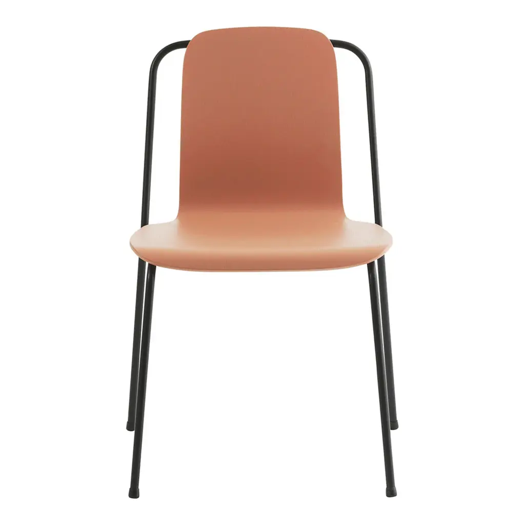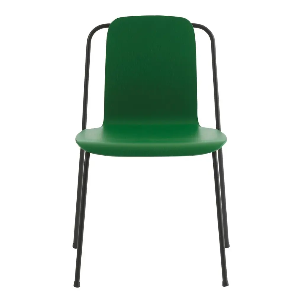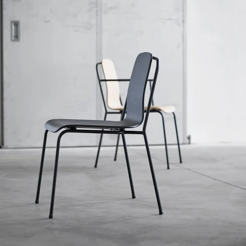 There is something virtually graphic about the way the slender steel frame grows out below the Studio chair's seat and back, framing the molded shell in an airy design. The flowing lines stand out in an eye-catching silhouette, like a line drawing or a pictogram, just as the empty spaces between the frame and the back act to define the shape. The simple construction in veneer and steel tubing directs one's thoughts towards older French factory chairs, giving Studio its industrial notes. A design that attracts attention, but glows with pure simplicity. The multi-purpose Studio chair series is designed for use in both domestic and public spaces. The series includes chairs, armchairs and barstools in two heights. All models are stackable, making the range suitable for restaurants and educational facilities with the need for transformable areas. The steel frame makes it easy to grab hold of the chairs and move them around as required.