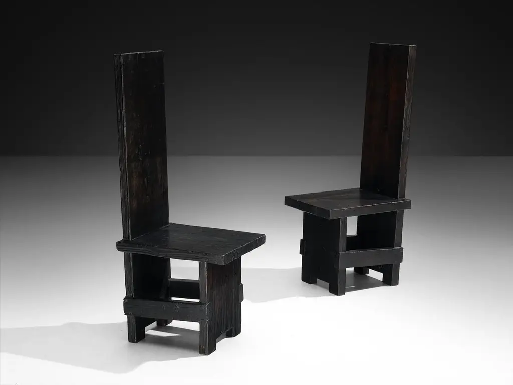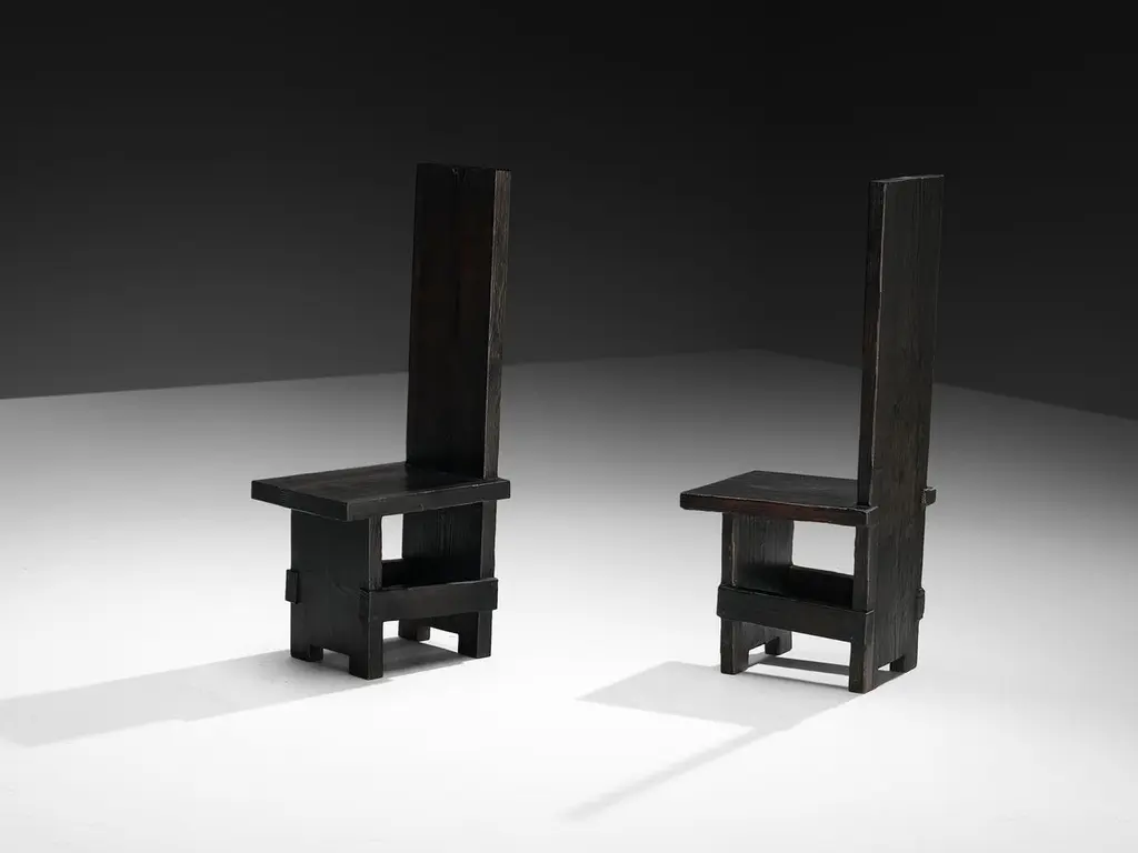 Studio D Italy, side chairs, lacquered pine, 1970sThis eye-catching brutalist chair captures the essence of raw design. Crafted by Studio D in Italy during the 1970s, it exemplifies the rugged aesthetic and of that era. The design of this piece is bold and architectural, with a high, flat back that gives it a commanding presence. The tall backrest creates a monolithic look. Straight-edged and thick, the seat and block-like legs emphasize its sturdy, geometric structure. Made from solid pine wood, the chair has been finished in a deep black, highlighting the natural grain and texture of the wood while adding a sense of boldness to its form. Its robust structure and angular lines are a hallmark of the brutalist movement.Studio D, the Italian manufacturer behind this chair, was also known for producing designs by the renowned designer Edoardo Landi during this period. With its austere silhouette and organic materials, this chair is both a functional object and a sculptural statement.The listed price is per item.