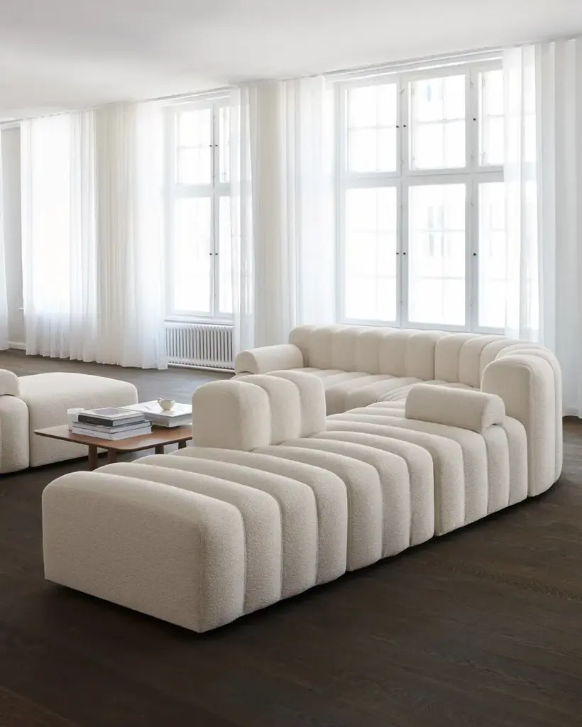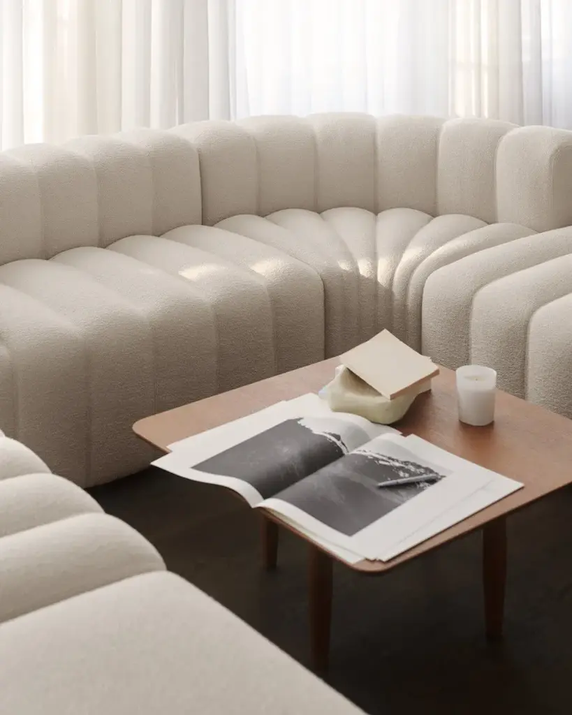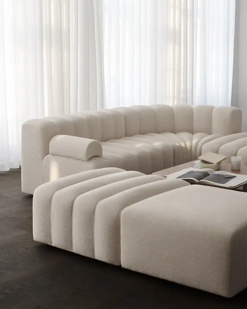 Studio is a fabric armchair.A tribute to a timeless era of the 70s and its expressive aesthetics. Featuring a versatile but simple system of modules, appearing in limitless options to form numerous settings, shapes and styles to adhere to all types of environments, whether for a small living setting or spacious public site, Studio collection is defined by its bold fluted upholstery characteristics inspired by late 70s sofa styles, refined in a contemporary way - giving the series a unique identity. Each module of Studio articulates soft and welcoming lines ideally suited for living, socialising and relaxing where one can feel totally at ease. The armrest cushion is loose and can be moved and repositioned across the series, balancing the fluted upholstery. A plywood structure with elastic belts & foam. 360-degree finish, each module can be a stand-alone. Modules can be reversed to create a two-sided sofa. Click-Link system connects modules. Soft foam mix for ultimate comfort. Available in a wide variety of high-quality eco-fabrics or leather from Sørensen Leather. Made in Italy.